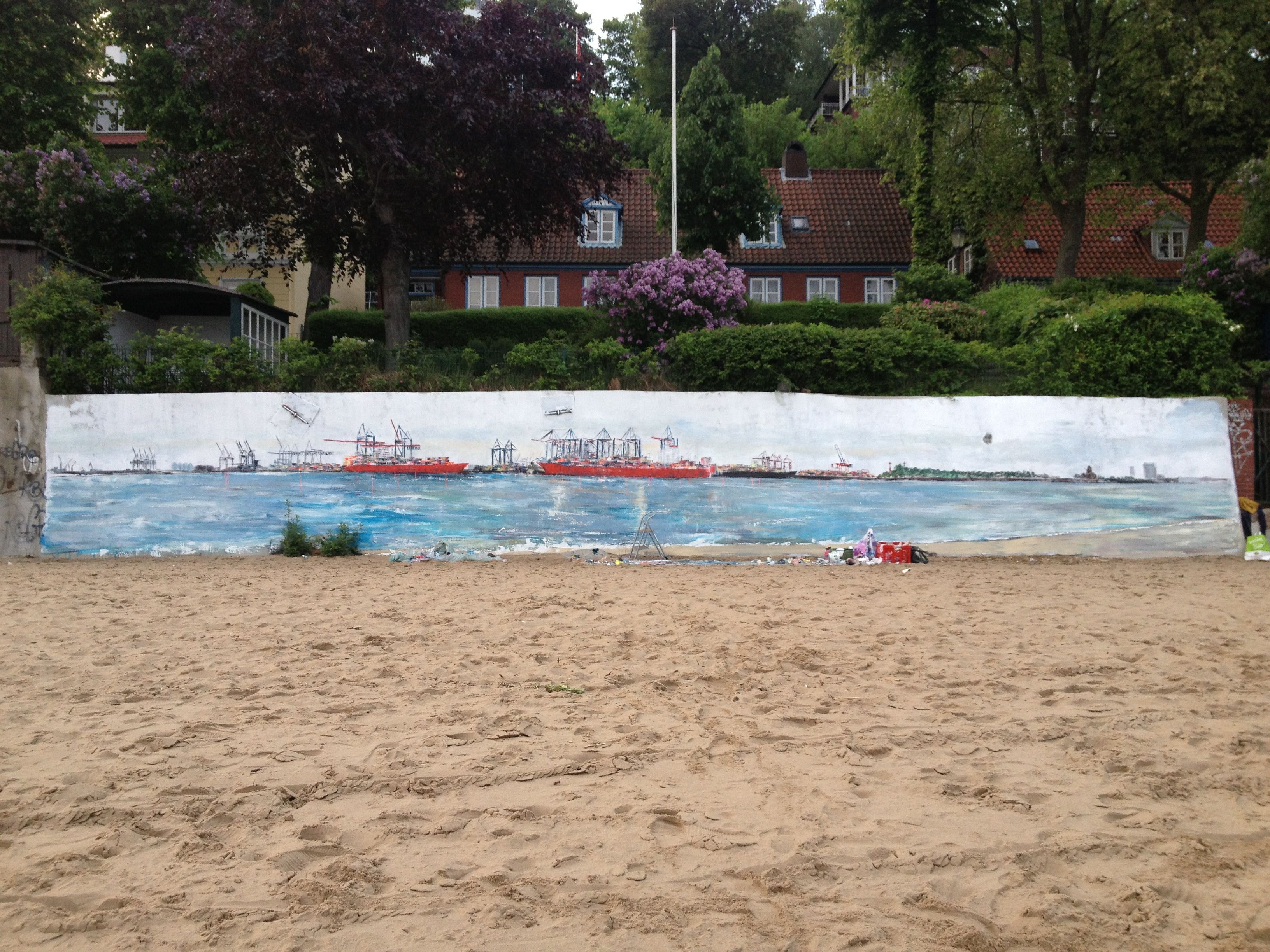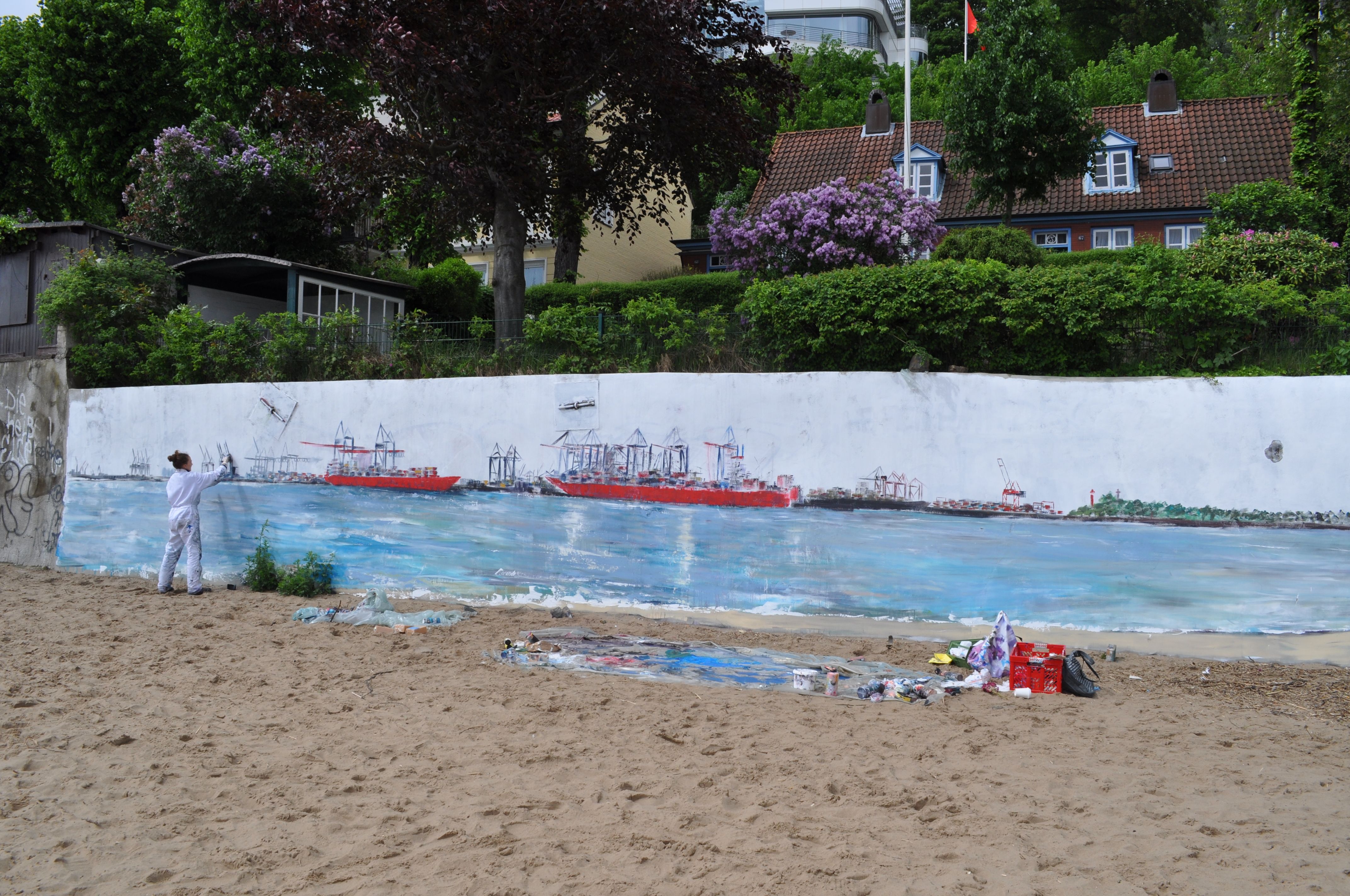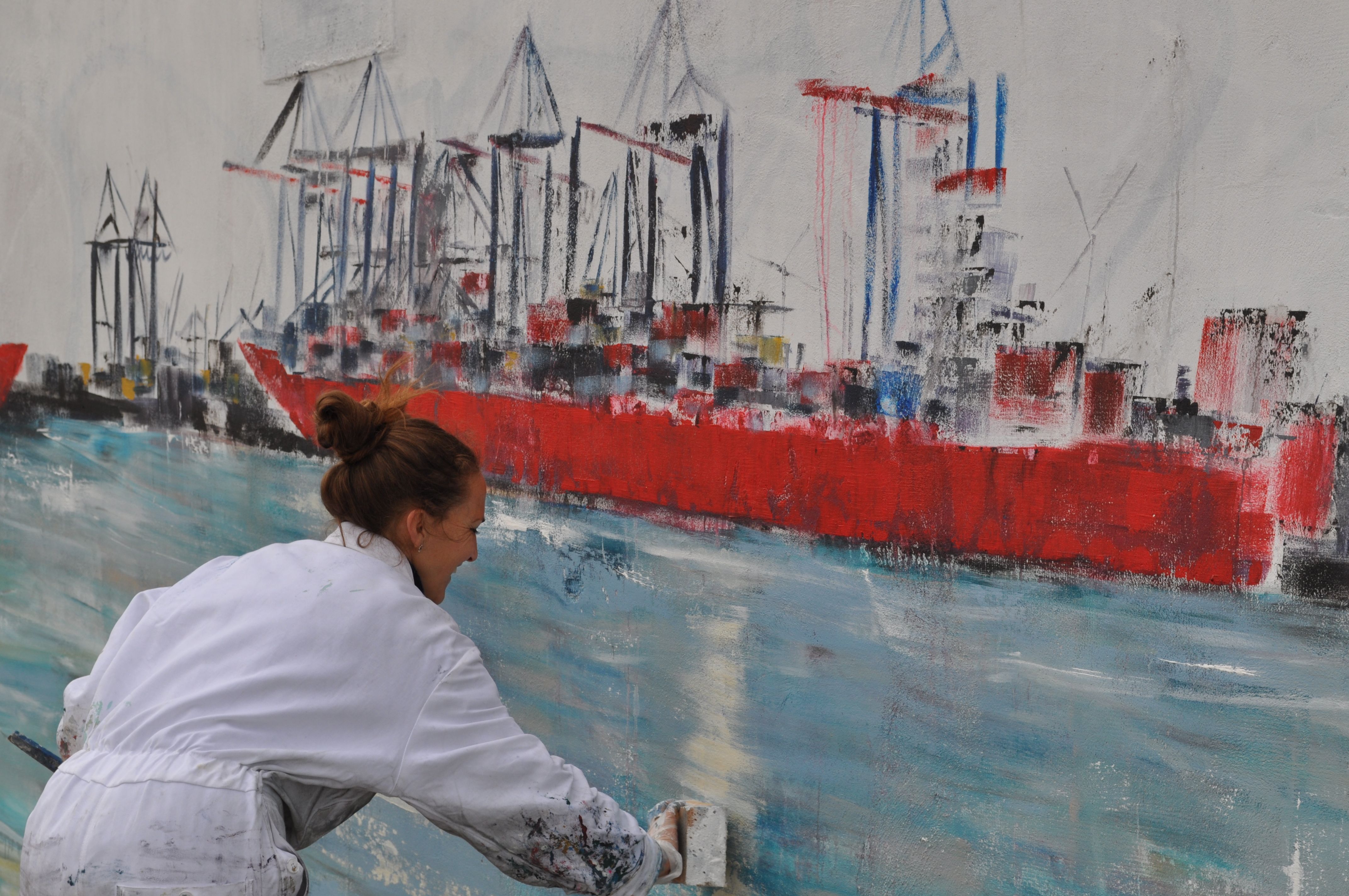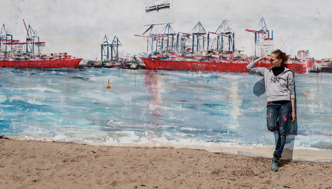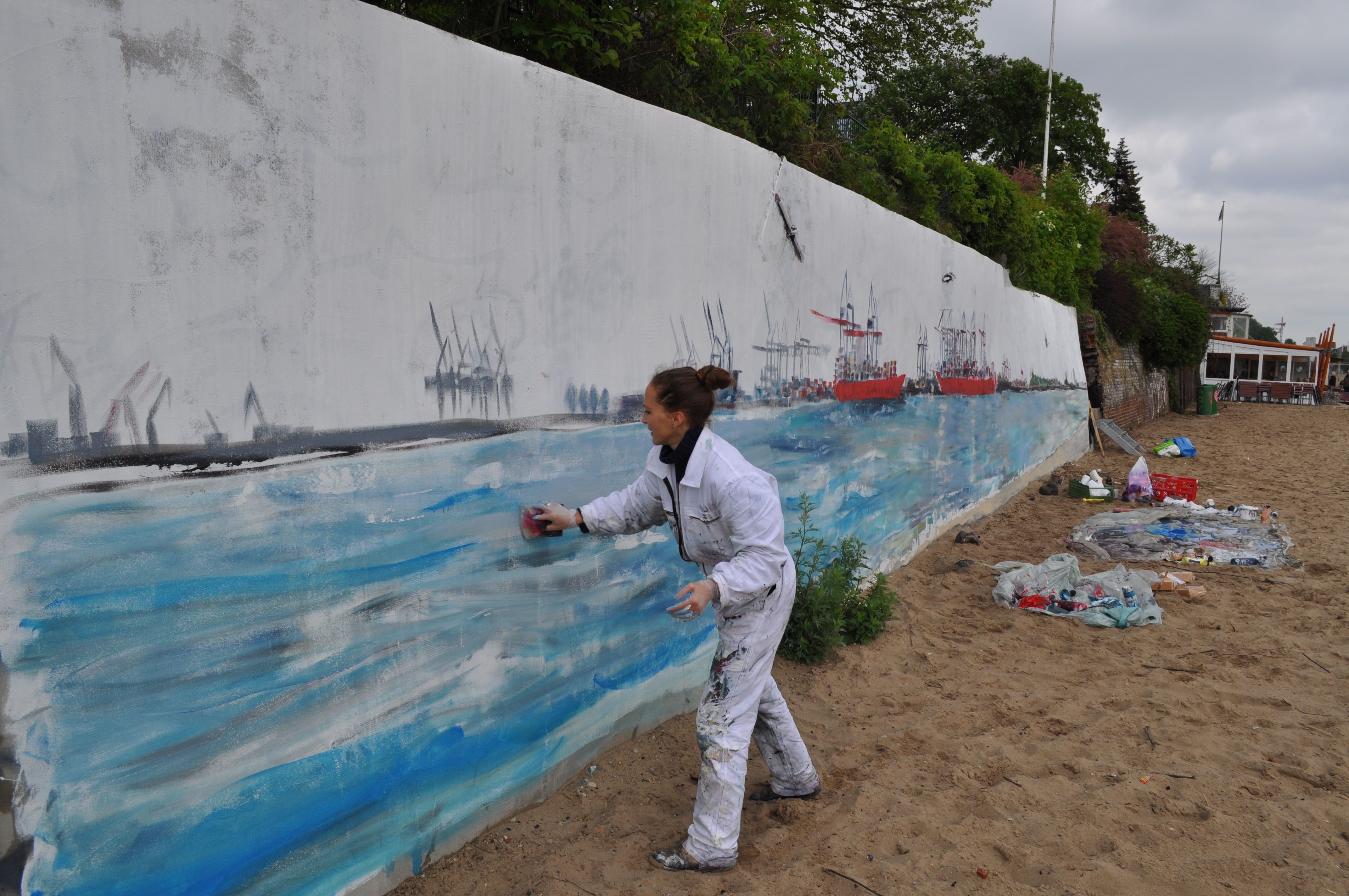 Am Donnerstag den 23.5. ab 20.30 Uhr wandel ich den Elbstrand für 2 Tage zum Freiluft-Atelier. Mit Spachtel, Zahnbürsten und bloßer Hand male ich ein 18 Meter langes Hafenbild auf die Betonmauern. Warum? weil ich endlich mal ein richtig großes Bild malen will. 18 Meter passen durch keine Tür, also öffentliche Kunst am Bau! Mein Anntrieb ist ein Hafenbild für alle zu schaffen und