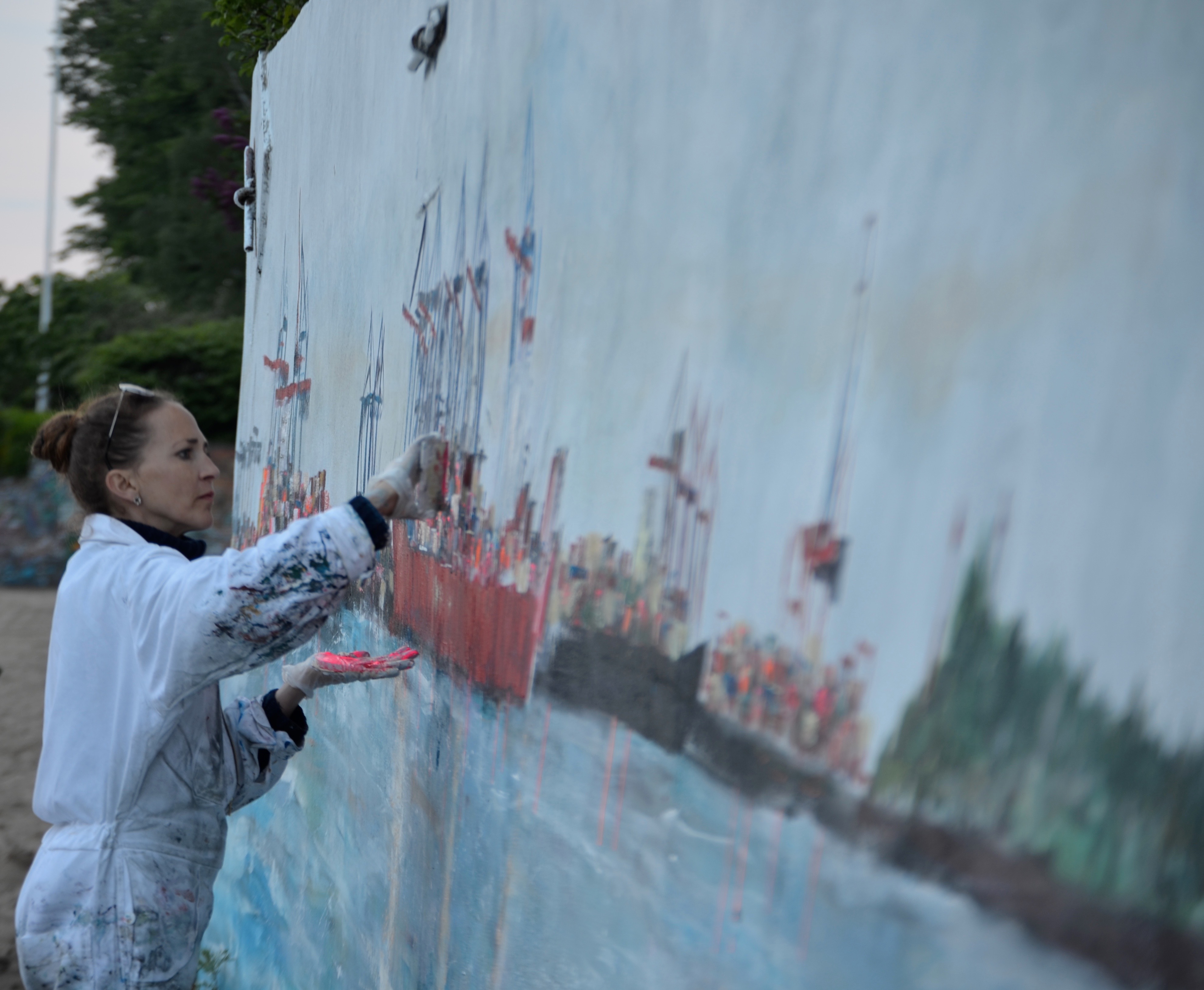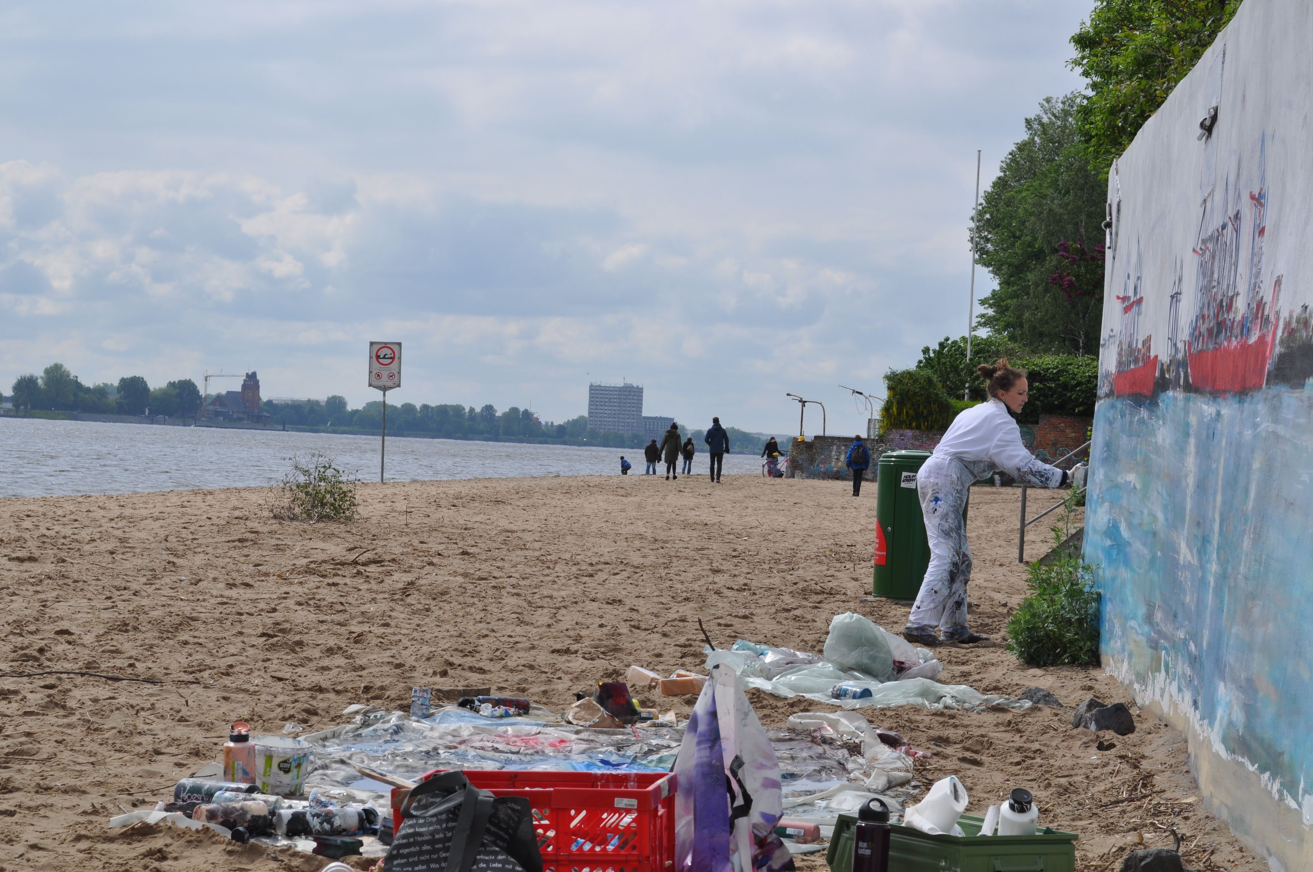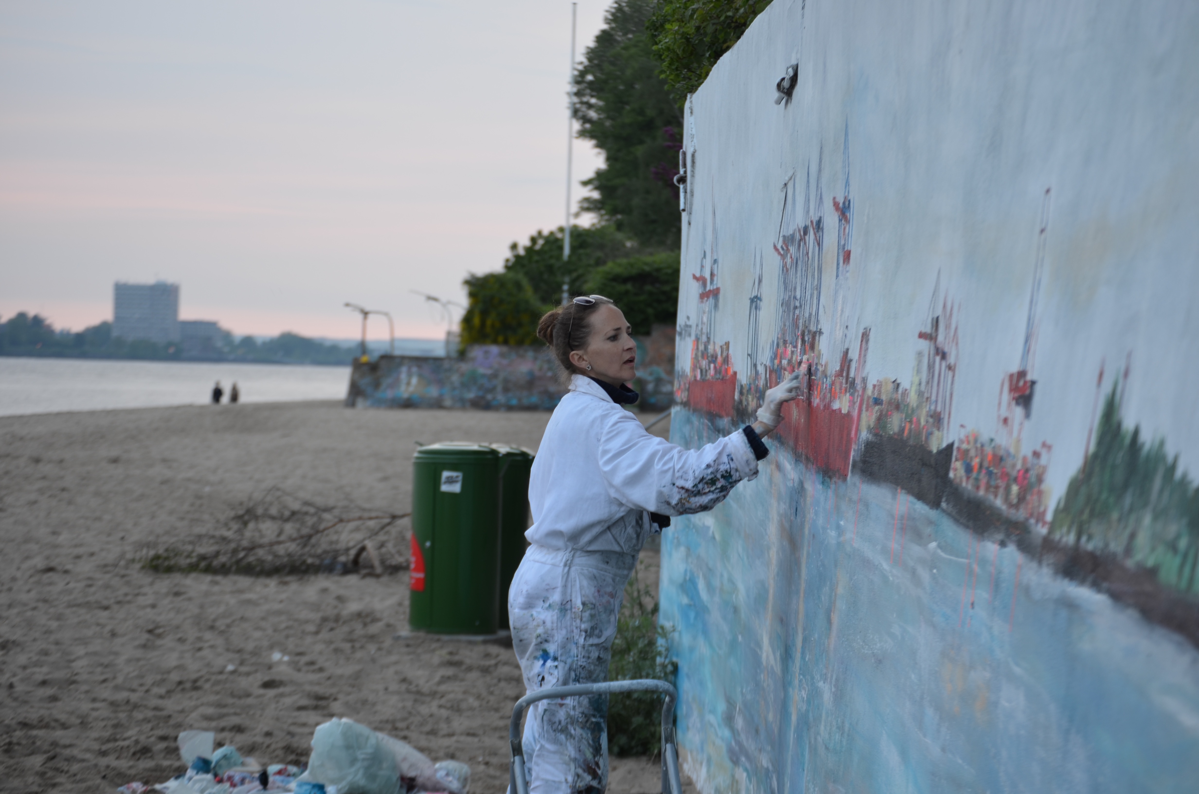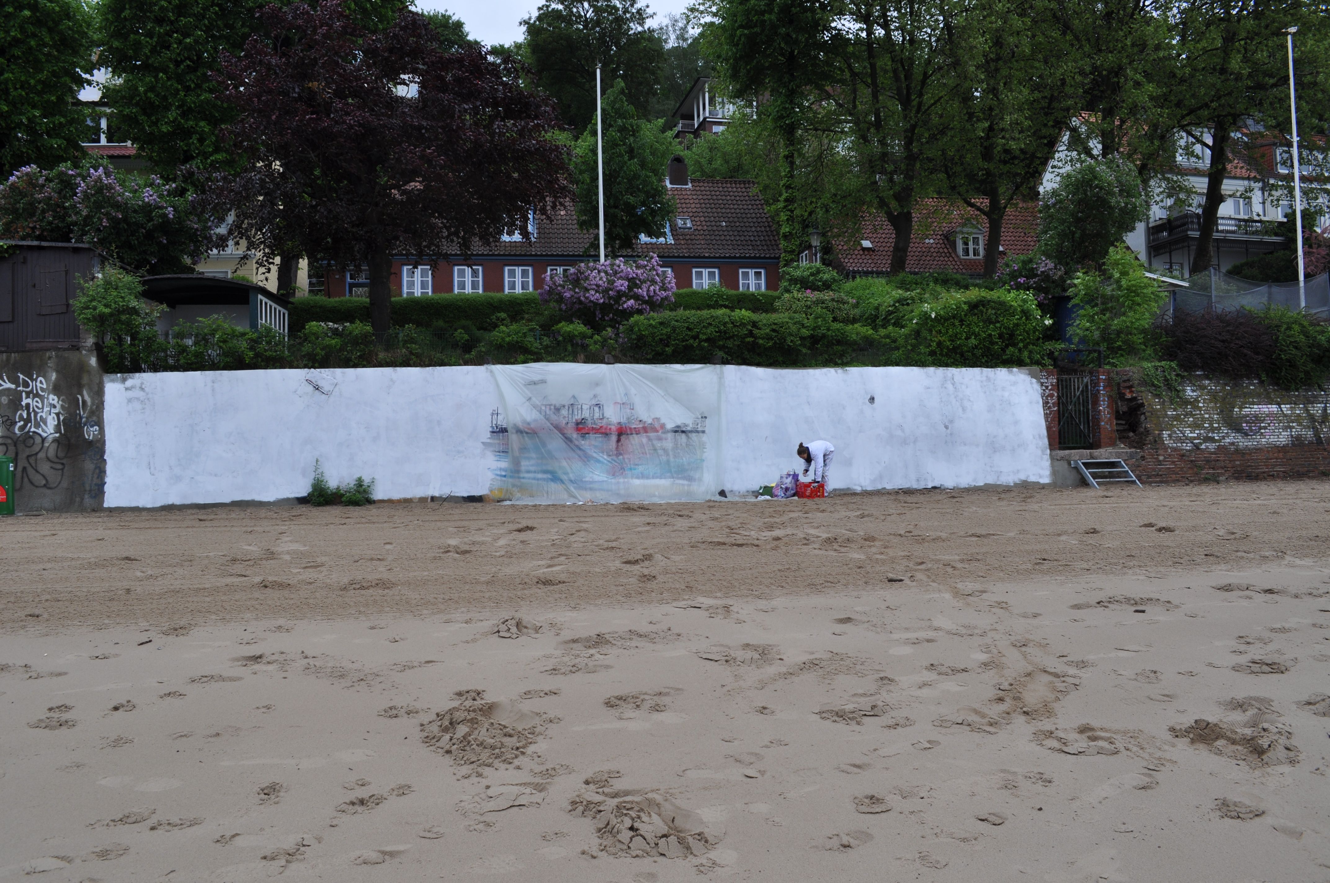 Am Donnerstag den 23.5. ab 20.30 Uhr wandel ich den Elbstrand für 2 Tage zum Freiluft-Atelier. Mit Spachtel, Zahnbürsten und bloßer Hand male ich ein 18 Meter langes Hafenbild auf die Betonmauern. Warum? weil ich endlich mal ein richtig großes Bild malen will. 18 Meter passen durch keine Tür, also öffentliche Kunst am Bau! Mein Anntrieb ist ein Hafenbild für alle zu schaffen und