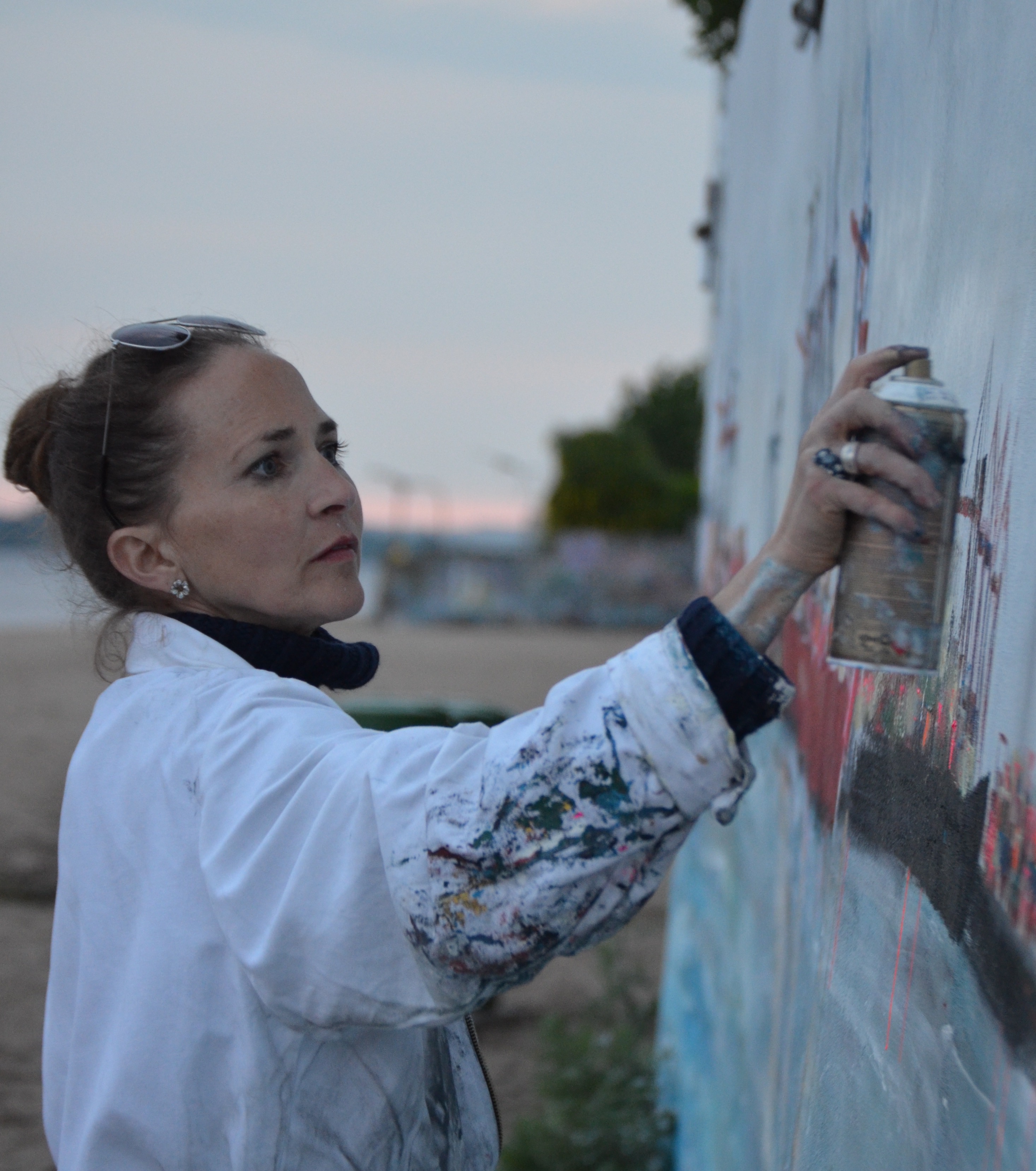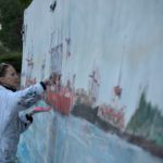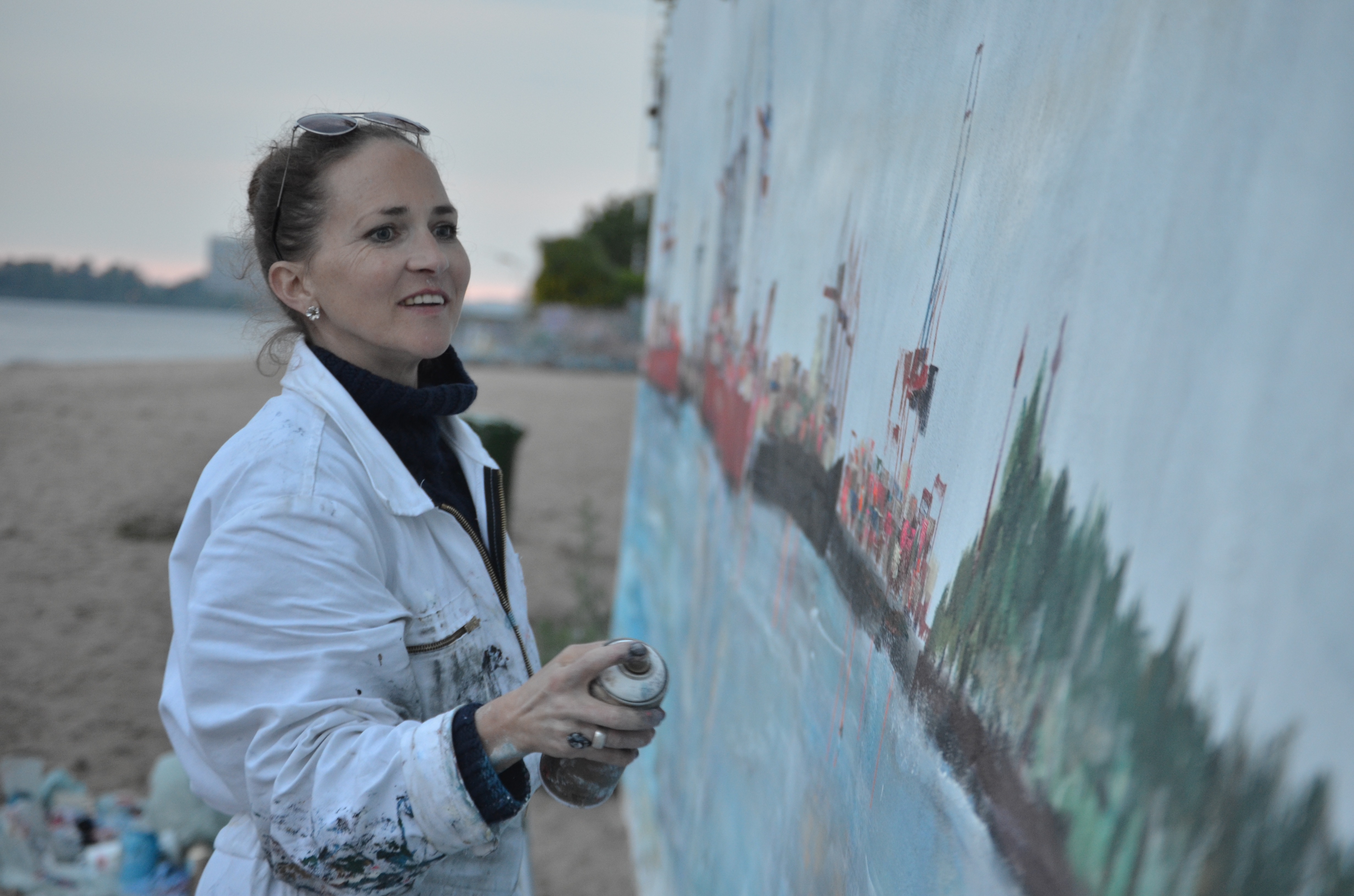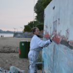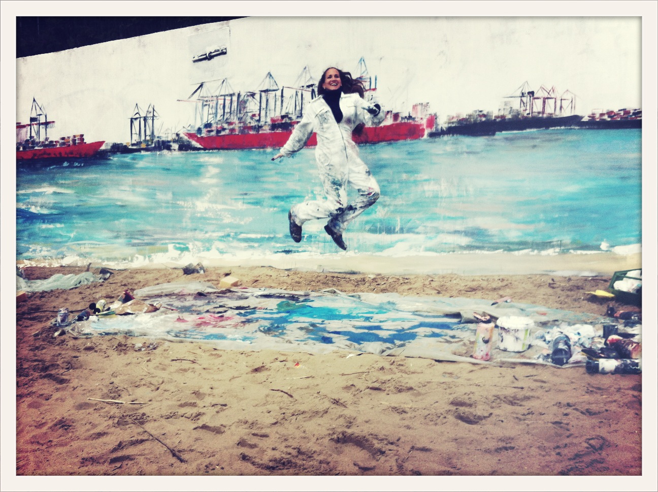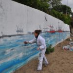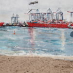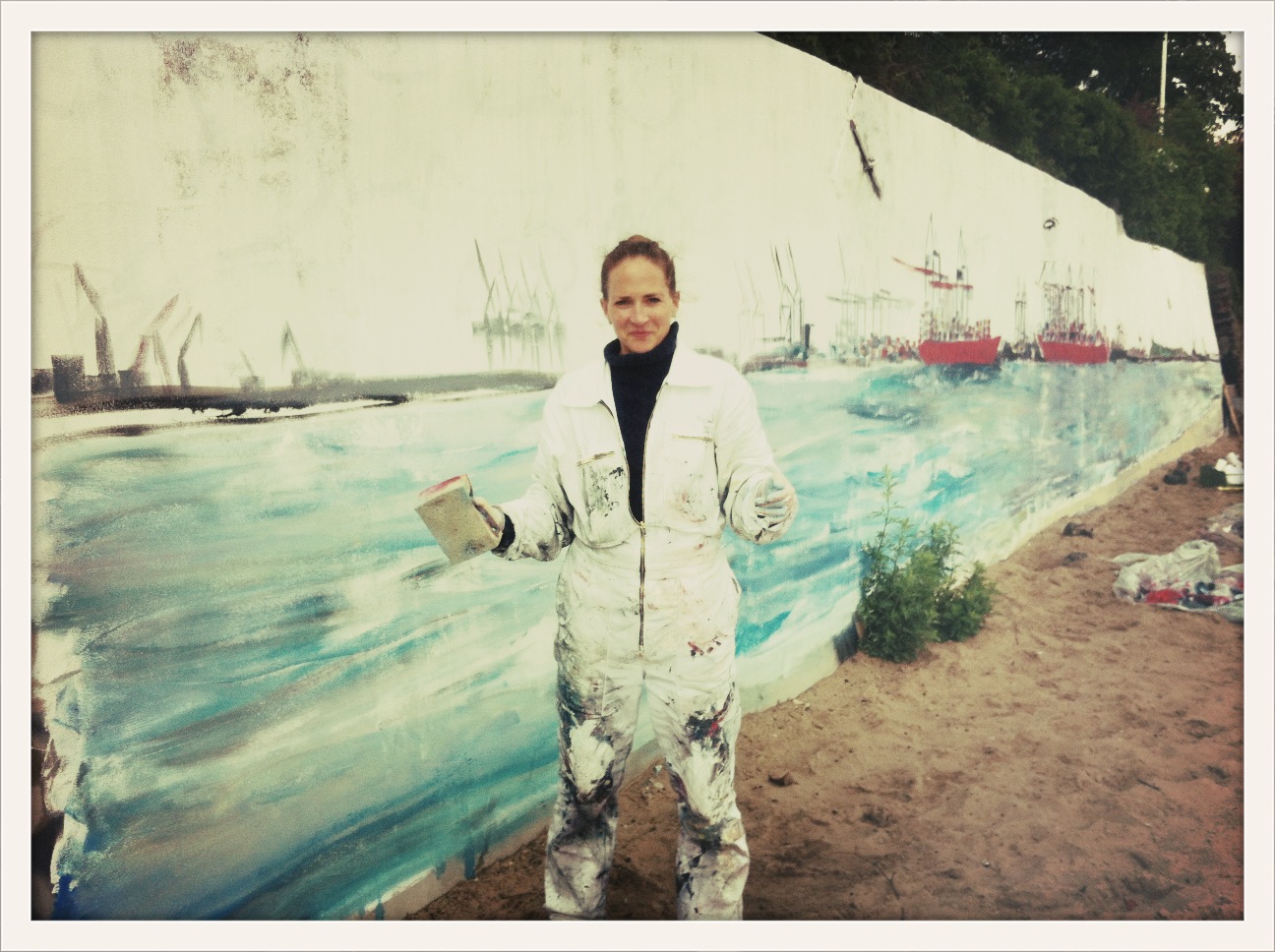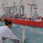 Am Donnerstag den 23.5. ab 20.30 Uhr wandel ich den Elbstrand für 2 Tage zum Freiluft-Atelier. Mit Spachtel, Zahnbürsten und bloßer Hand male ich ein 18 Meter langes Hafenbild auf die Betonmauern. Warum? weil ich endlich mal ein richtig großes Bild malen will. 18 Meter passen durch keine Tür, also öffentliche Kunst am Bau! Mein Anntrieb ist ein Hafenbild für alle zu schaffen und