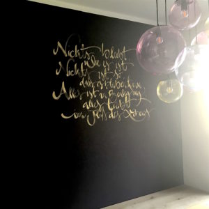 Heute habe ich ein Gedicht direkt auf die Wand kalligraphiert. Goldfarbe auf purplefarbenem Untergrund