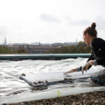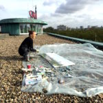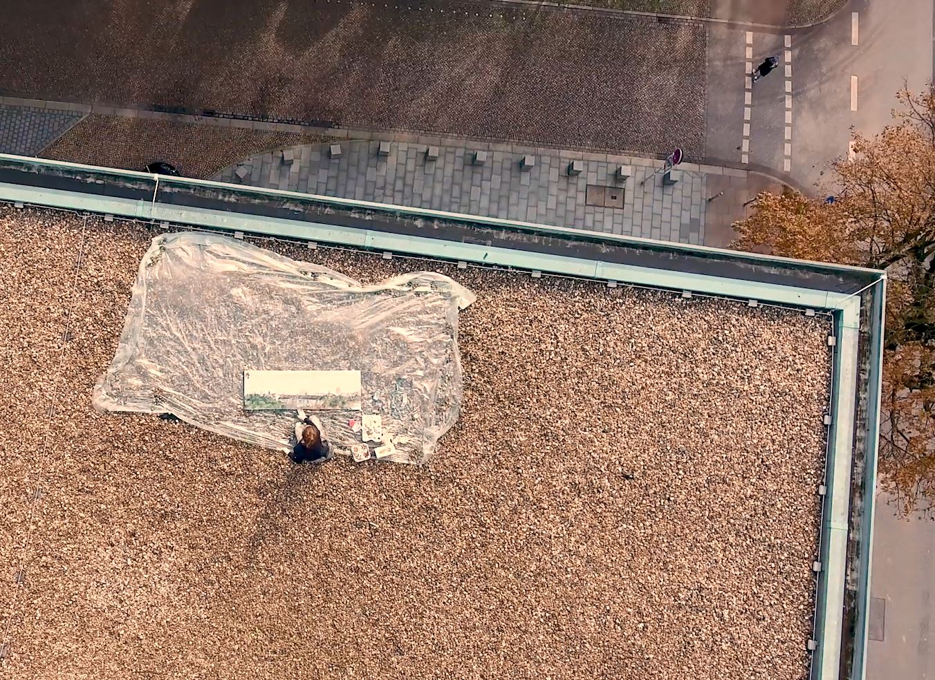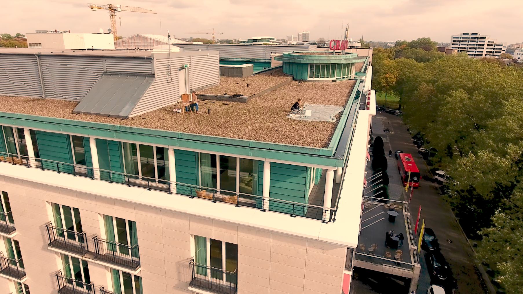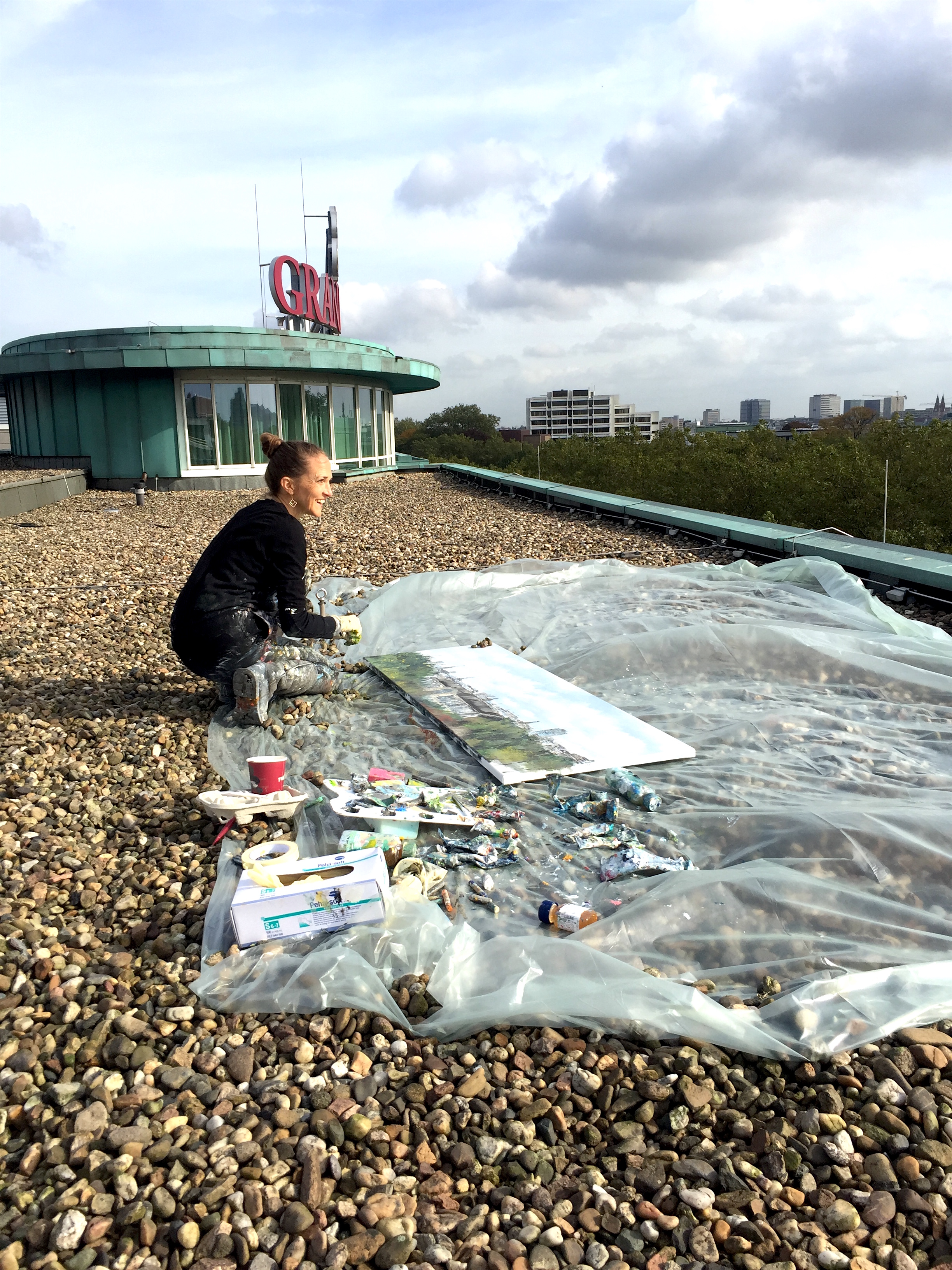 Für unsere Gemeinschaftsaussellung VON OBEN malen Peter Witt und ich unser letztes Bild auf dem Dach des Grand Elysée Hotels. Höher als wir ist nur die Drohne, die die Elbfabrik in den Himmel schickt.
