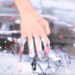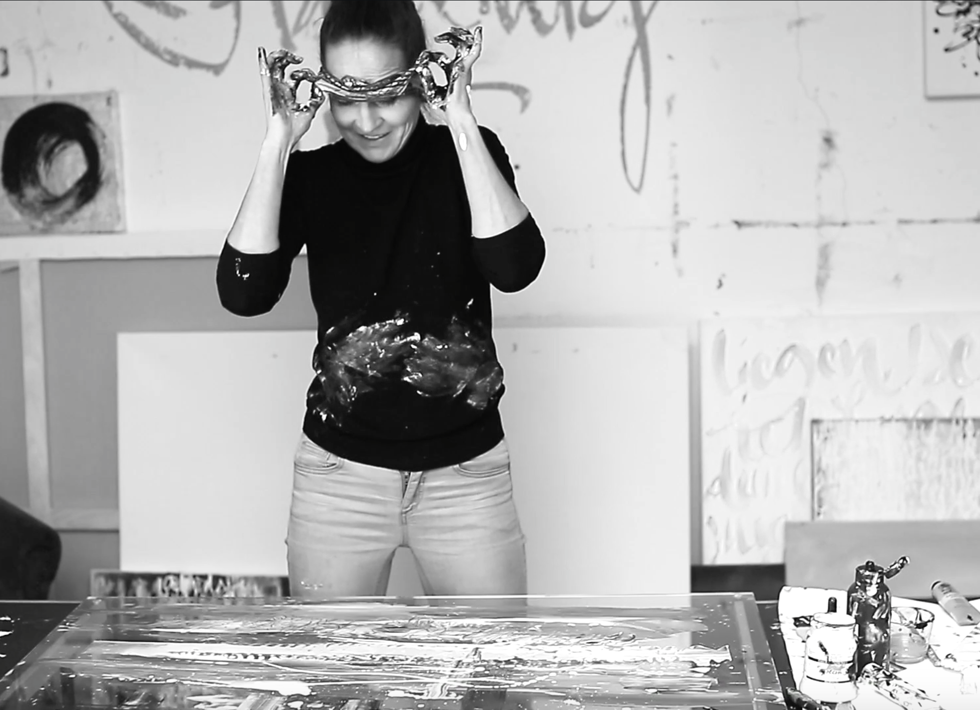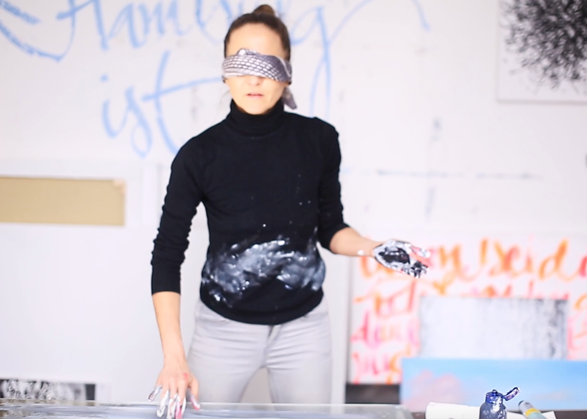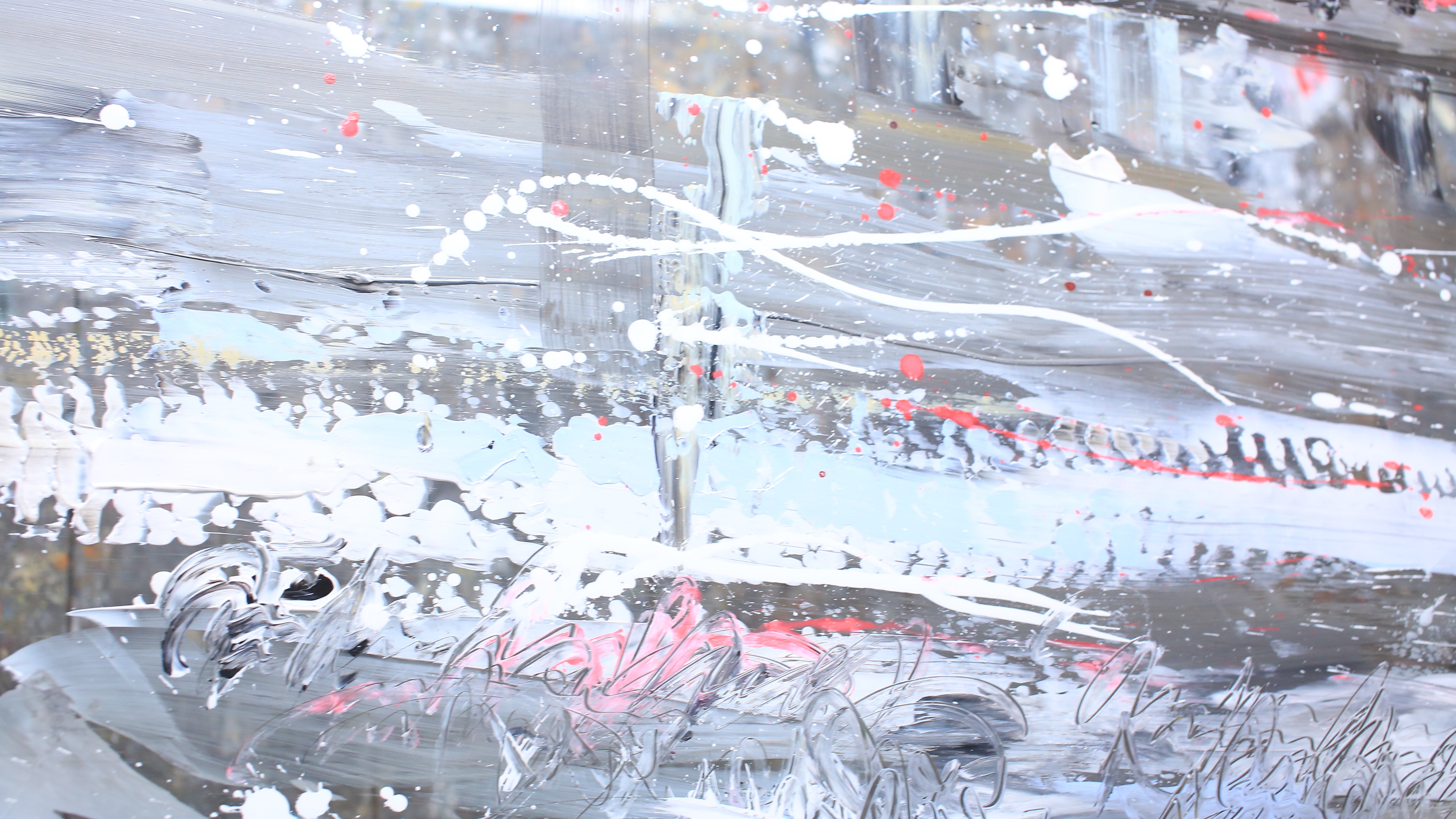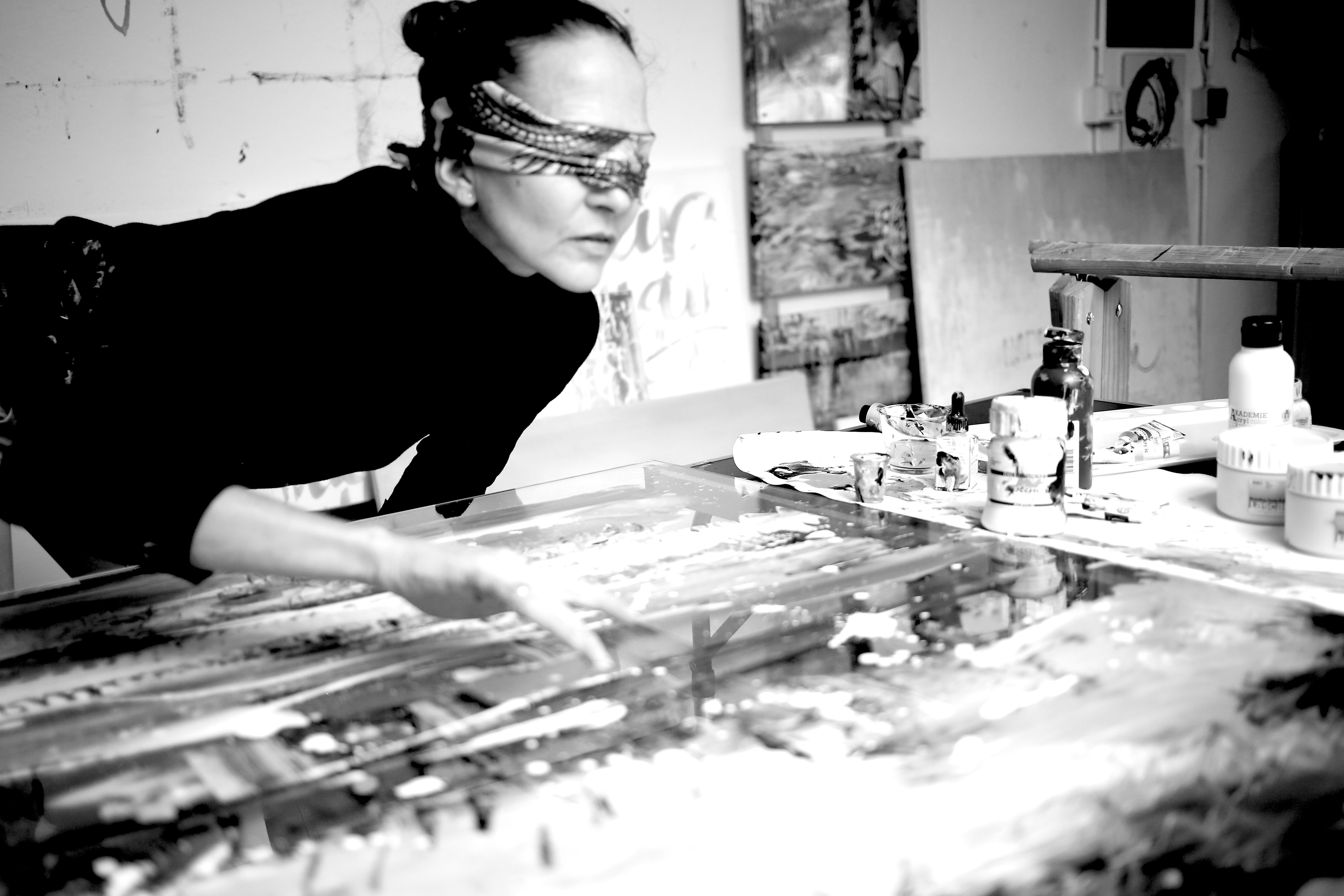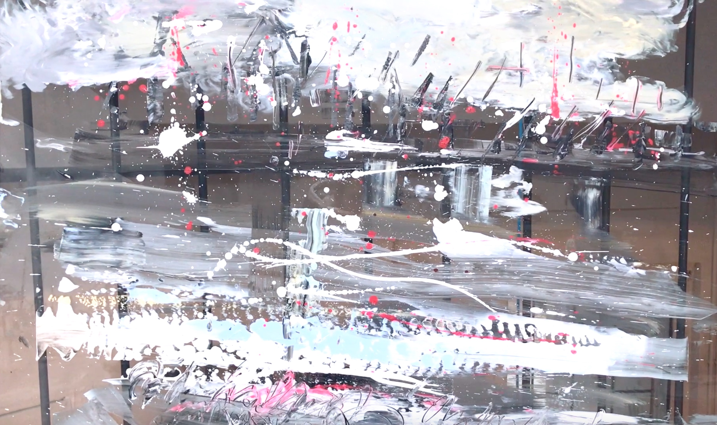 Ich war gespannt, ob ich den Hamburger Hafen inzwischen blind malen kann.. Gestern probierte ich es aus. Ohne zu sehen, malte ich das Bild fühlend und ohne Handschuhe, um intensiver die Farbe zu spüren. Ein Experiment auf Glas. ( Foto: Ronny Zeisberg )