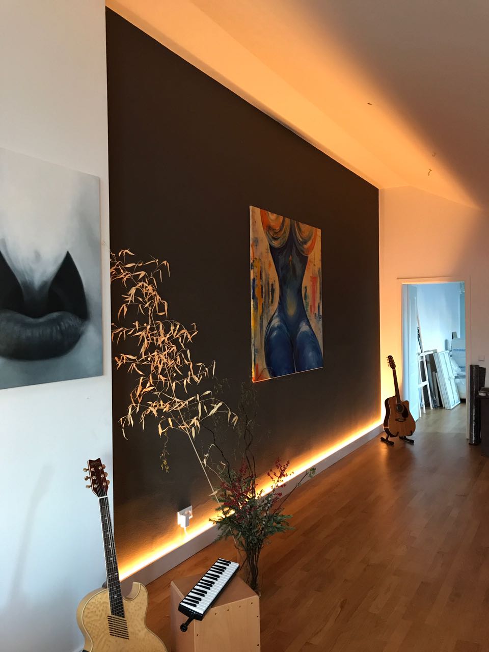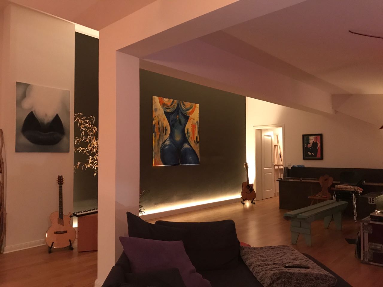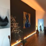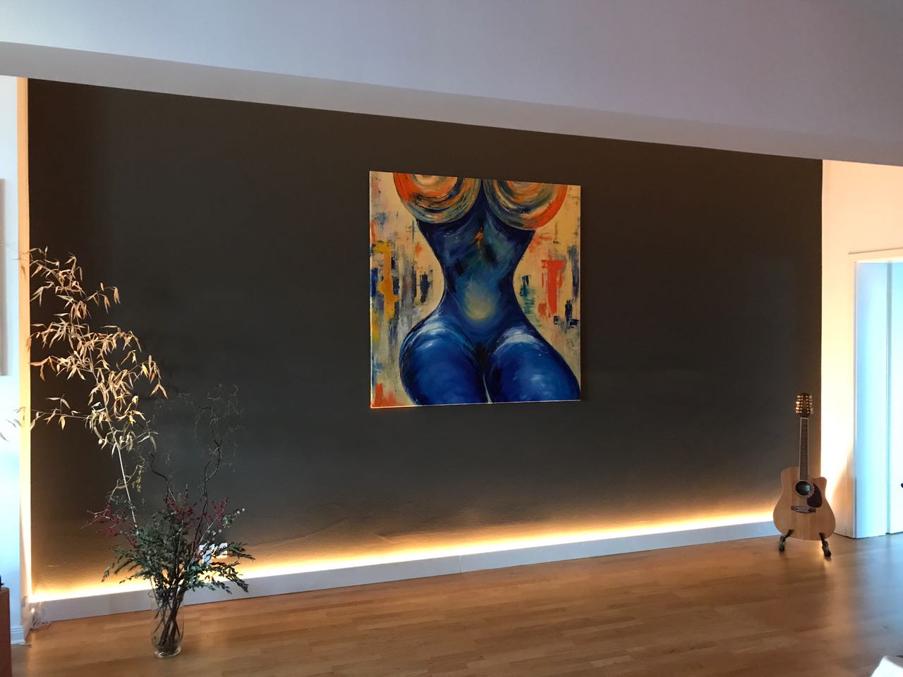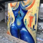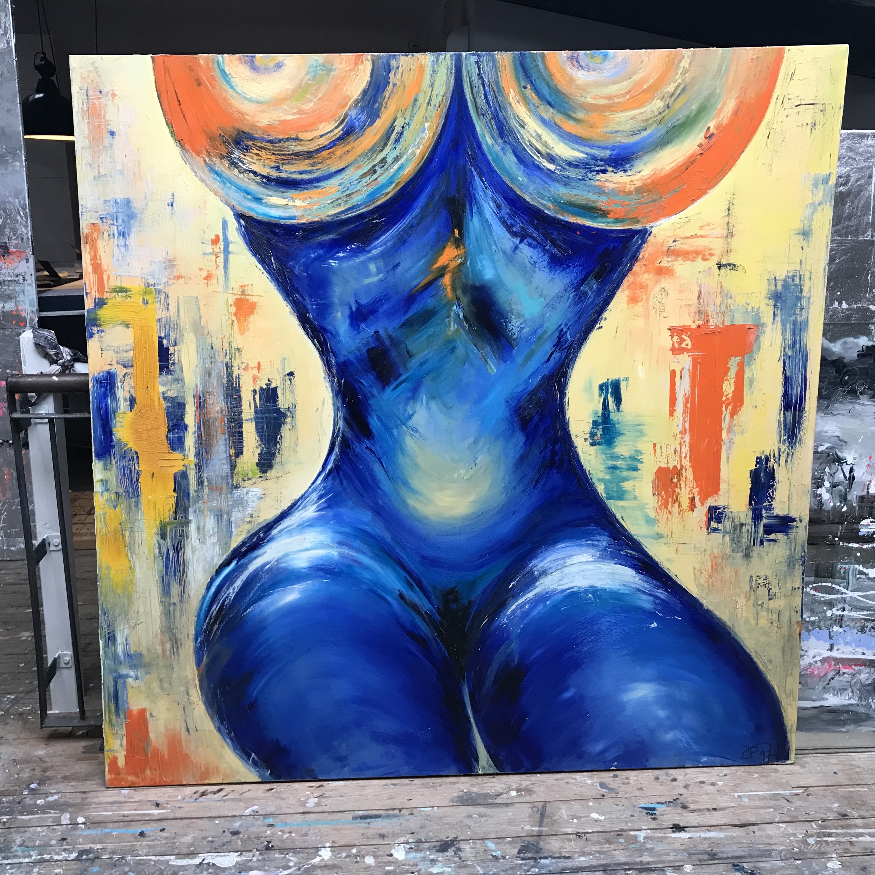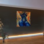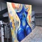 Vor 21 Jahren habe ich DIE MAGISCHE FRAU gemalt. 150 cm x 150 cm, Öl auf Leinwand. Damals auch schon ausschließlich mit den Händen. Wenn man sich von links nach rechts um die Frau bewegt, dann folgen einem ihre Beine. Sie sitzt stets zu einem gewendet. Heute habe ich sie nach Berlin ziehen lassen. Mein lieber Schulfreund hat 21 Jahre auf dieses Bild gewartet. Ab nun wird es bei ihm in seinem Loft über den Dächern von Neukölln von allen Seiten zu betrachten sein…