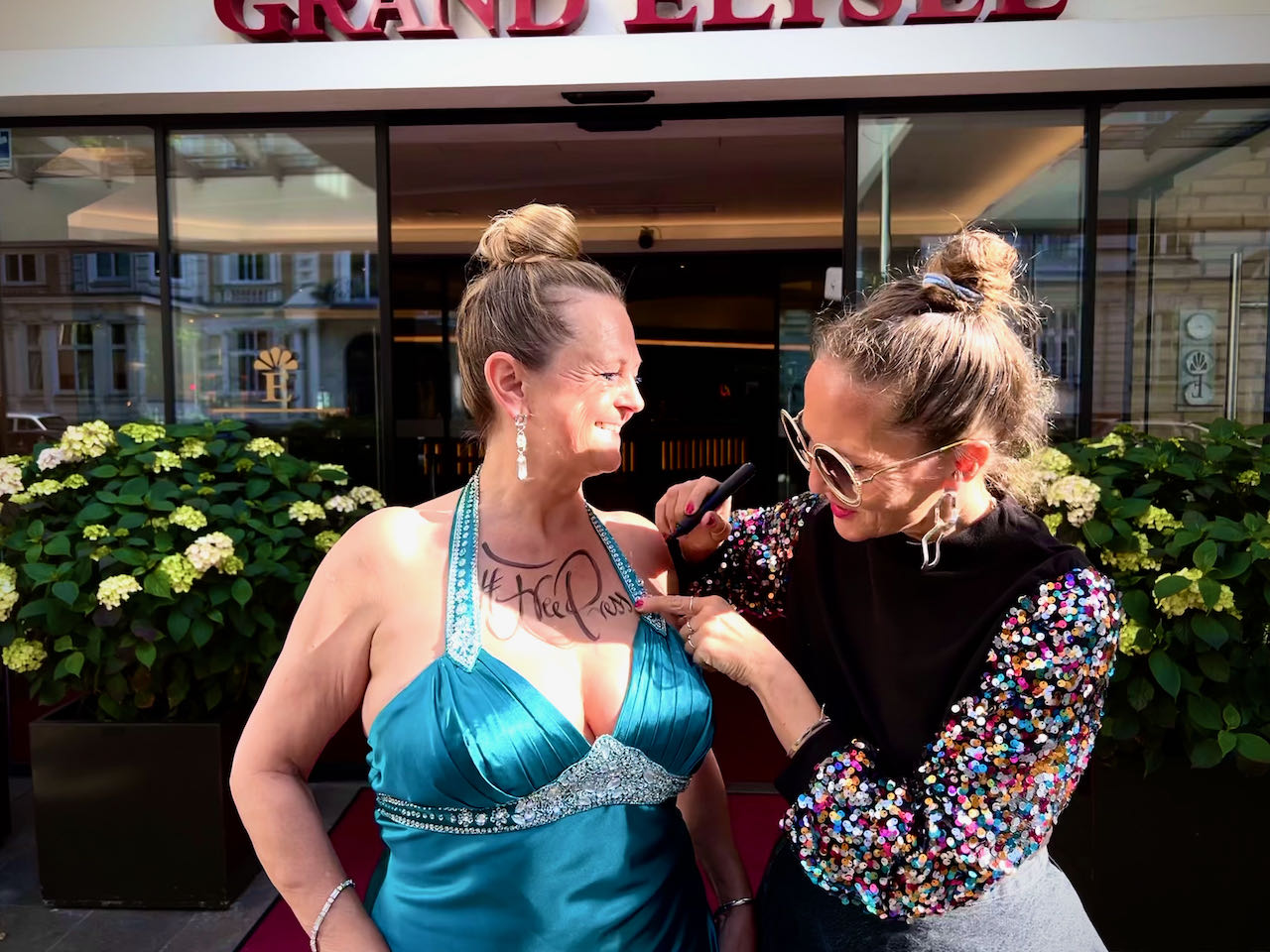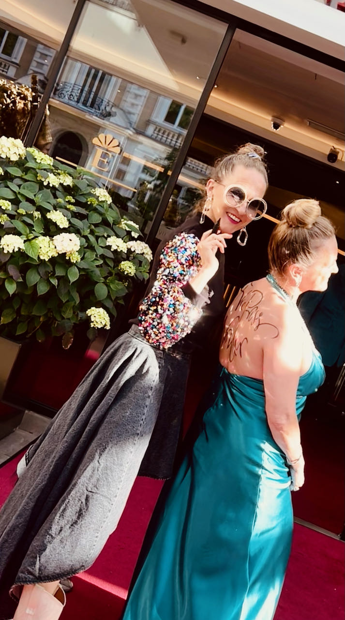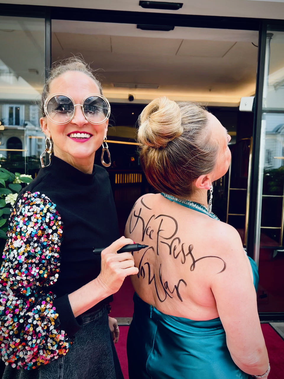 Marina Friedt – Vorsitzende des Deutschen Journalisten Verbands Nord – übergibt beim Hamburger Presseball den Erich Klabunde Preis in einem special outfit. Auf dem Roten Teppich des Hotel Grand Elysée schrieb ich ihr #FreePress und #NoWar auf Dekoltée und Rücken, was an diesem Abend als Highlight gewürdigt wurde.