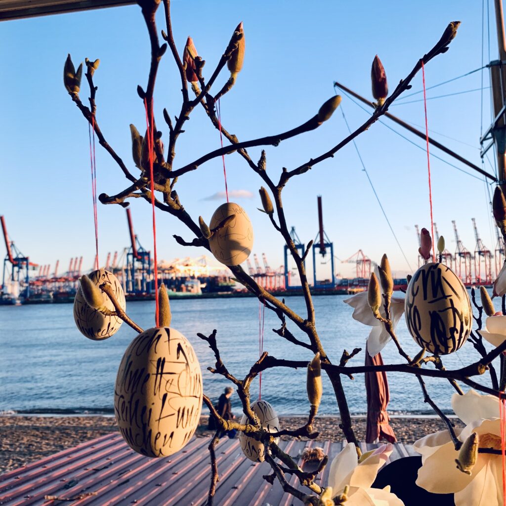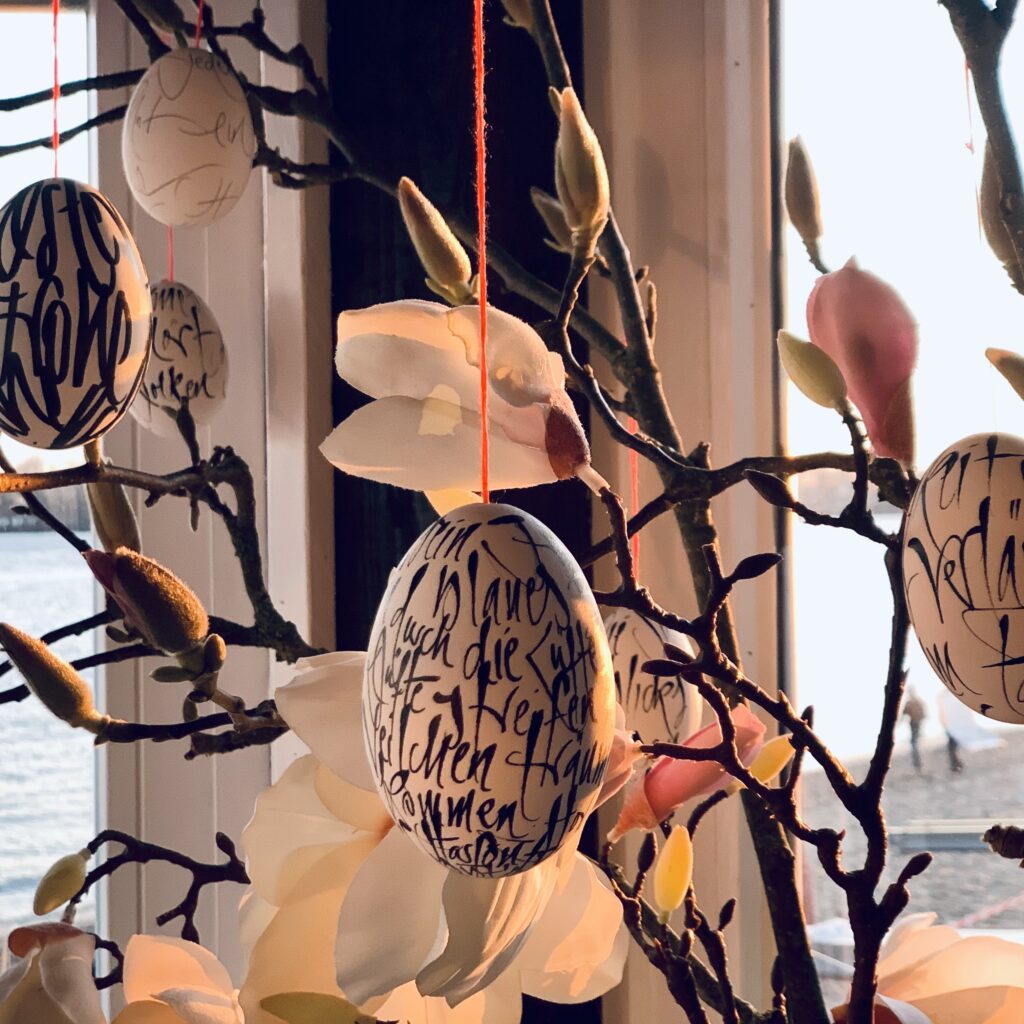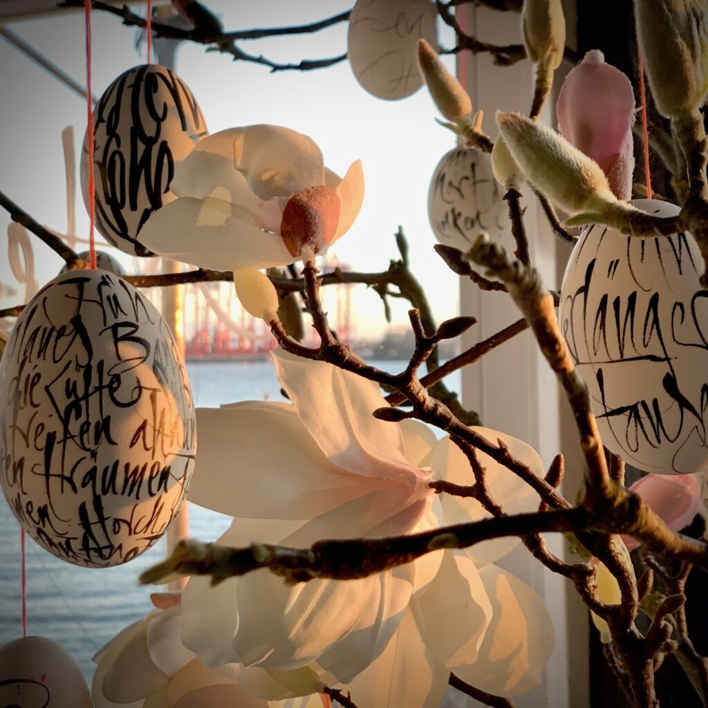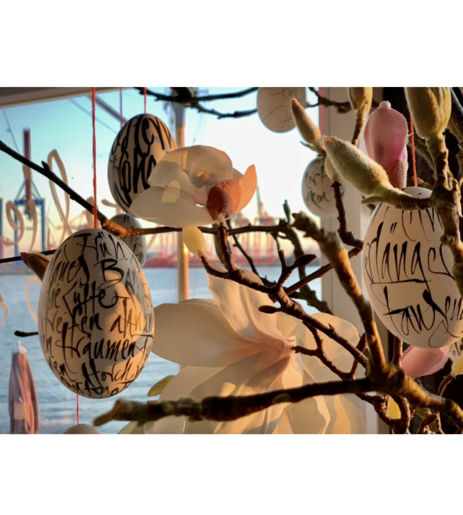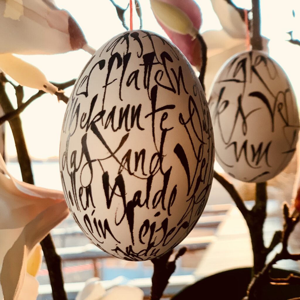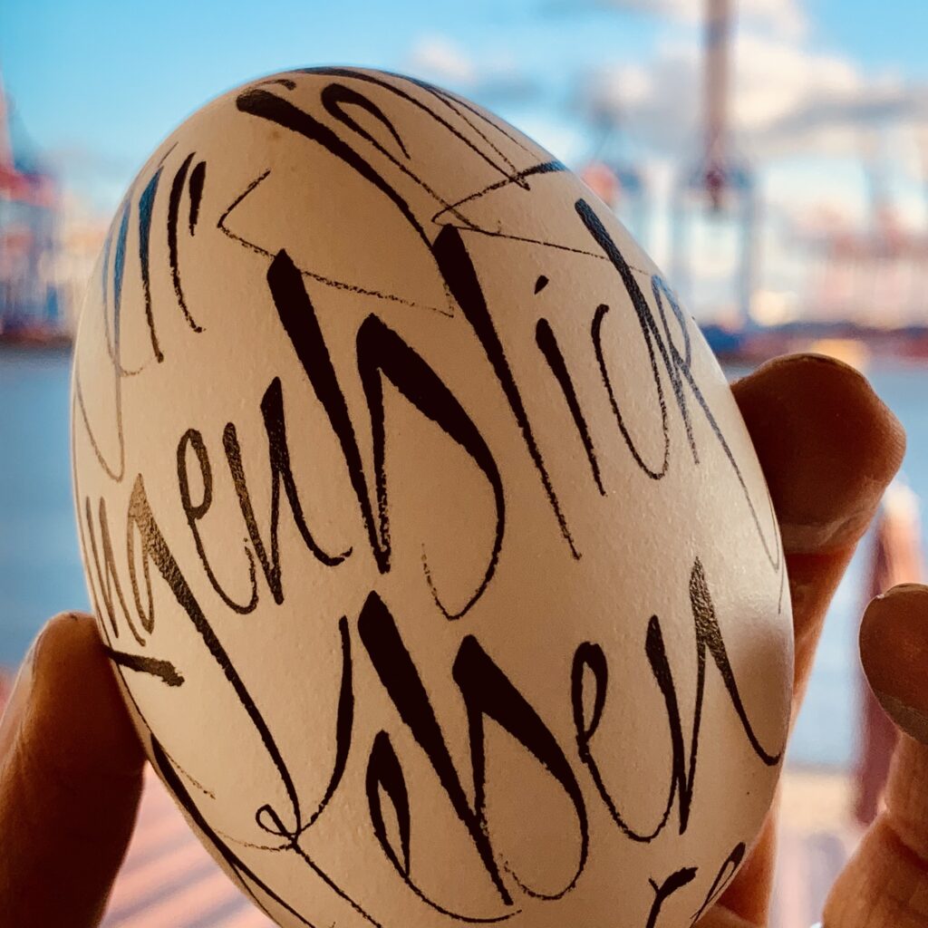 Im Oberdeck der Strandperle kehrt ein Hauch Frühling ein. Zwischen der bunten Bildergalerie hat sich ein Kalligraphiestübchen entfaltet, in dem ich Gänseeier nach Wunsch kreiere. Das Bullauge zum Atelier steht offen am Samstag und Sonntag von 14-16 h und nach Absprache.