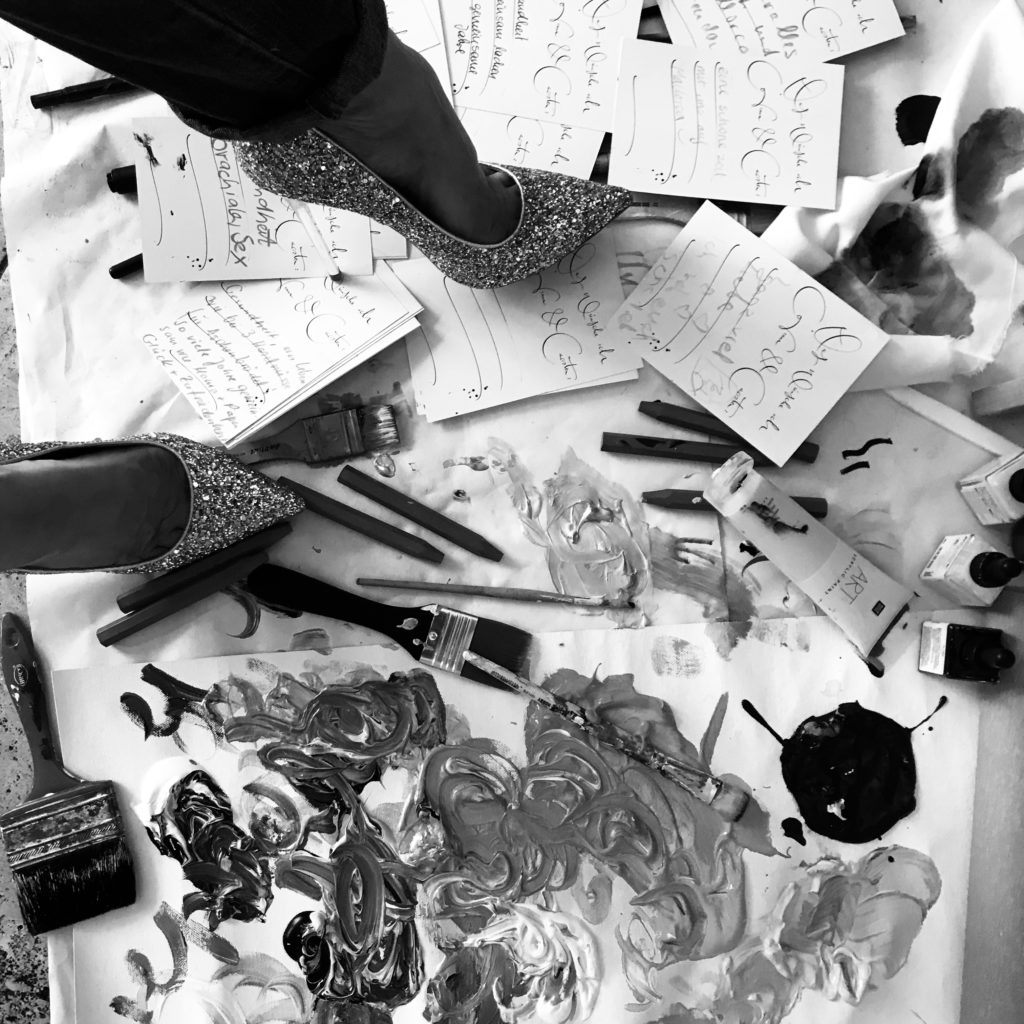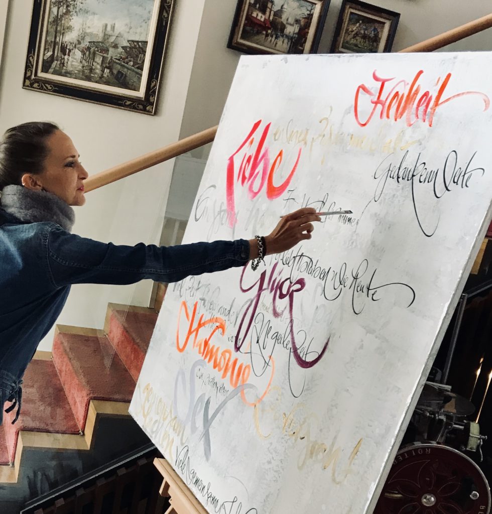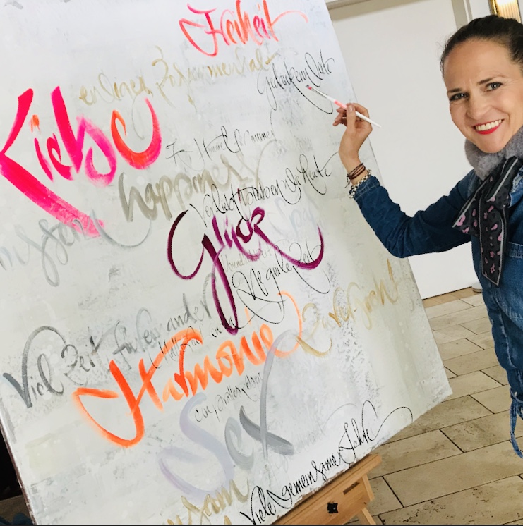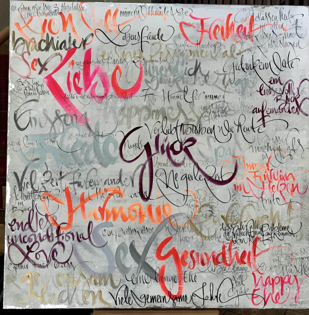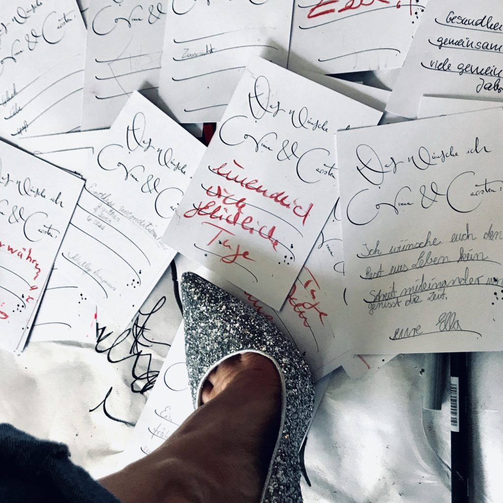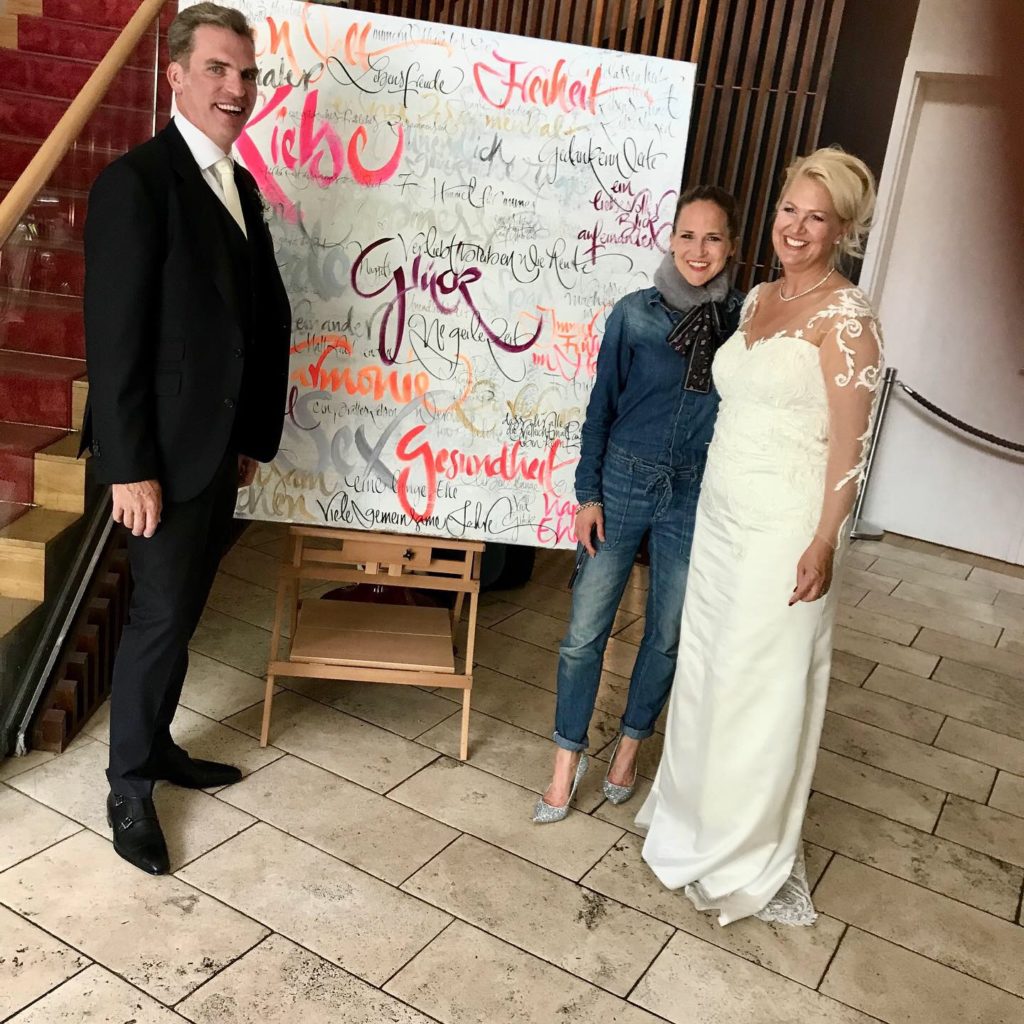 Während einer Hochzeitsfeier am Wannsee kalligraphierte ich Wünsche der Hochzeitsgäste an das Brautpaar auf Leinwand als Erinnerung an diesen besonderen Tag.