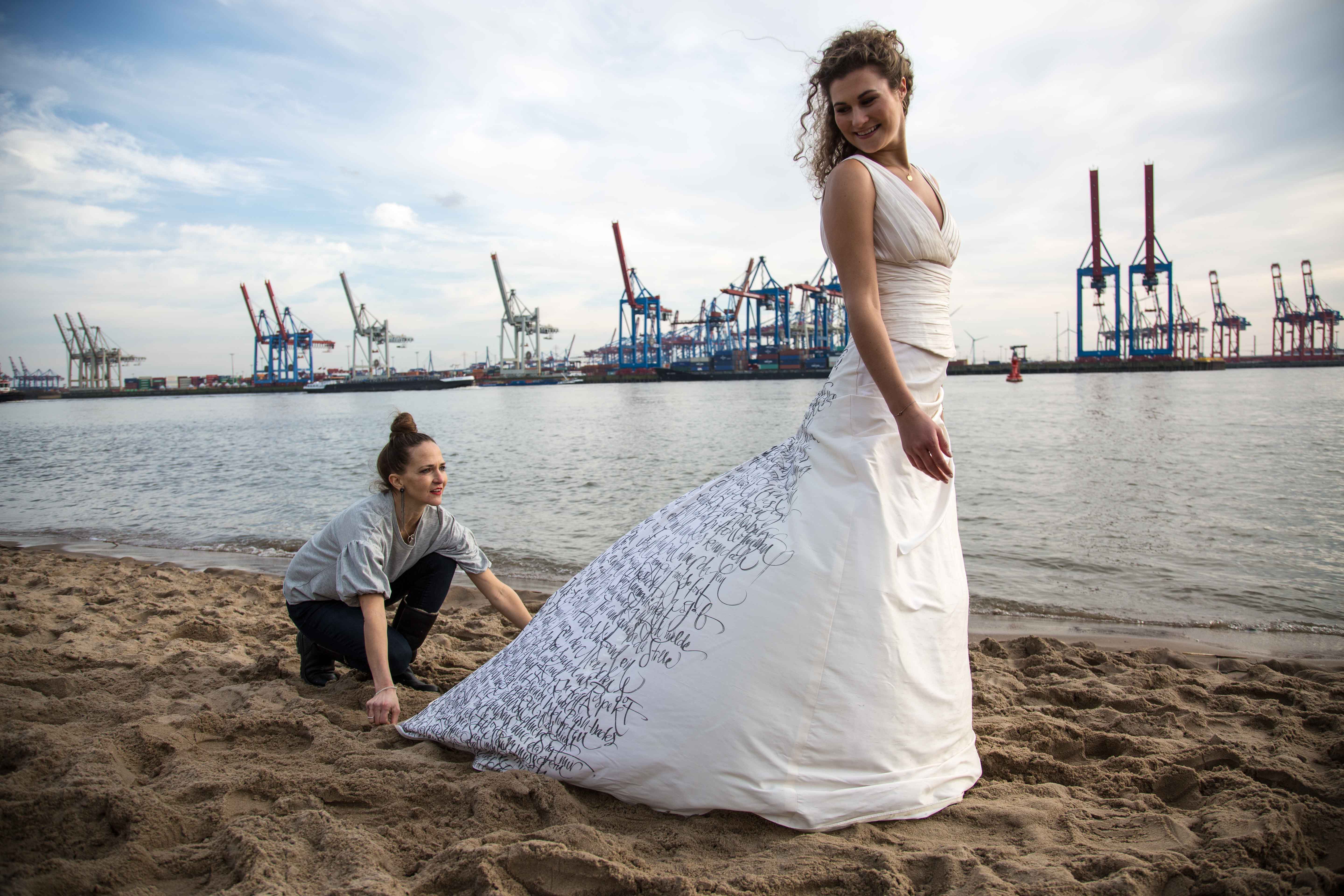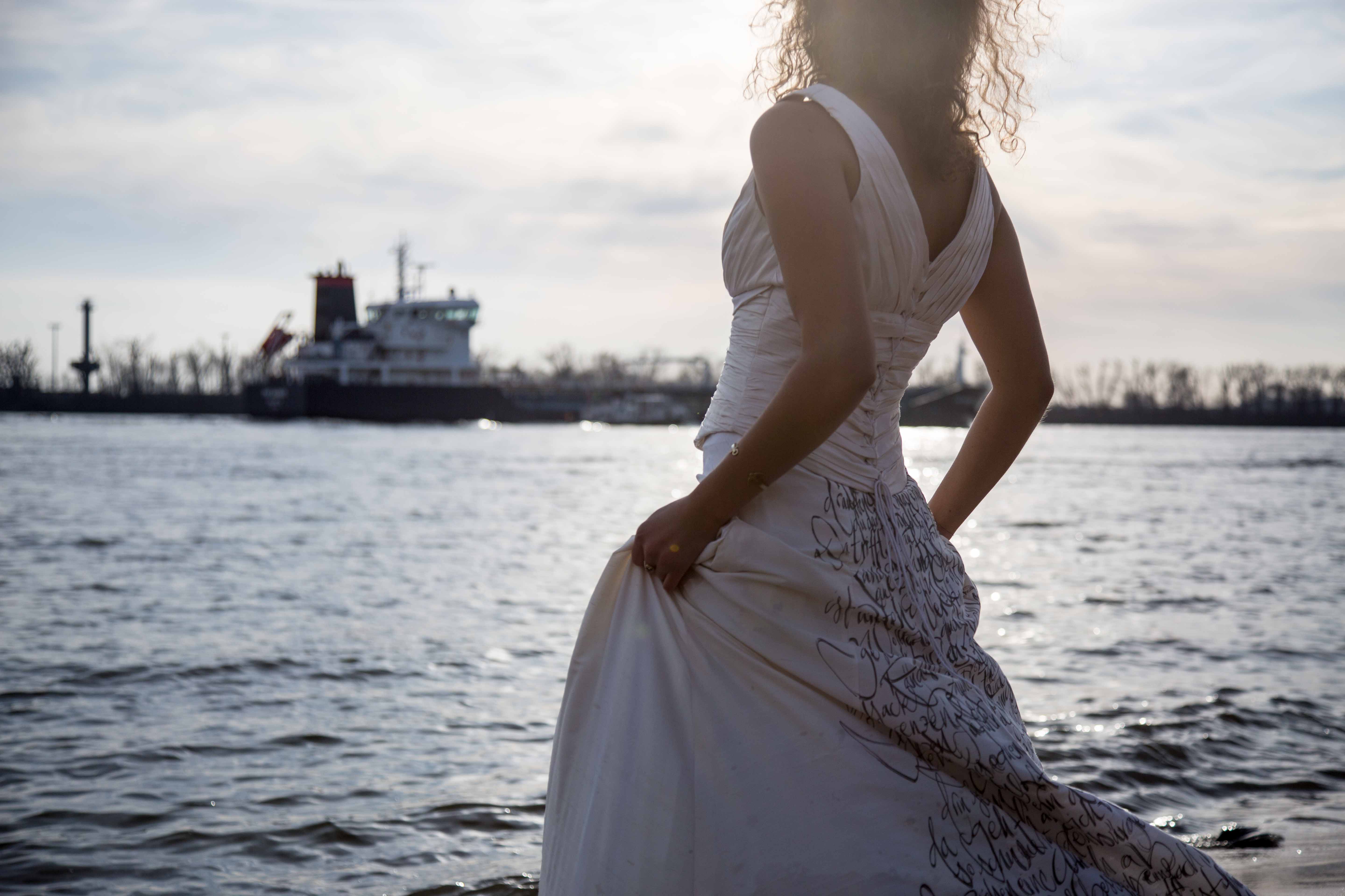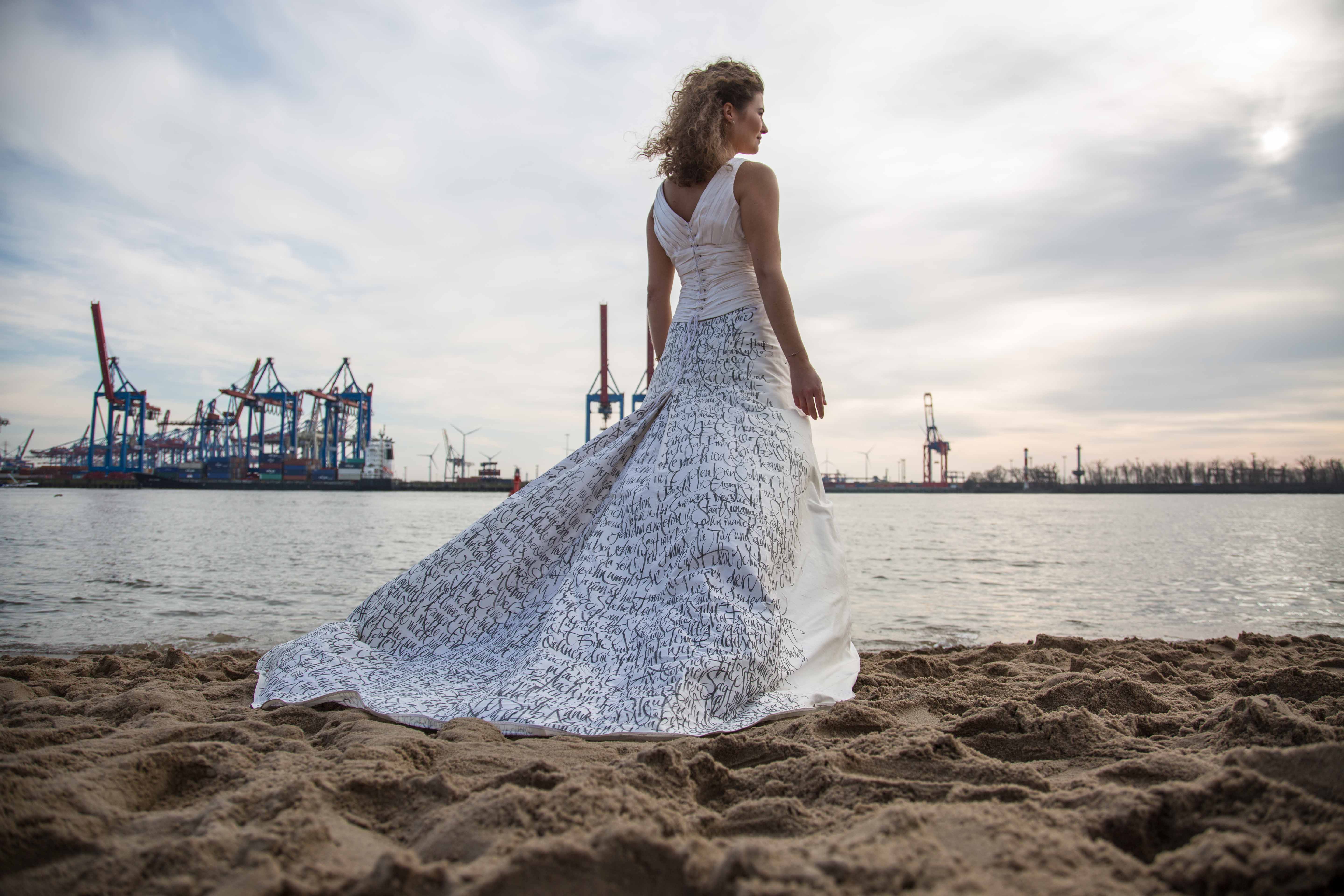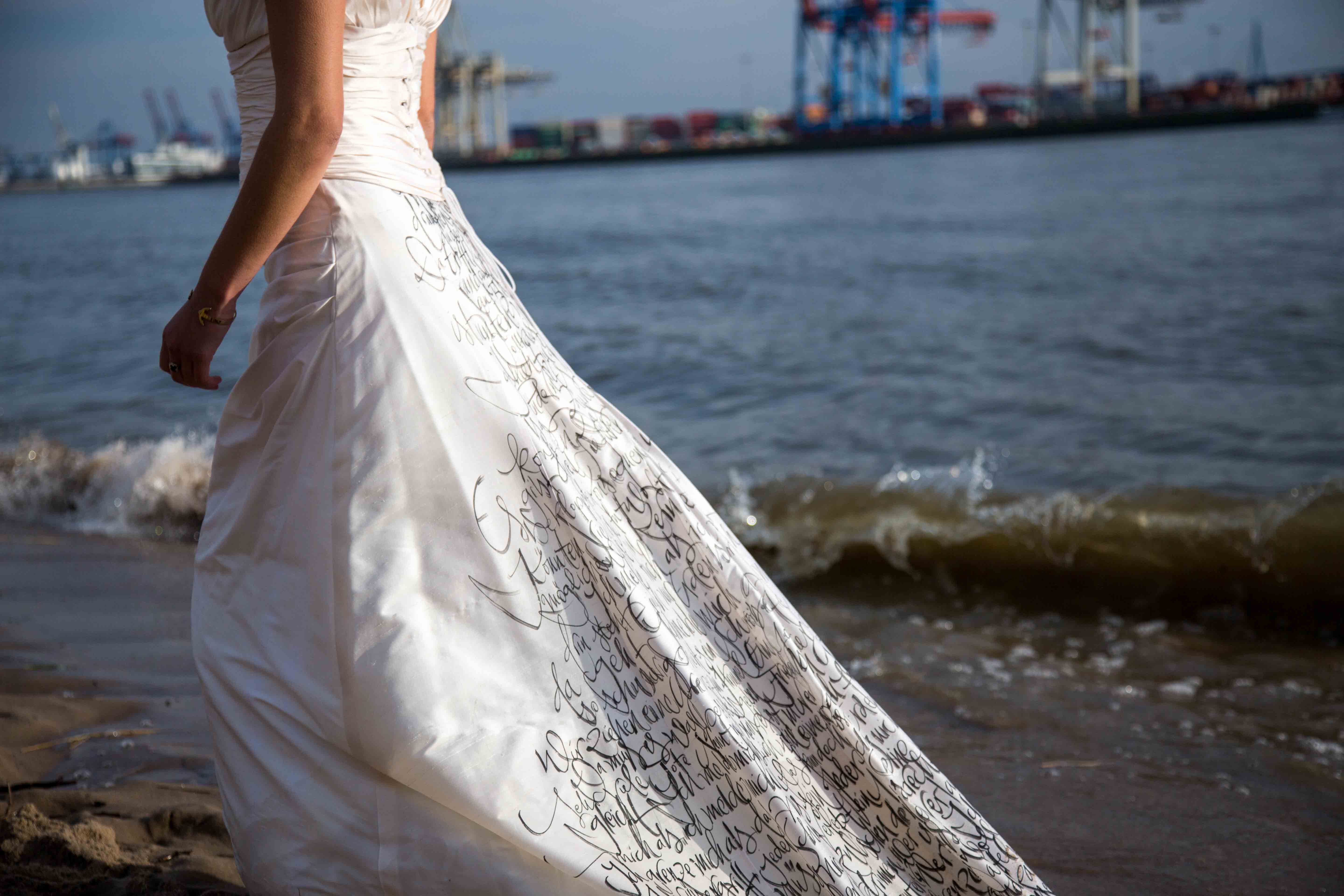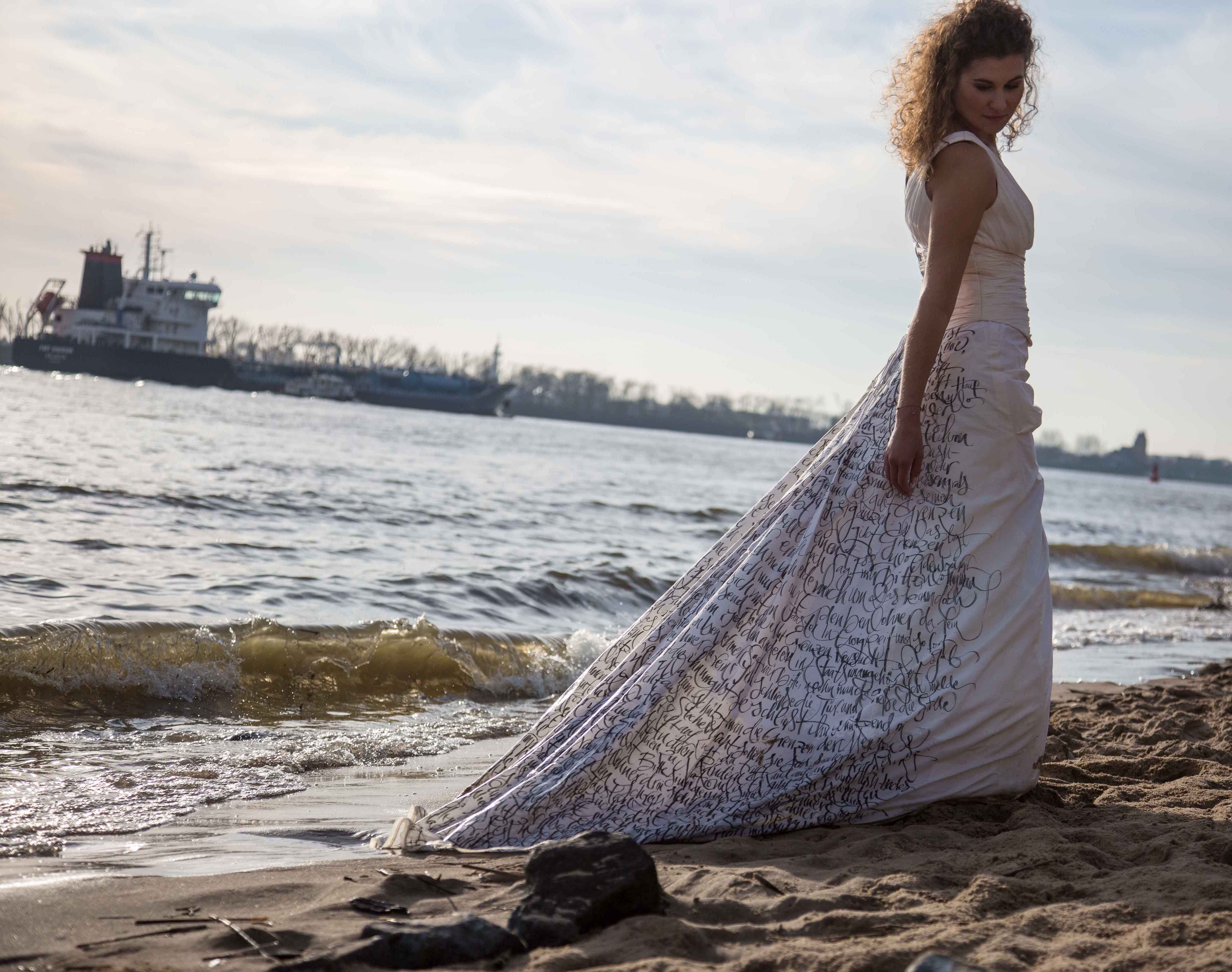 Ich wollte unbedingt ein Brautkleid kalligraphieren. Kaum ausgesprochen, stand Fotografin Julia Löwe zum shooting bereit. Mit ihr ein Kleid von Mona Berg und das Lied „Grenzen“ von Dota Kehr. Die Sonne tat ihr Bestes für ein Experiment am Elbstrand…