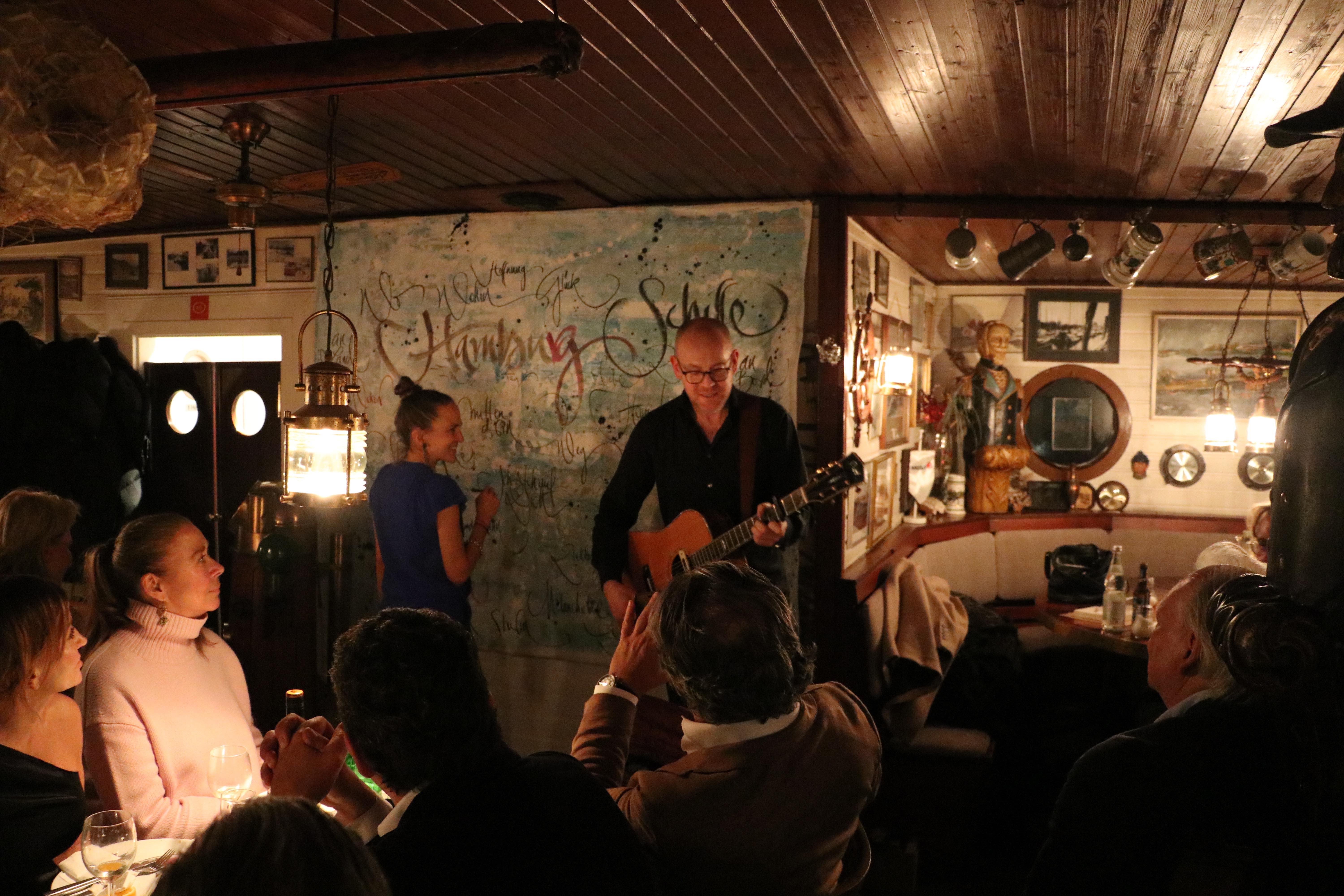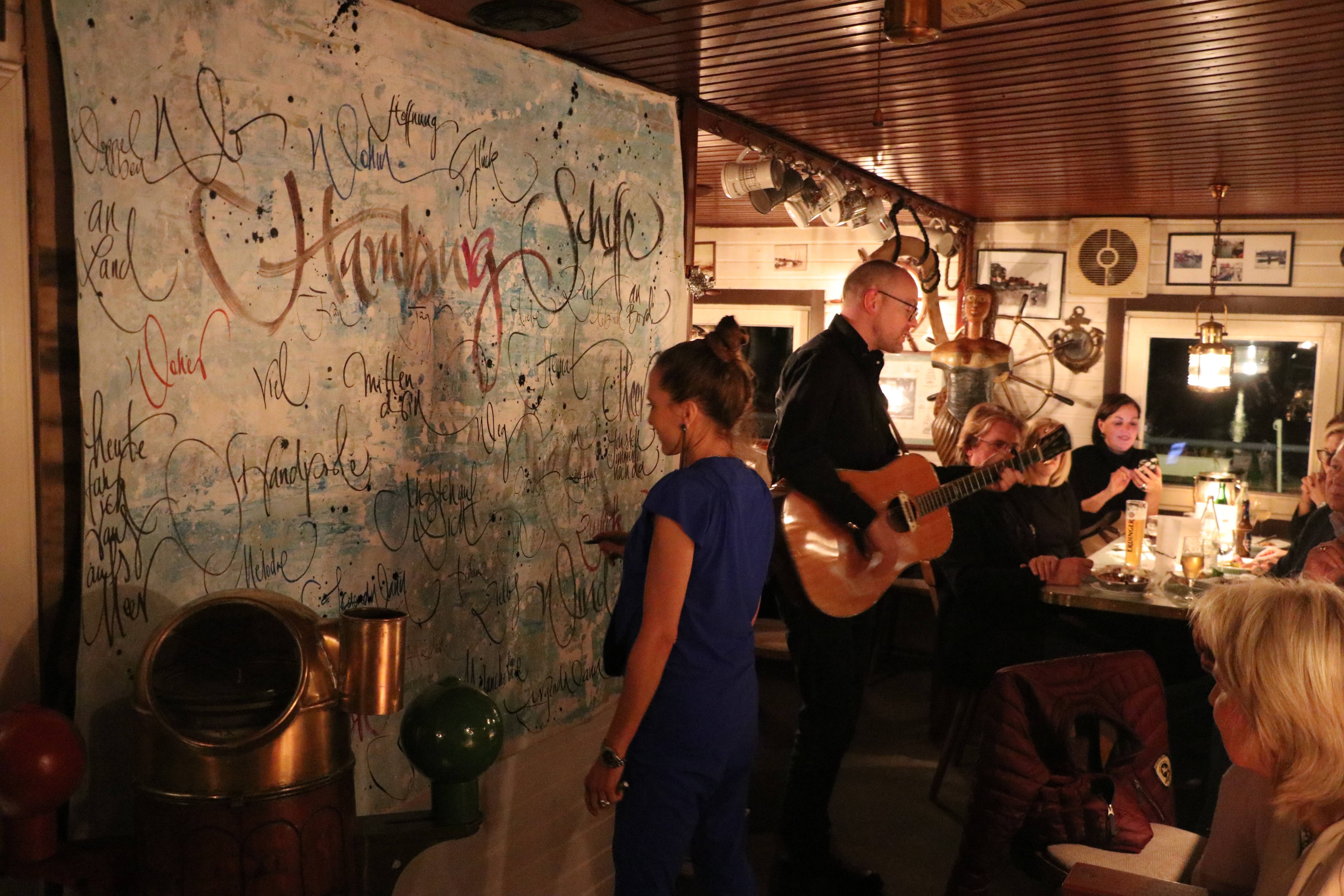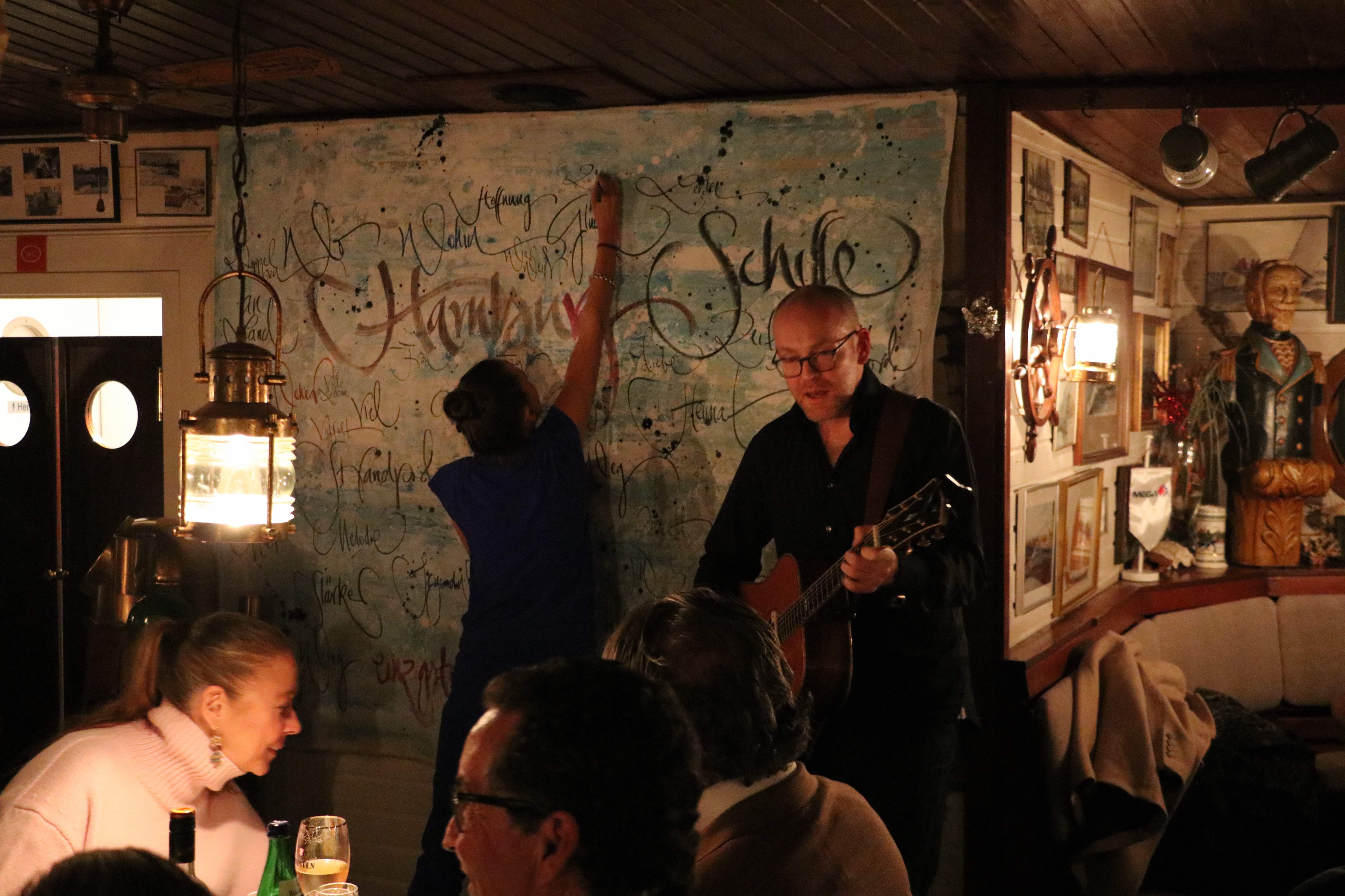 Unter dem Motto „Einfach nur so“ lud York Prinz zu Schaumburg-Lippe eine supernette Gesellschaft auf die Elbe ein. Songpoet Heinrich von Handzahm sorgte für musikalische Geschichten und meine Leinwand fing sie auf. Wie sich das gehört, wurde am Ende alles verteilt und jeder Gast bekam aus der Wortcollage ein Stück mit nach Hause. Herrlich, einfach nur so….