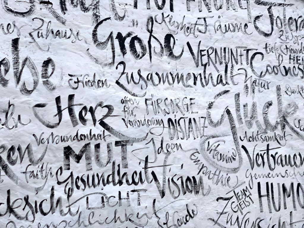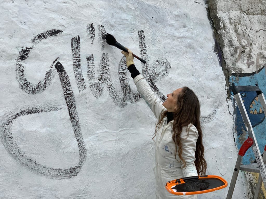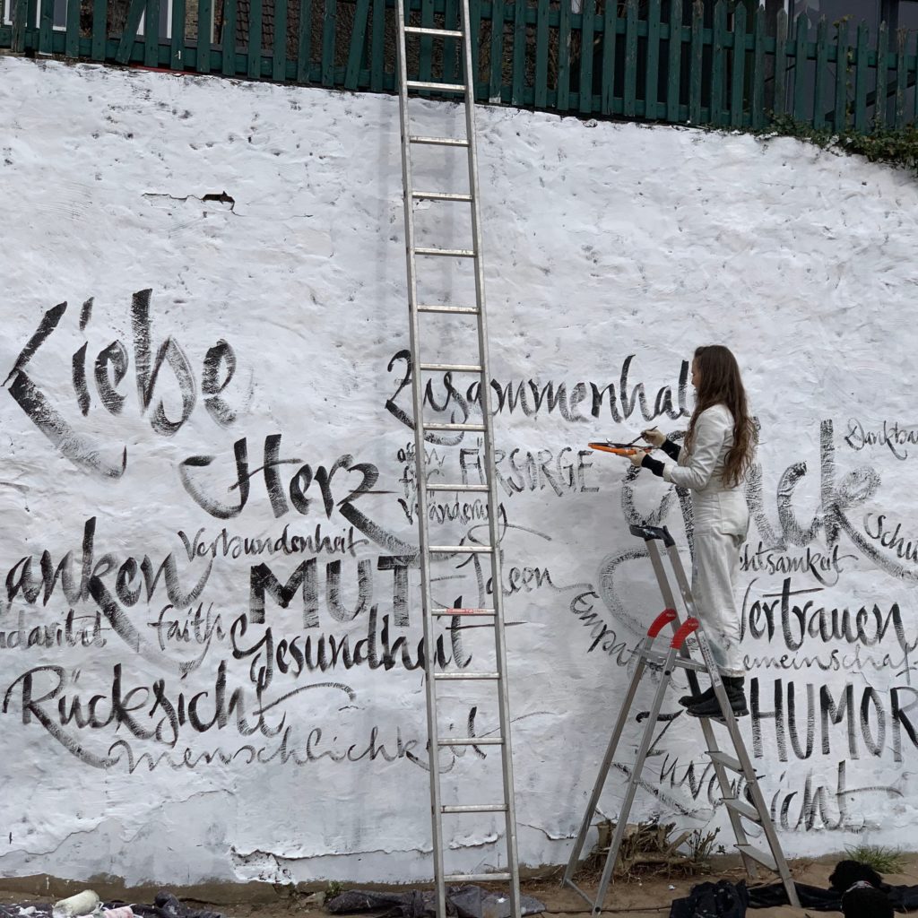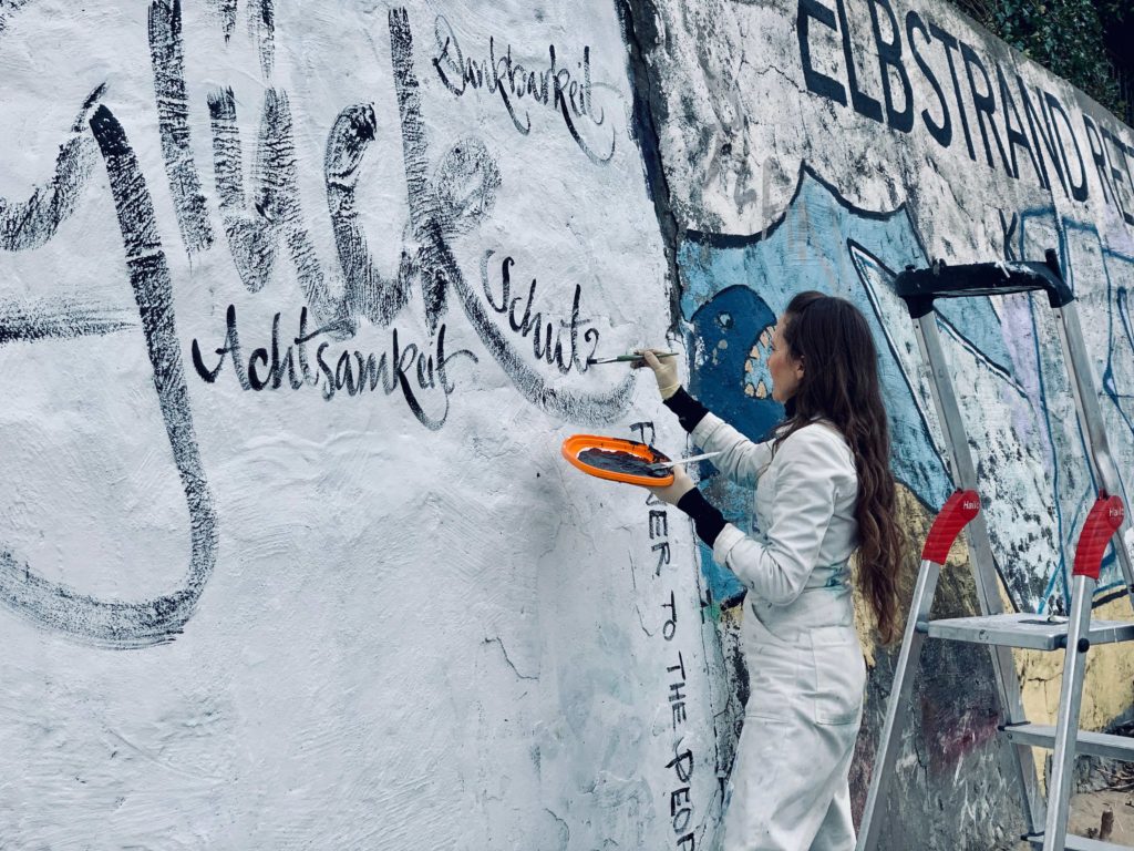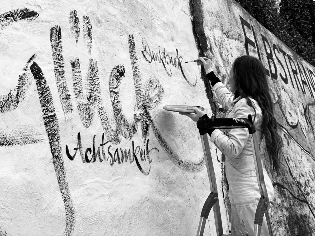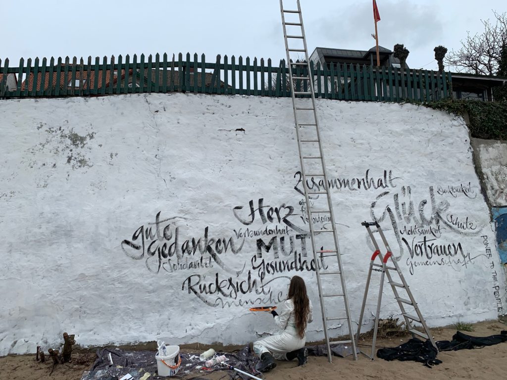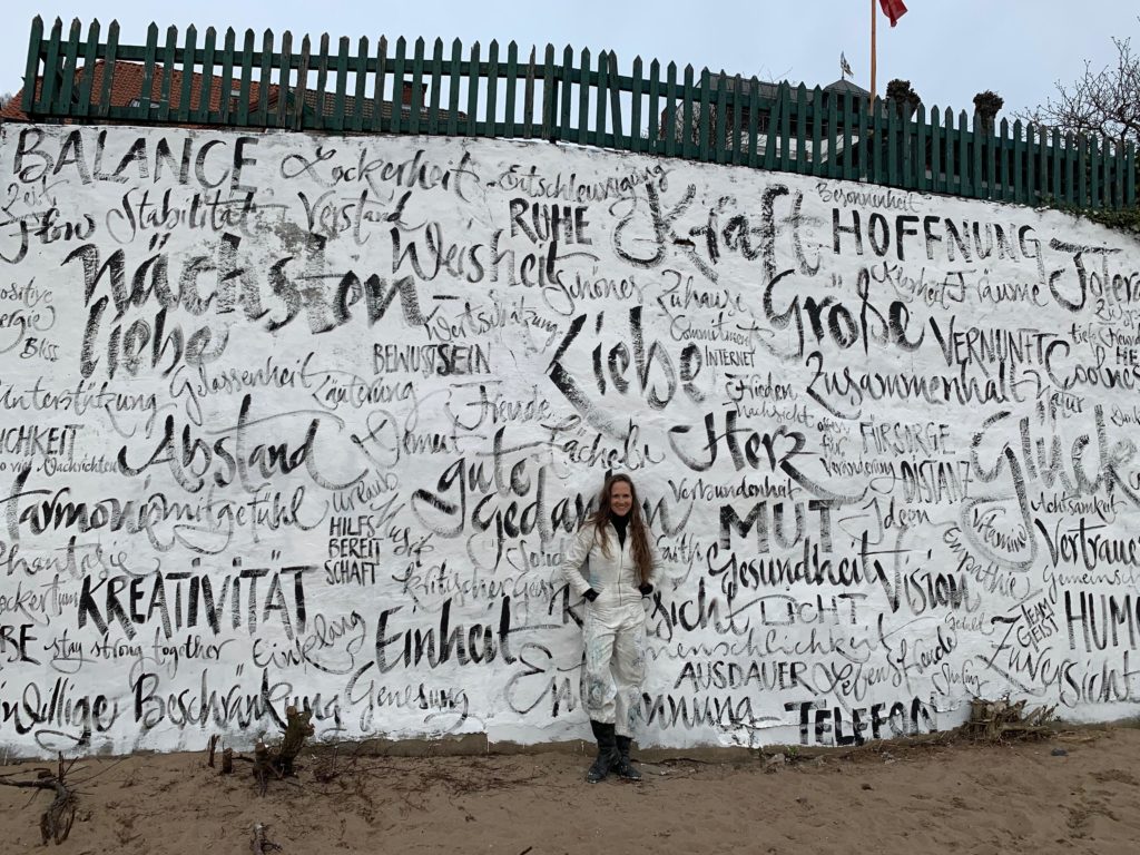 Bilder meiner spontanen Kunstaktion ‚WAS WIR BRAUCHEN’ am Elbstrand. Auf die Kraft der positiven Gedanken! Jeannine Platz 20. März 2020