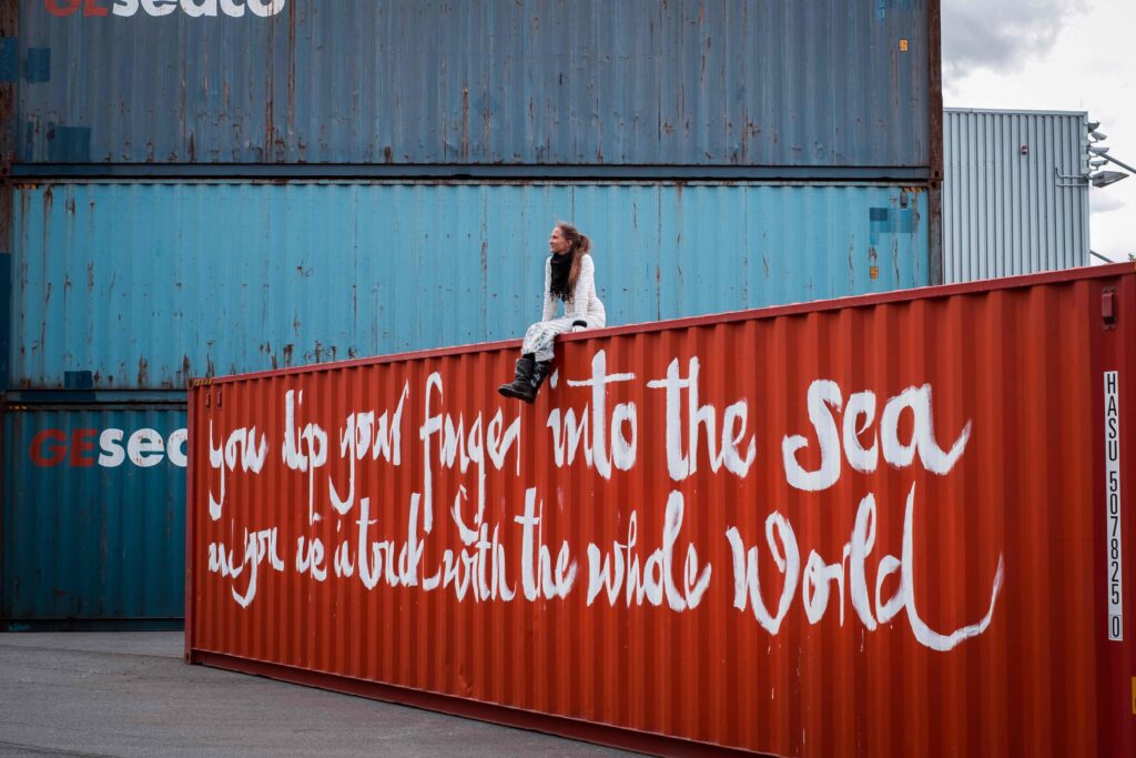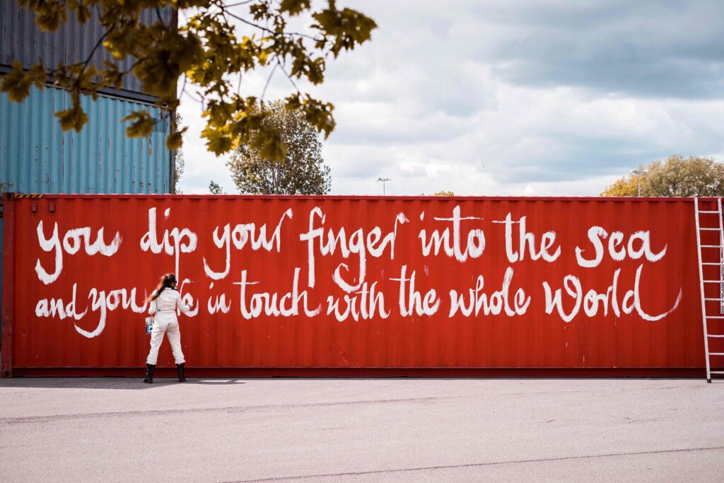 Auf die eine Seite habe ich einen Spruch geschrieben, der mir sehr am Herzen liegt: „You dip your finger into the sea and you are in touch with the whole world“ und auf die andere Seite habe ich den geliebten Hafen gemalt. Morgen erzähle ich Euch die Geschichte weiter, auf welches Schiff der Container verladen wird und wann die Weltreise beginnt….