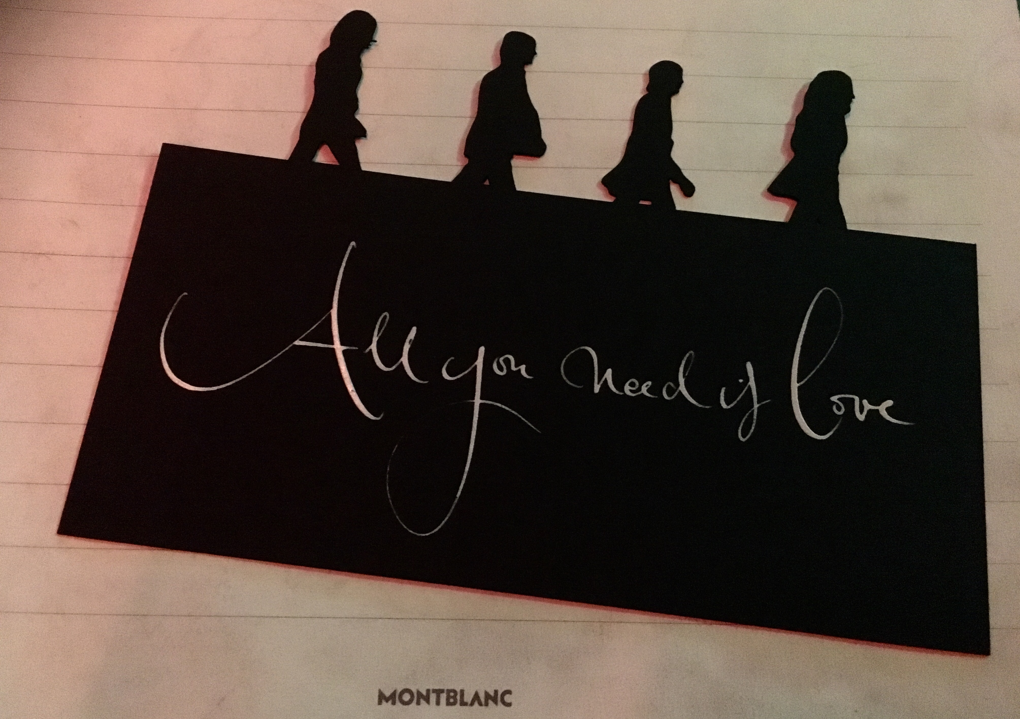 Beim ‚Montblanc-Beatles Event‘ kalligraphierte ich die beliebtesten Beatles Songtexte und Songtitel für die geladenen Gäste. Zwischendurch gab es spannende Gespräche über die Kunst mit Klaus Voormann der beste Freund der Beatles, Plattencoverdesigner und Bassist für die Soloprojekte von John Lennon, Ringo Starr & George Harrison