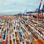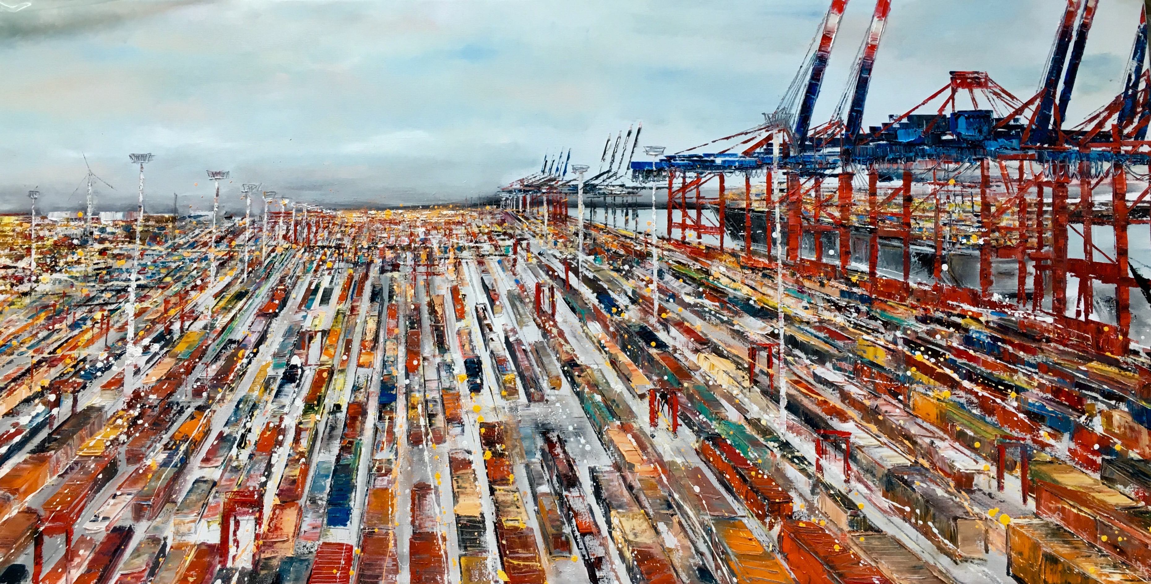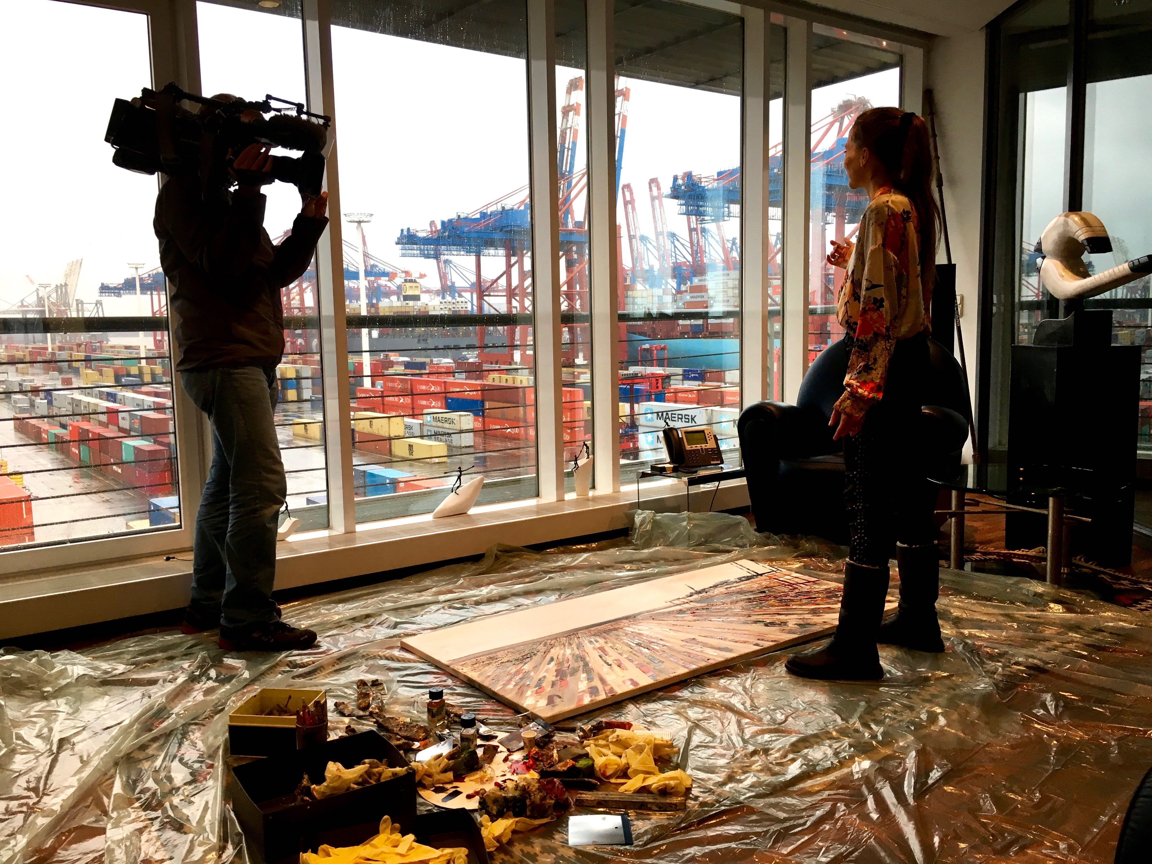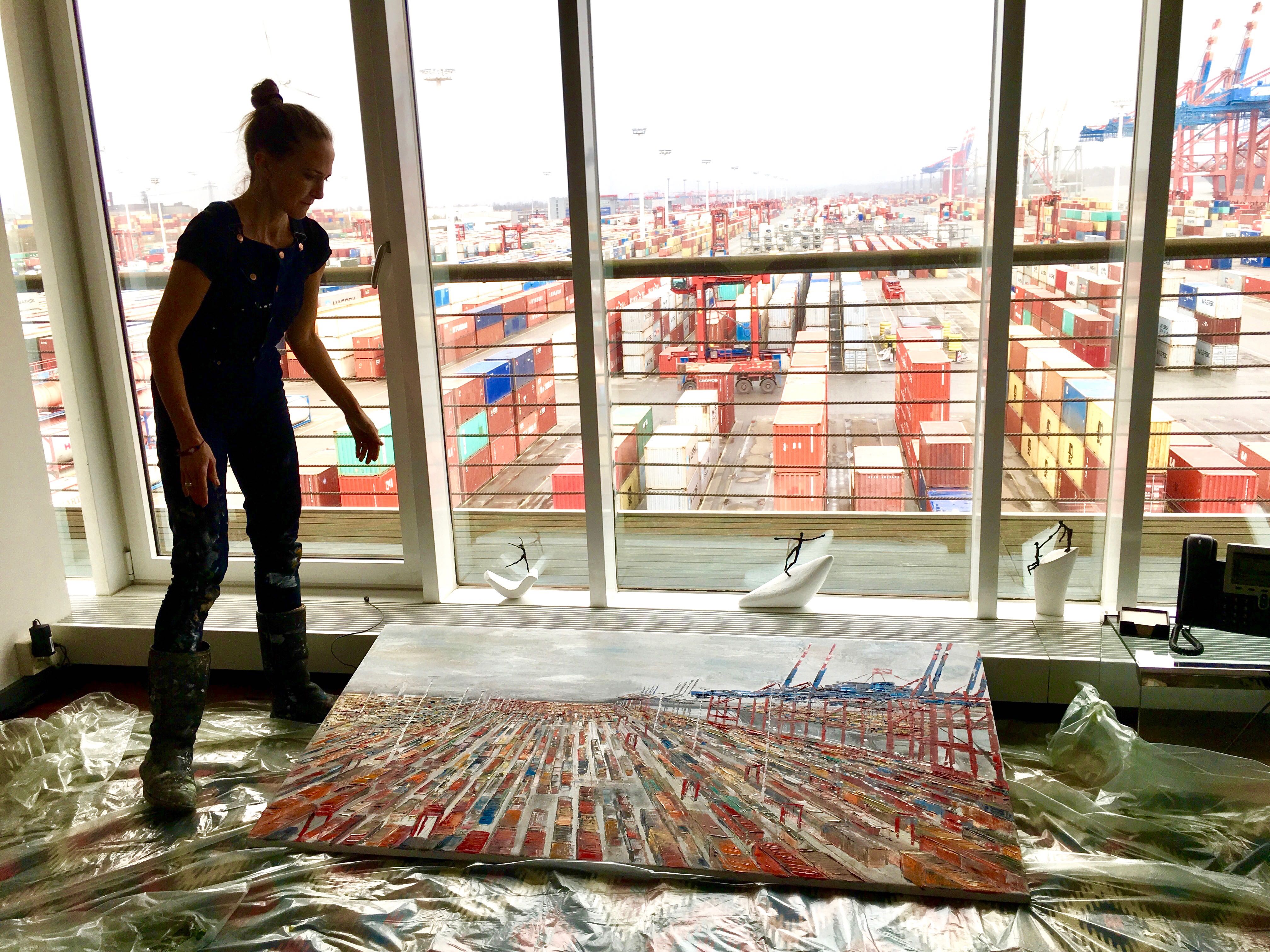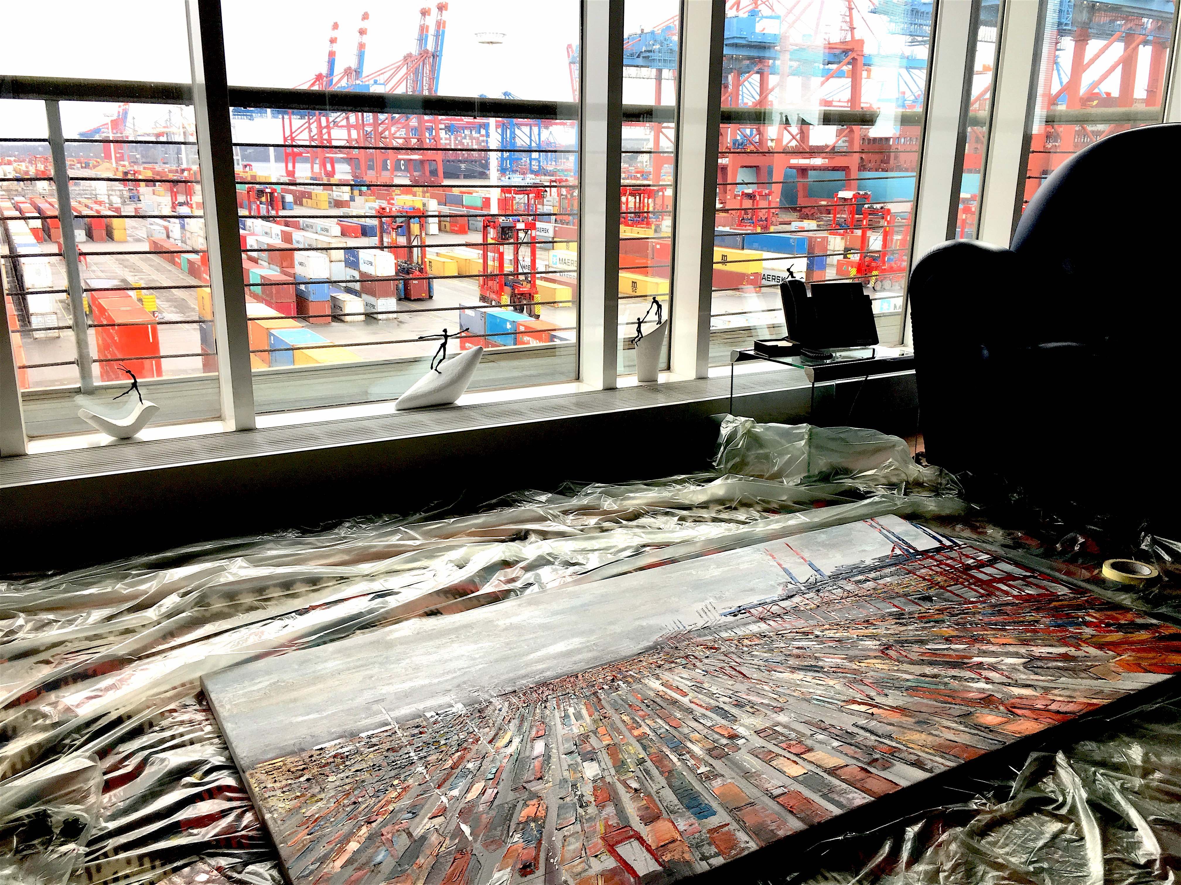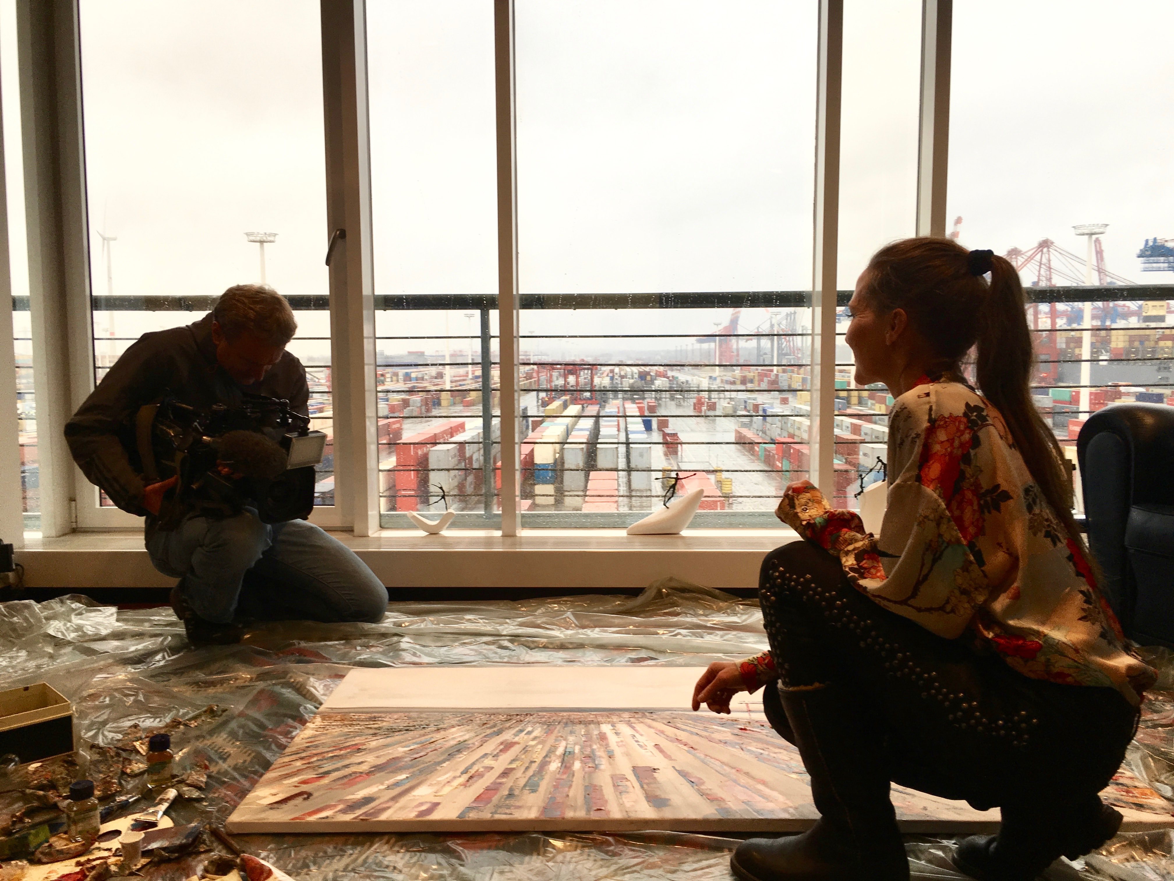 Mein Atelier ist heute mitten im Hafen. Direkt am Eurogate. Ich darf aus dem spannendsten Bürofenster aller Zeiten malen. Herr Eckelmann überläßt mir sein Konferenzzimmer und ich komme aus dem Staunen nicht heraus. Alles ist bunt und in Bewegung vor meinem Fenster. Ich male vertieft, doch kaum habe ich einmal nicht hingeschaut, ist plötzlich das Riesencontainerschiff weg, dass eben noch da lag. So ist das im Hafen: Immer voller Dynamik… Mich besucht RTL und dreht den Entstehungsprozeß meines Ölbildes.