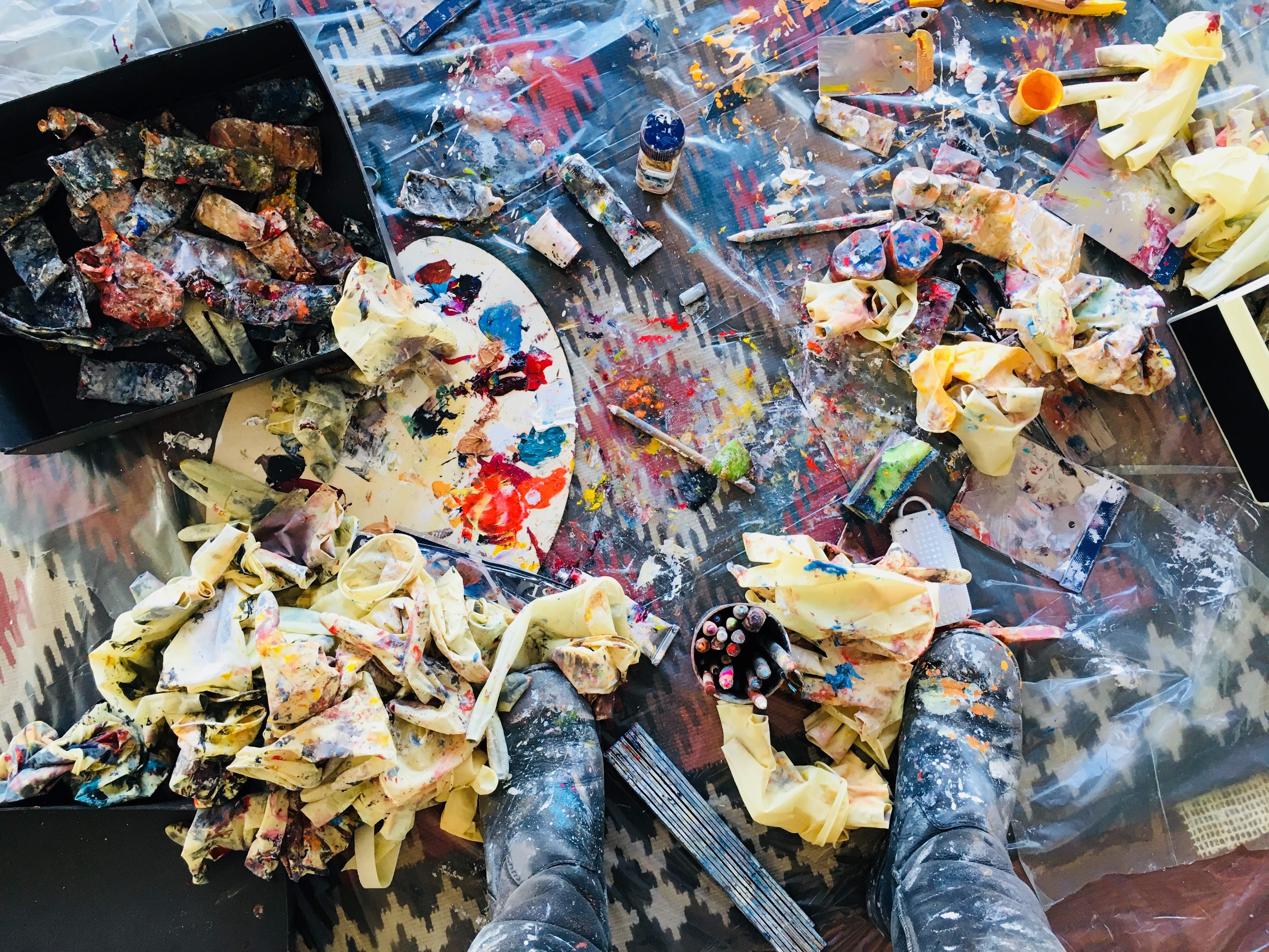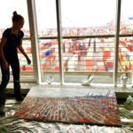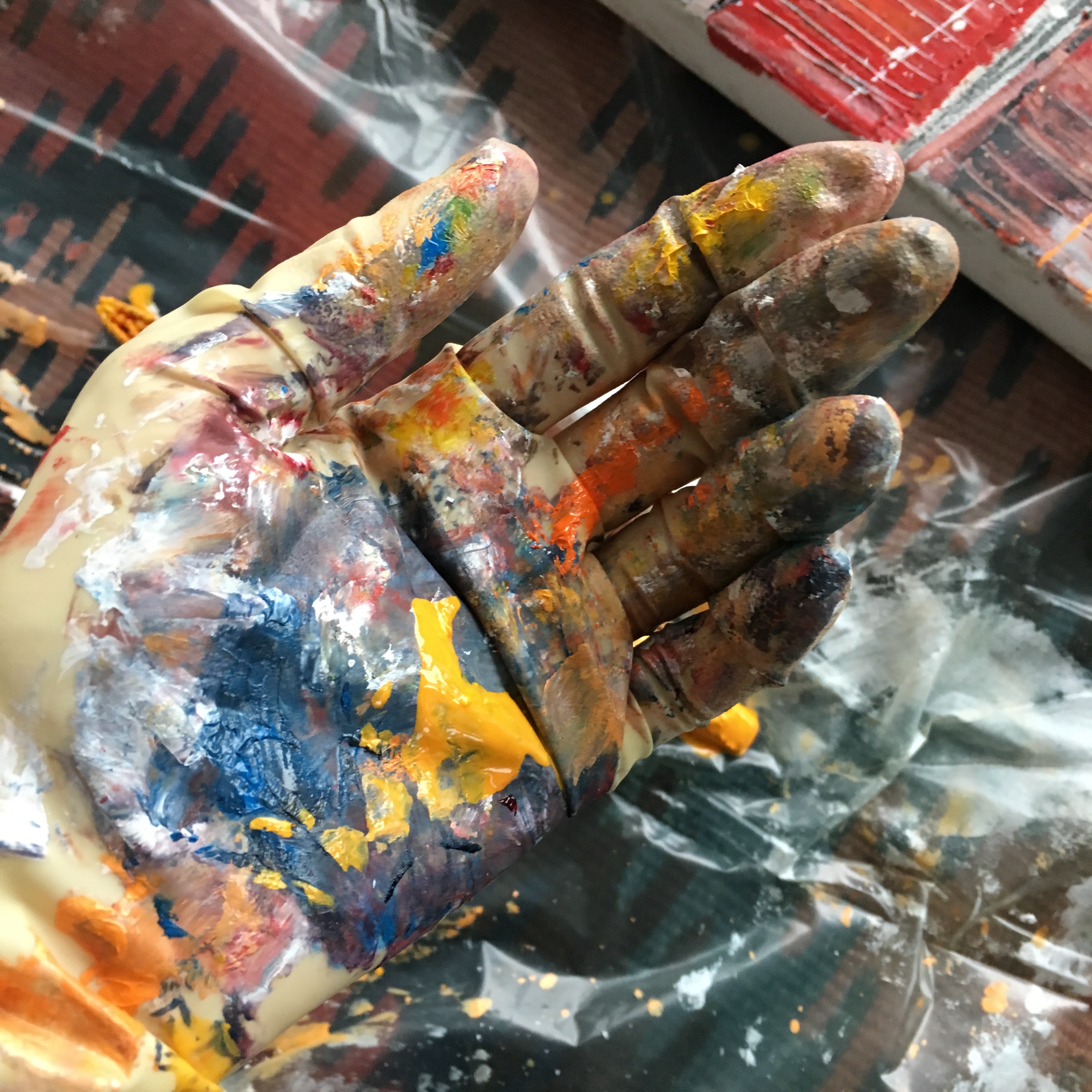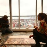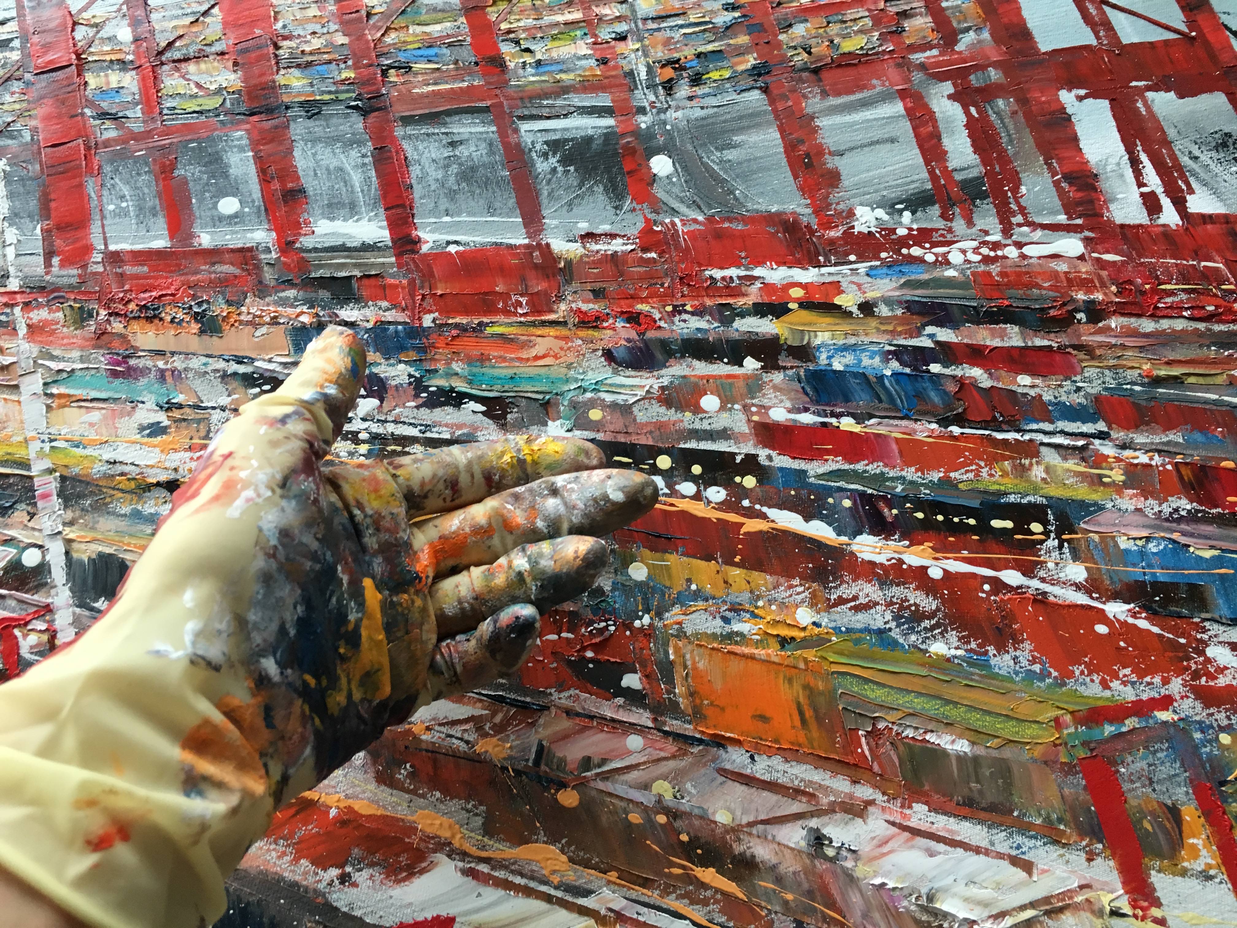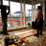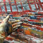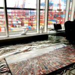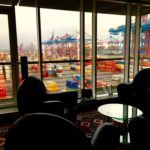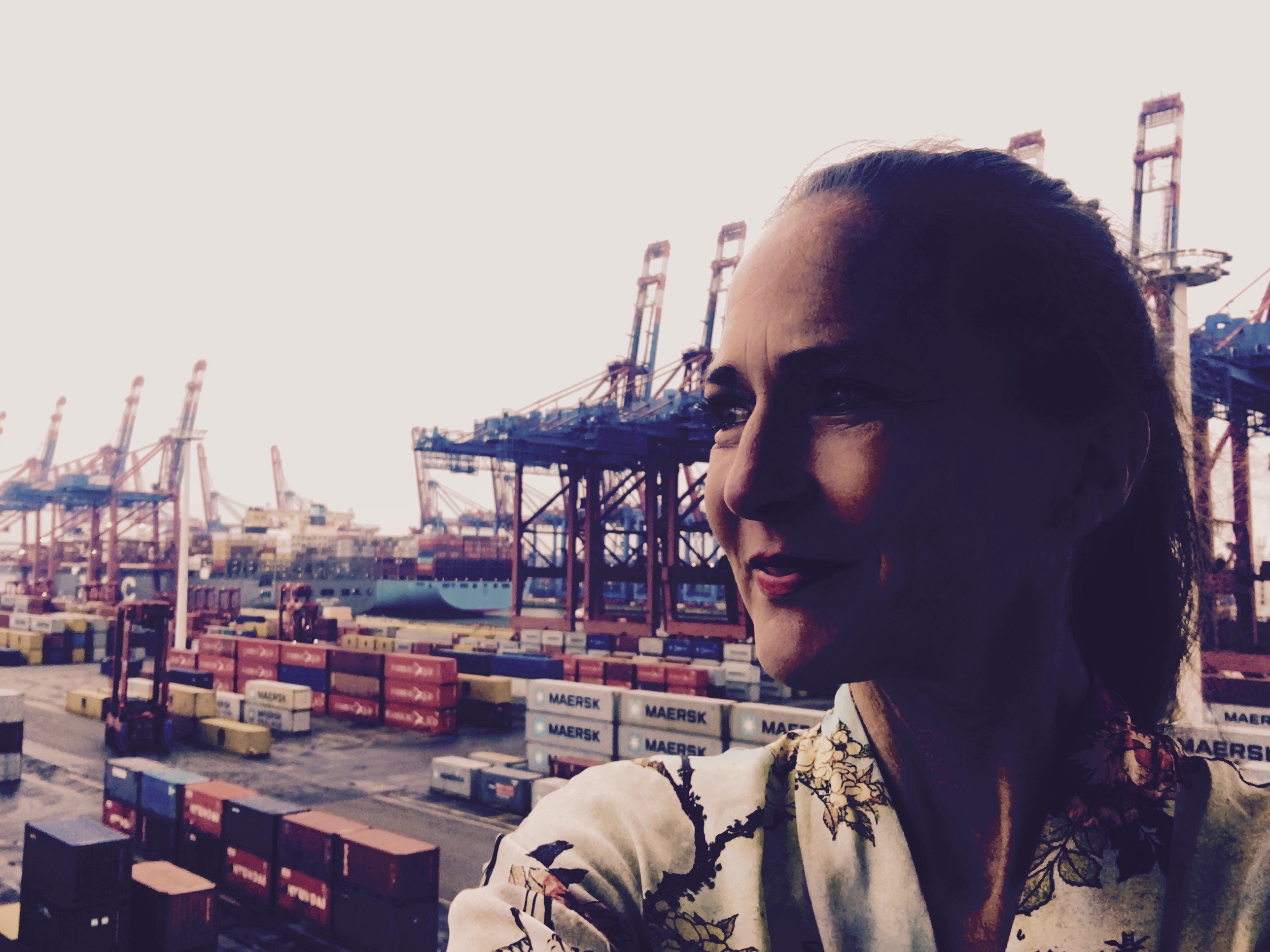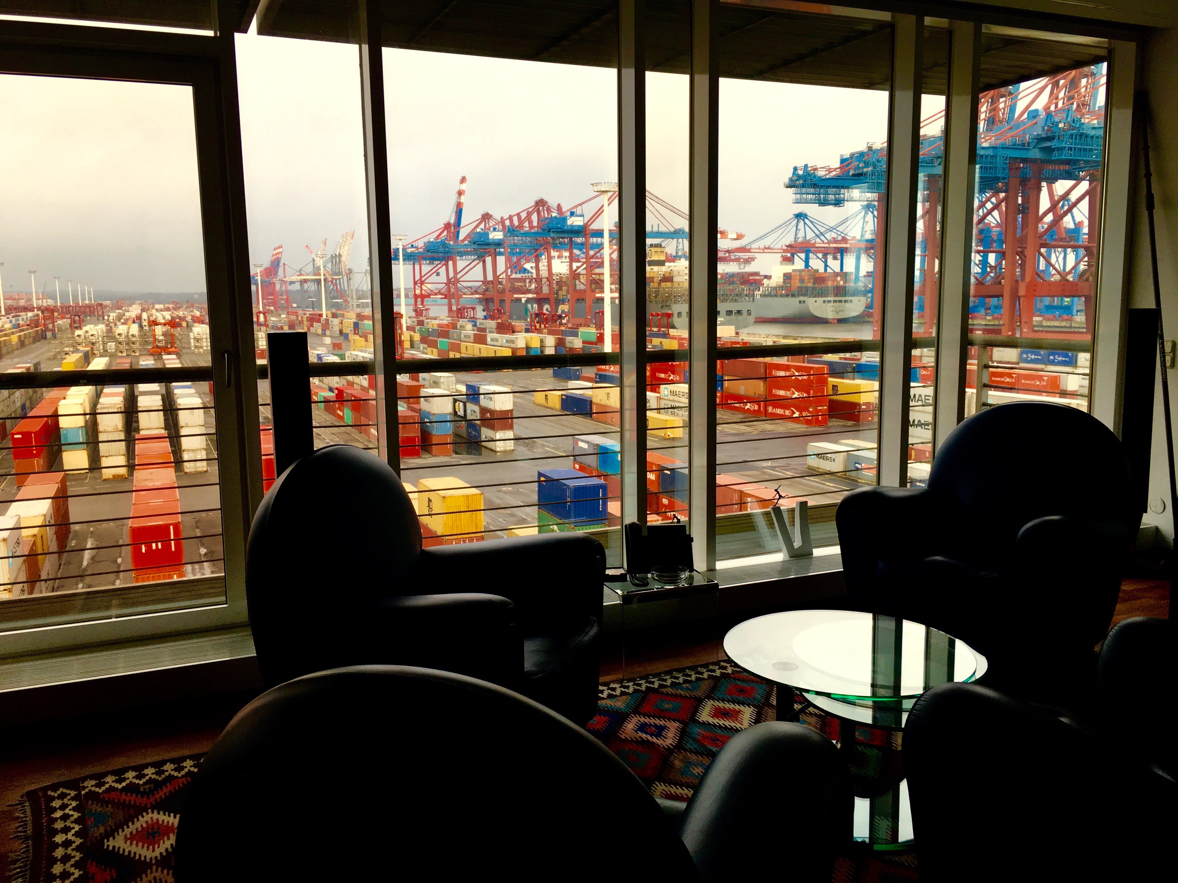 Mein Atelier ist heute mitten im Hafen. Direkt am Eurogate. Ich darf aus dem spannendsten Bürofenster aller Zeiten malen. Herr Eckelmann überläßt mir sein Konferenzzimmer und ich komme aus dem Staunen nicht heraus. Alles ist bunt und in Bewegung vor meinem Fenster. Ich male vertieft, doch kaum habe ich einmal nicht hingeschaut, ist plötzlich das Riesencontainerschiff weg, dass eben noch da lag. So ist das im Hafen: Immer voller Dynamik… Mich besucht RTL und dreht den Entstehungsprozeß meines Ölbildes.