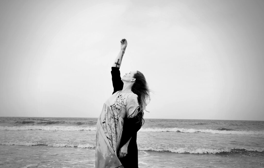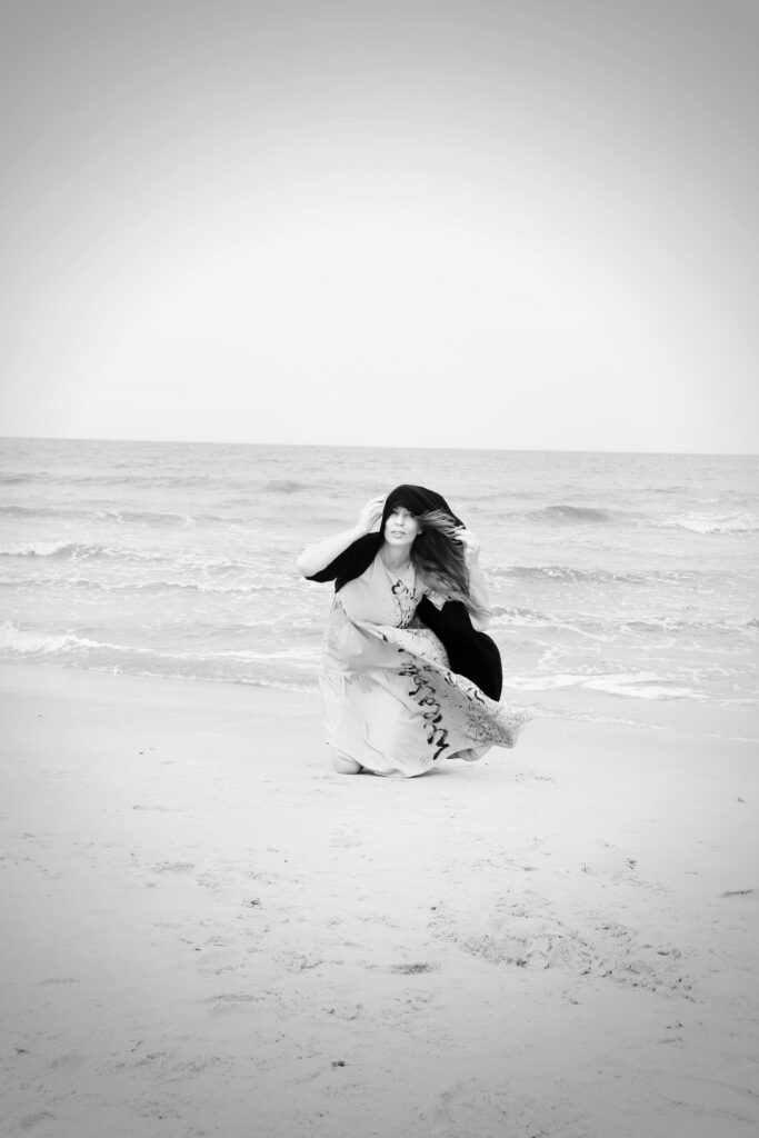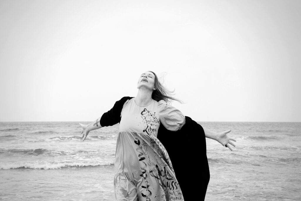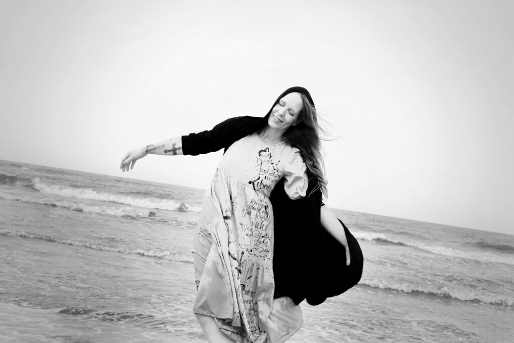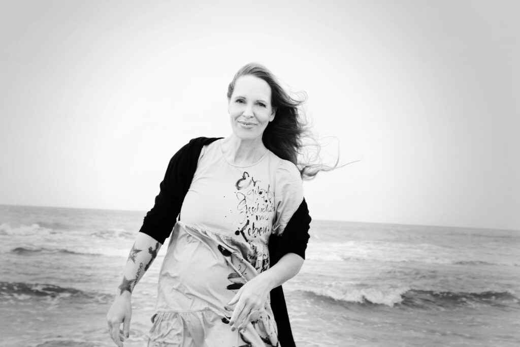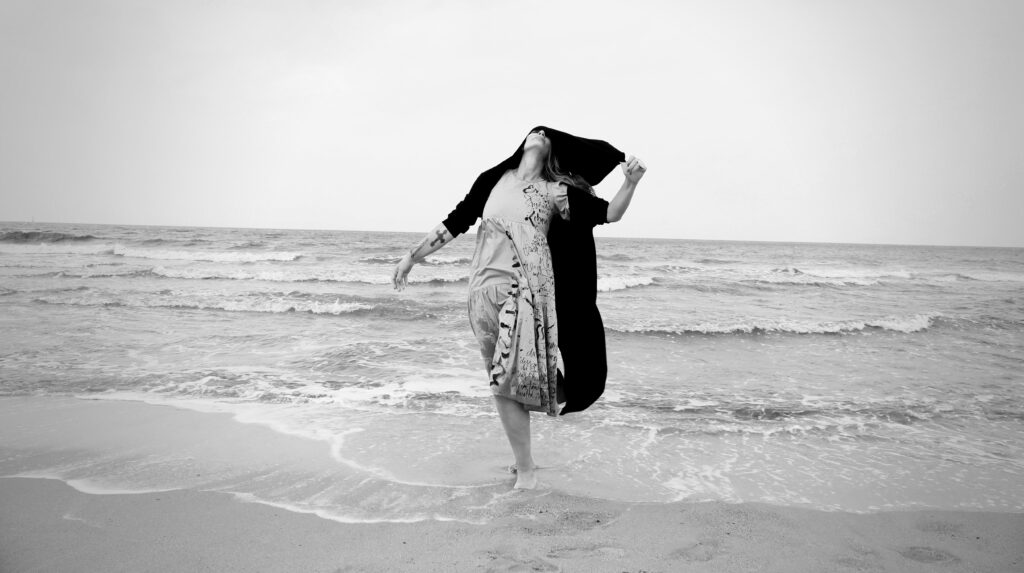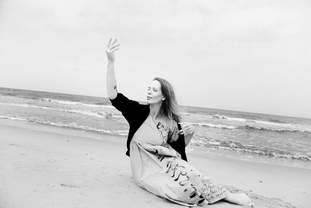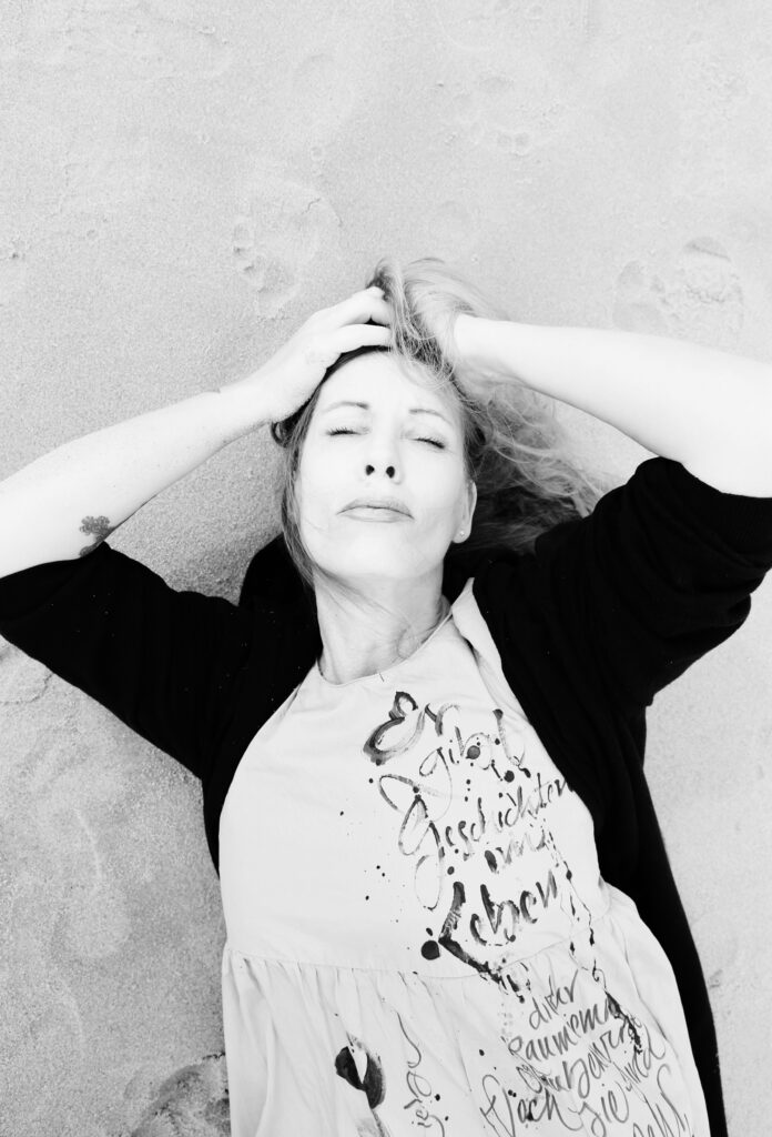 Buchautorin Constanze Köpp produziert zur Zeit ihr Hörbuch WILDBLUME. Ihr bewegendes Vorwort habe ich auf ein Kleid kalligraphiert, das sie zu Ehren ihres Geburtstages trägt. Pic: Svea Ingwersen