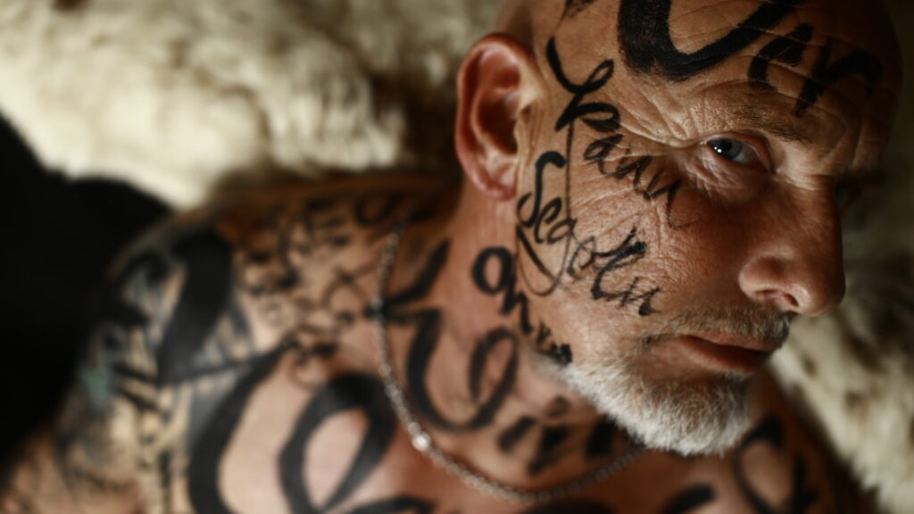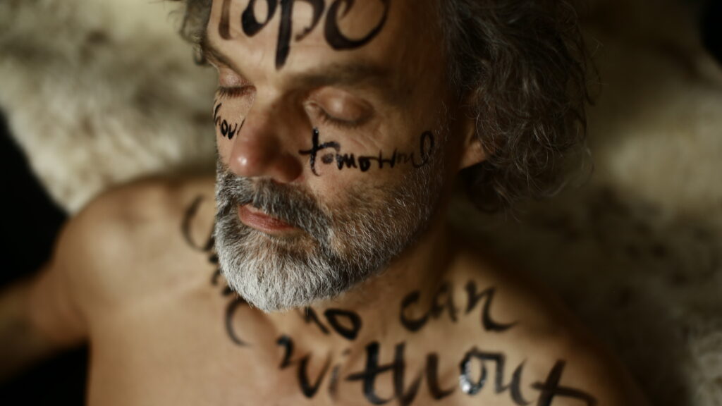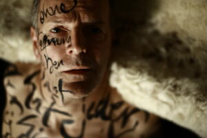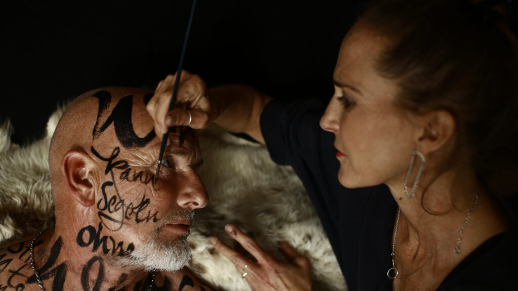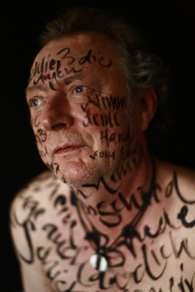 “In ihrem Kunstprojekt machen Jeannine Platz und Wieglas Stimmen sichtbar. Sie treffen Künstler aus aller Welt, die sich einen besonderen Text aus ihrem Repertoire auf die Haut kallligraphieren lassen. Eingetaucht in Rhythmus und Melodie des Stückes kreiert Jeannine Platz Zeile für Zeile und benutzt den Körper als lebende Leinwand. Sie nimmt die Stimmung der Worte in sich auf und transformiert sie in Farbe und Buchstabenschwünge auf das Gesicht, Hände, Unterarme, Rücken oder auf den ganzen Körper. wieglas hält die Essenz der sichtbar gewordenen Stimme fotografisch fest, immer dabei seinem geheimnisvollen Stil treu bleibend. So wird die Kunst am Körper zu einem Moment immerwährender Ewigkeit. THE VOICE ON MY SKIN vereint die Fotografien in einer Ausstellung und einem Bildband, die beim Betrachten Botschaften aus allen Genres zum Erklingen bringen”