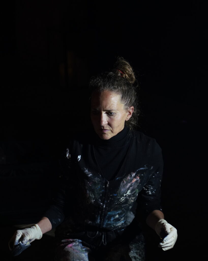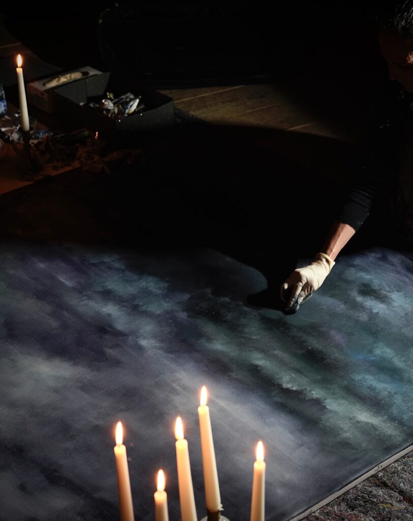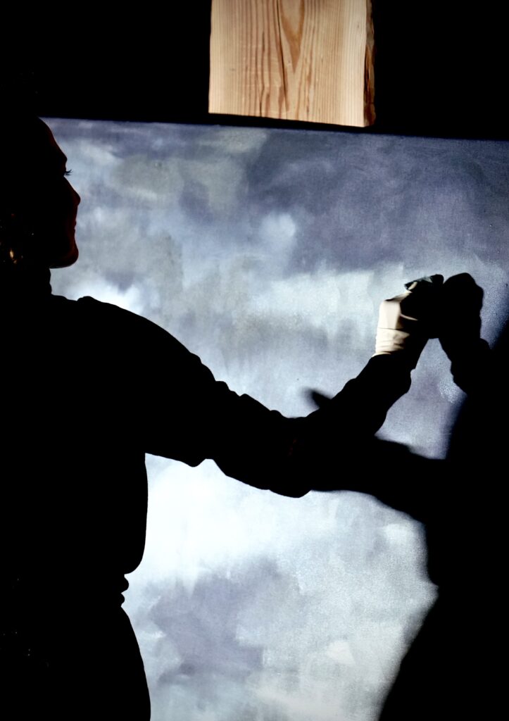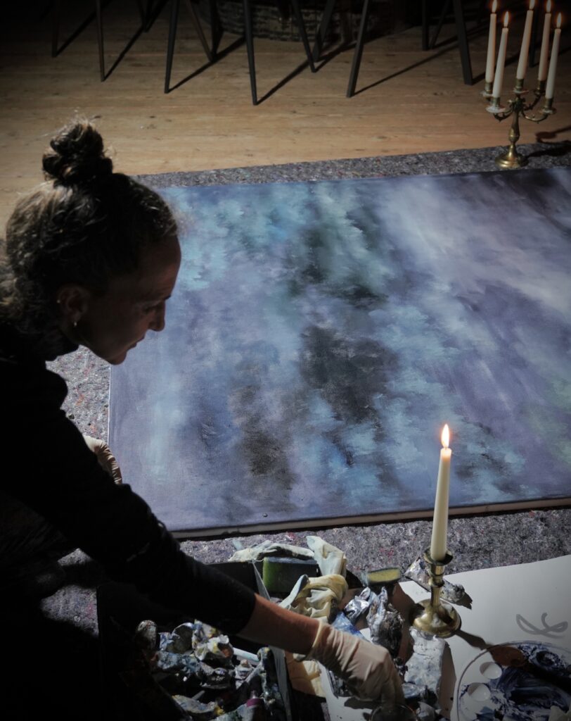 Einmal durch das Kohlfeld hindurch und die Welt auf Gut Lebbin ist erreicht. Kaum habe ich mein Atelier im Wintergarten bezogen, blinzelt auch schon der goldene Mond am Horizont hervor. Als ich das Ufer erreiche, wird der goldene Schein silber und leuchtet hell auf meine Leinwand. Als der Mond morgens als rote Kugel untergeht, geht zeitgleich die Sonne als roter Ball auf. 2 rotleuchtende Phänomene stehen sich gegenüber. Vor lauter Staunen habe ich dieses Himmelsflammenmeer fotografisch nicht festhalten können…. Dann werde ich es irgendwann malen!