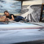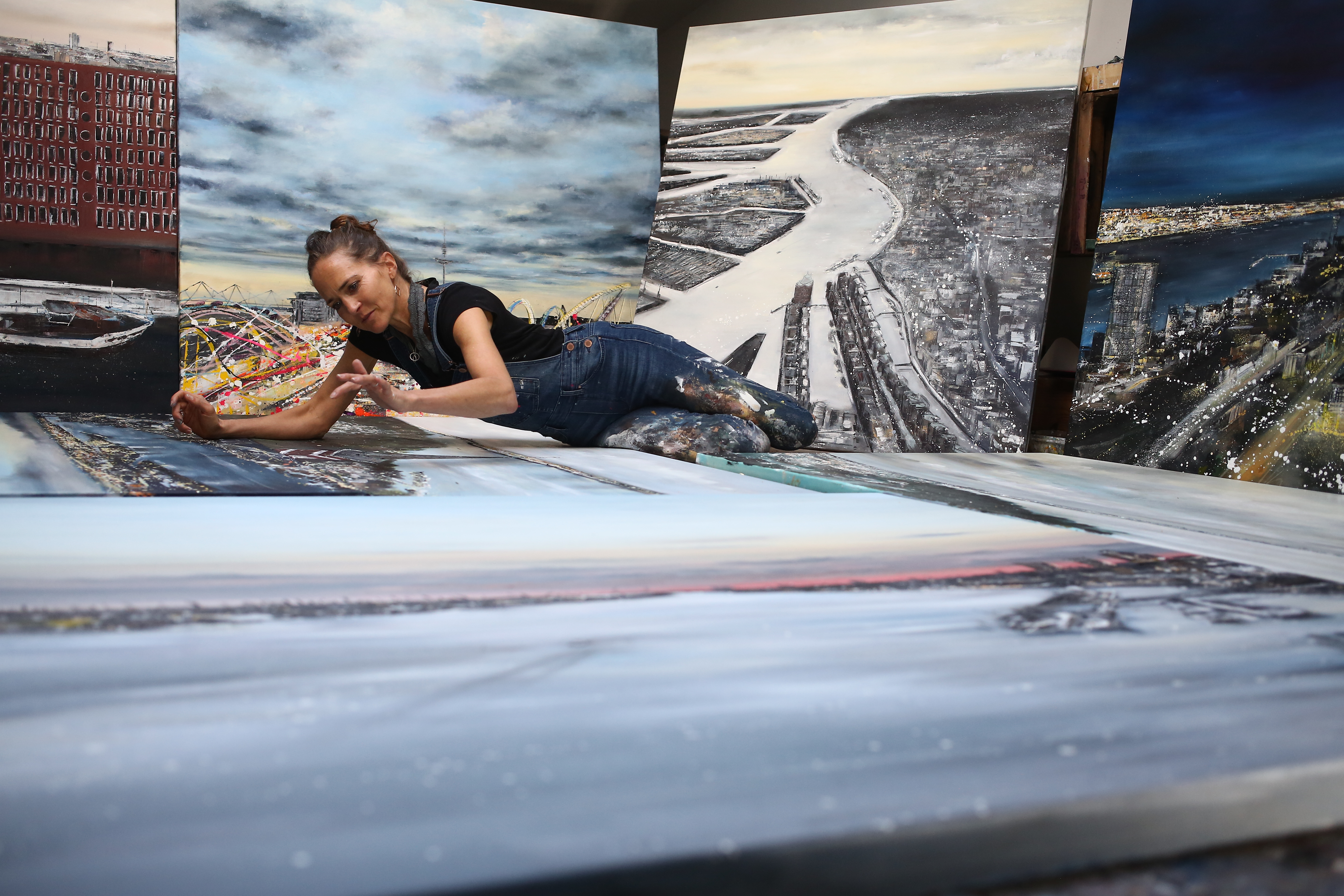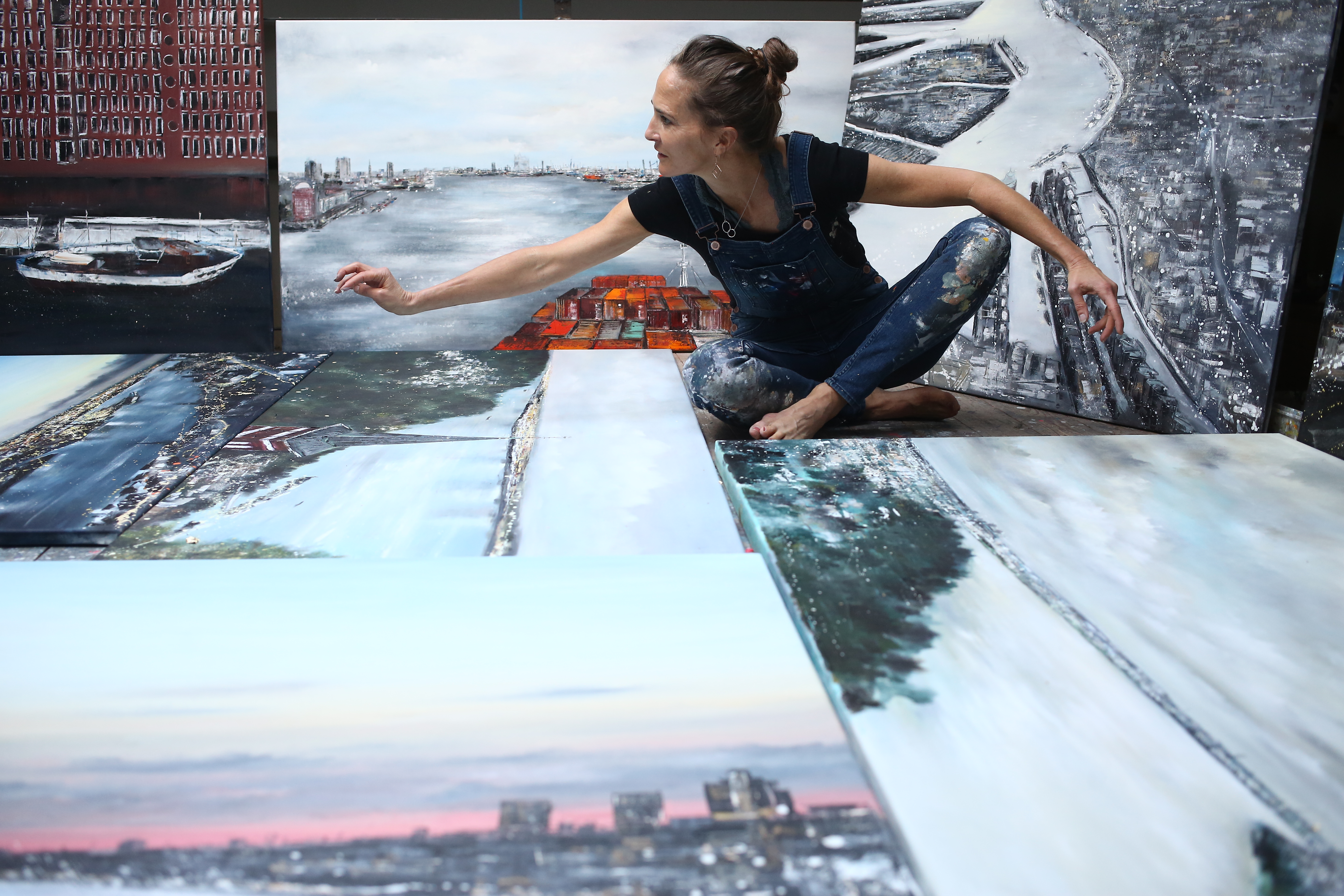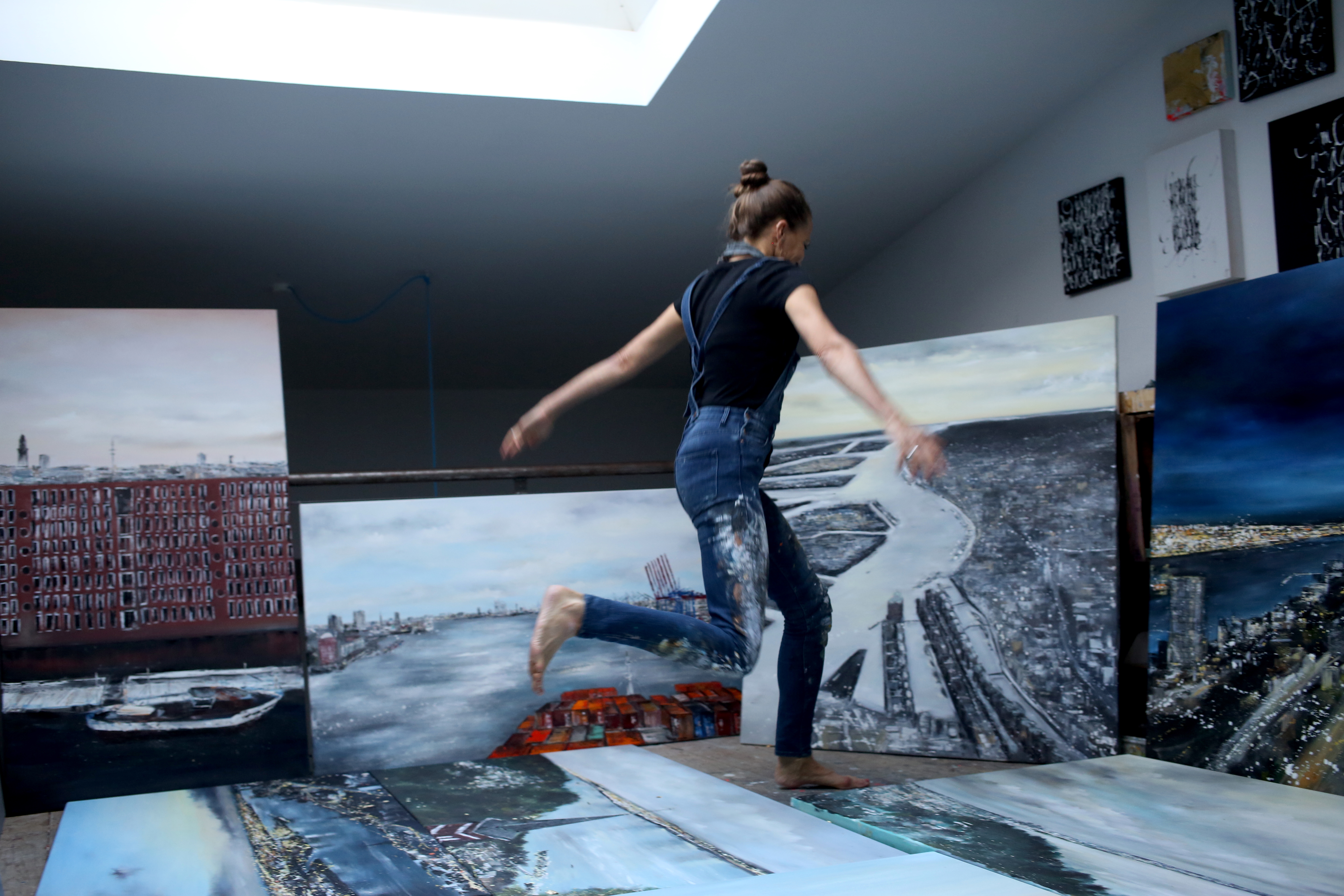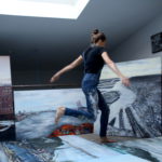 Mitten in der Vernissagevorbereitung für 6.11. im Grand Elysée. 17 Bilder liegen zum Trocknen im Atelier verteilt und die letzten Vollendungen sind abenteuerlich zu meistern
