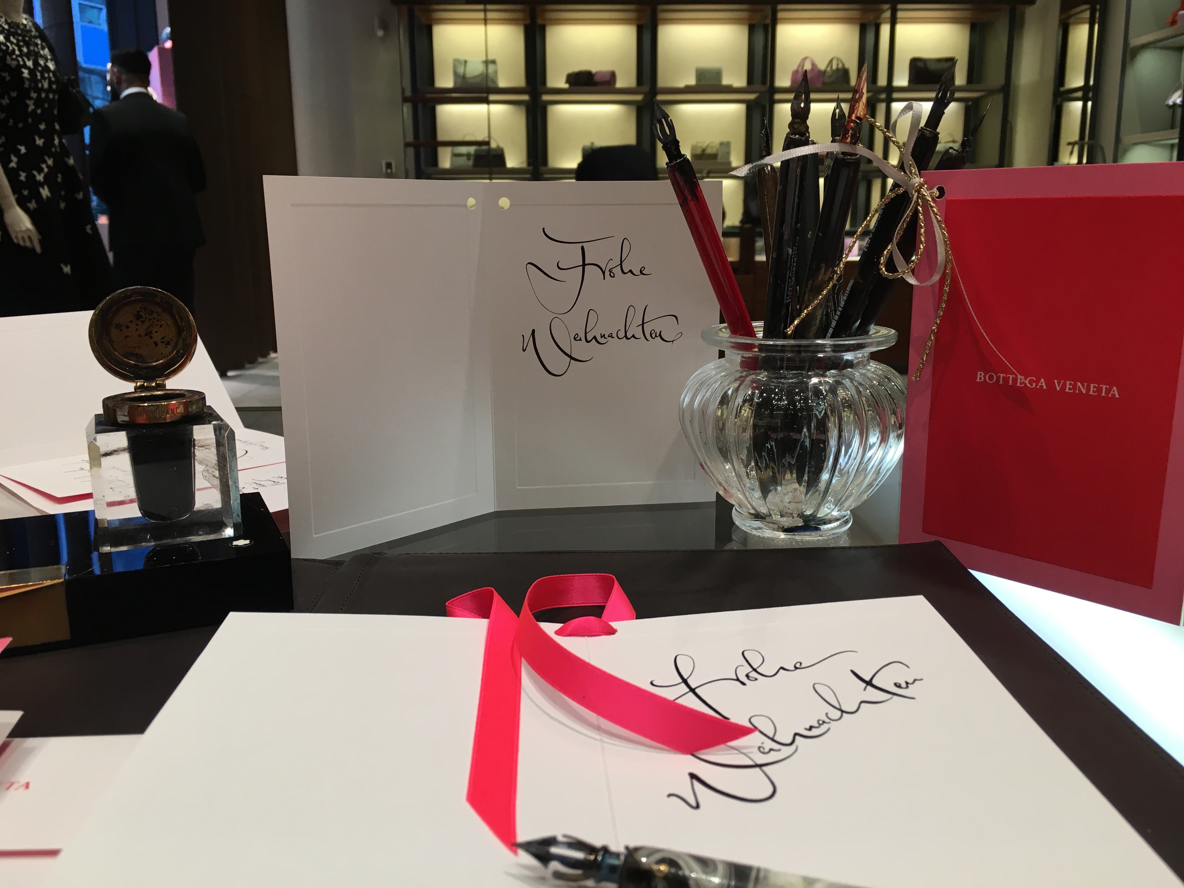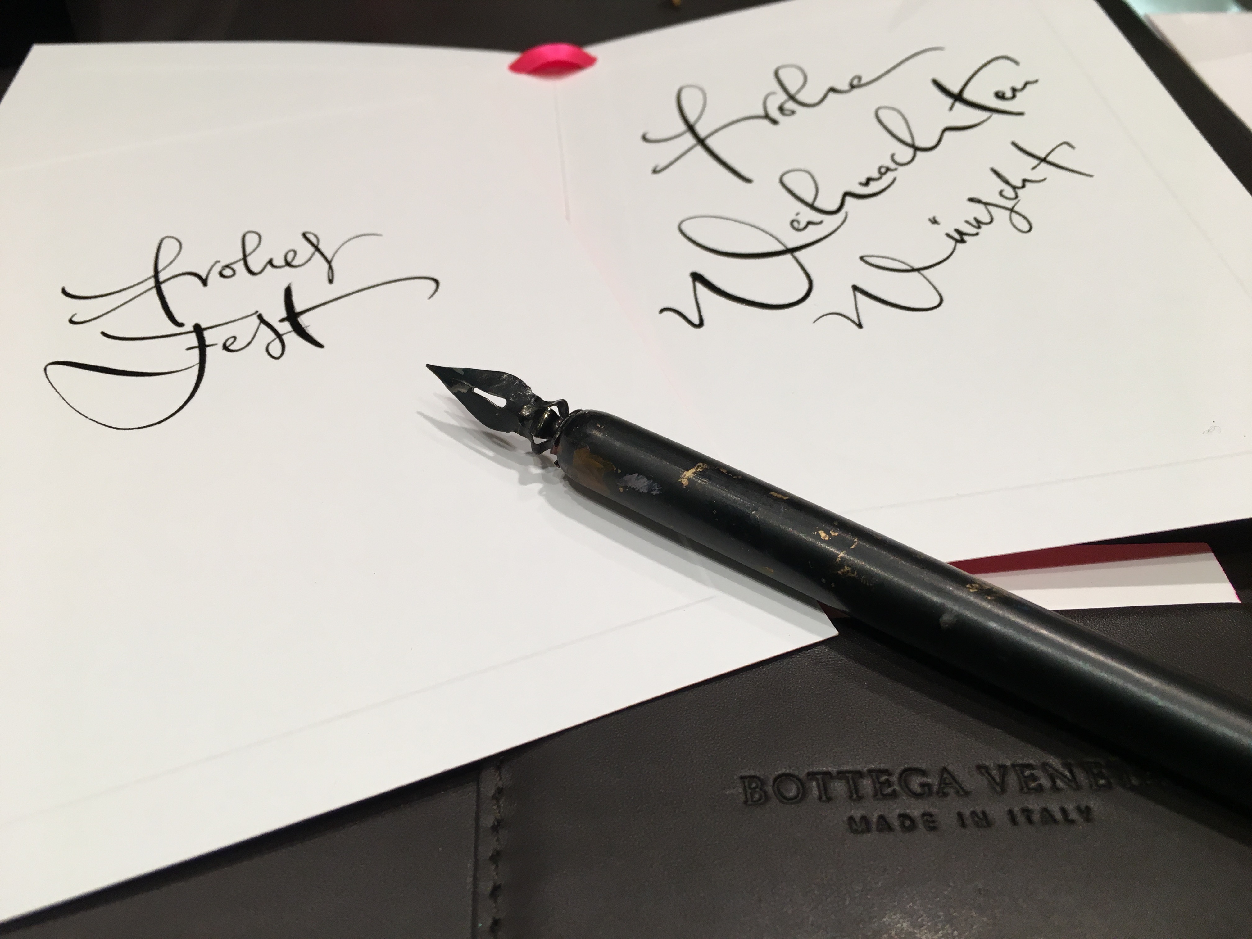 An den Adventsamstagen kalligraphiere ich bei Bottega Veneta Am Neuen Wall für die Kunden individuelle Weihnachtskarten. Die nächste Gelegenheit ist Samstag, 16.12. von 12.30 – 14.30 h