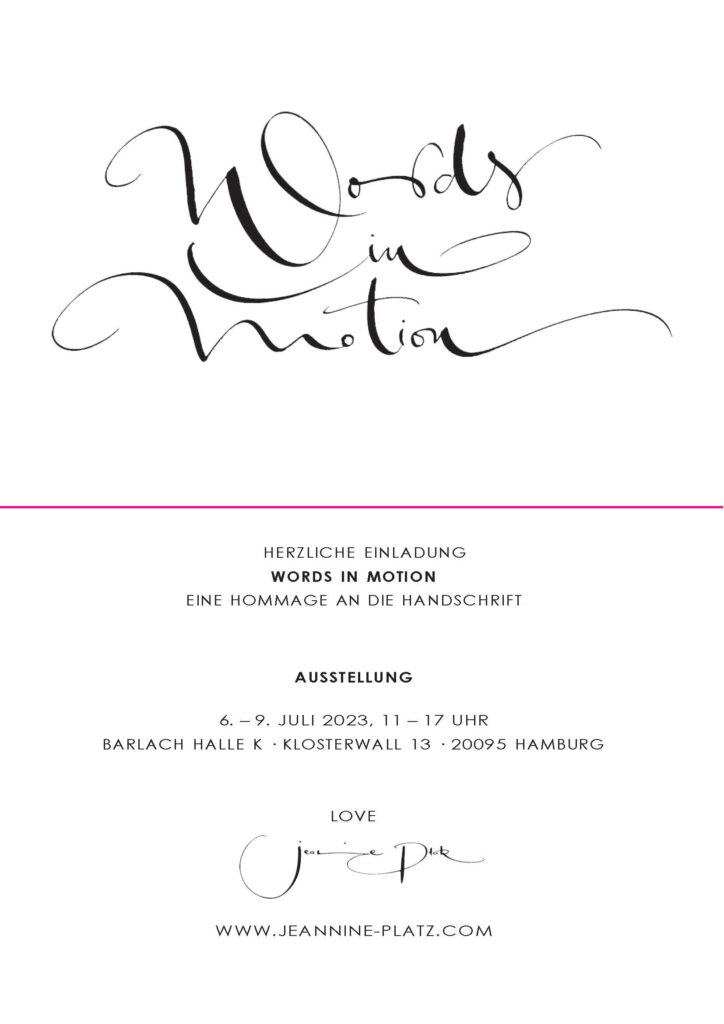 WORDS IN MOTION EINE HOMMAGE AN DIE HANDSCHRIFT Jeannine Platz inszeniert ihre Liebe zur skripturalen Kunst: Großformatig auf handgeschöpften Papieren, auf Leinwand, Kunstleder, Seide, Bronzeskulpturen, auf Autos, auf einem Konzertflügel, auf Menschen, … VERNISSAGE für geladene Gäste MITTWOCH, 5. JULI 2023 · 19 h PERFORMANCES KURZFILMPREMIERE „Die Seele auf Papier“ AUSSTELLUNG DONNERSTAG, 6. – SONNTAG, 9. JULI 2023 · 11 – 17 h BARLACH HALLE K · KLOSTERWALL 13 · 20095 HAMBURG |