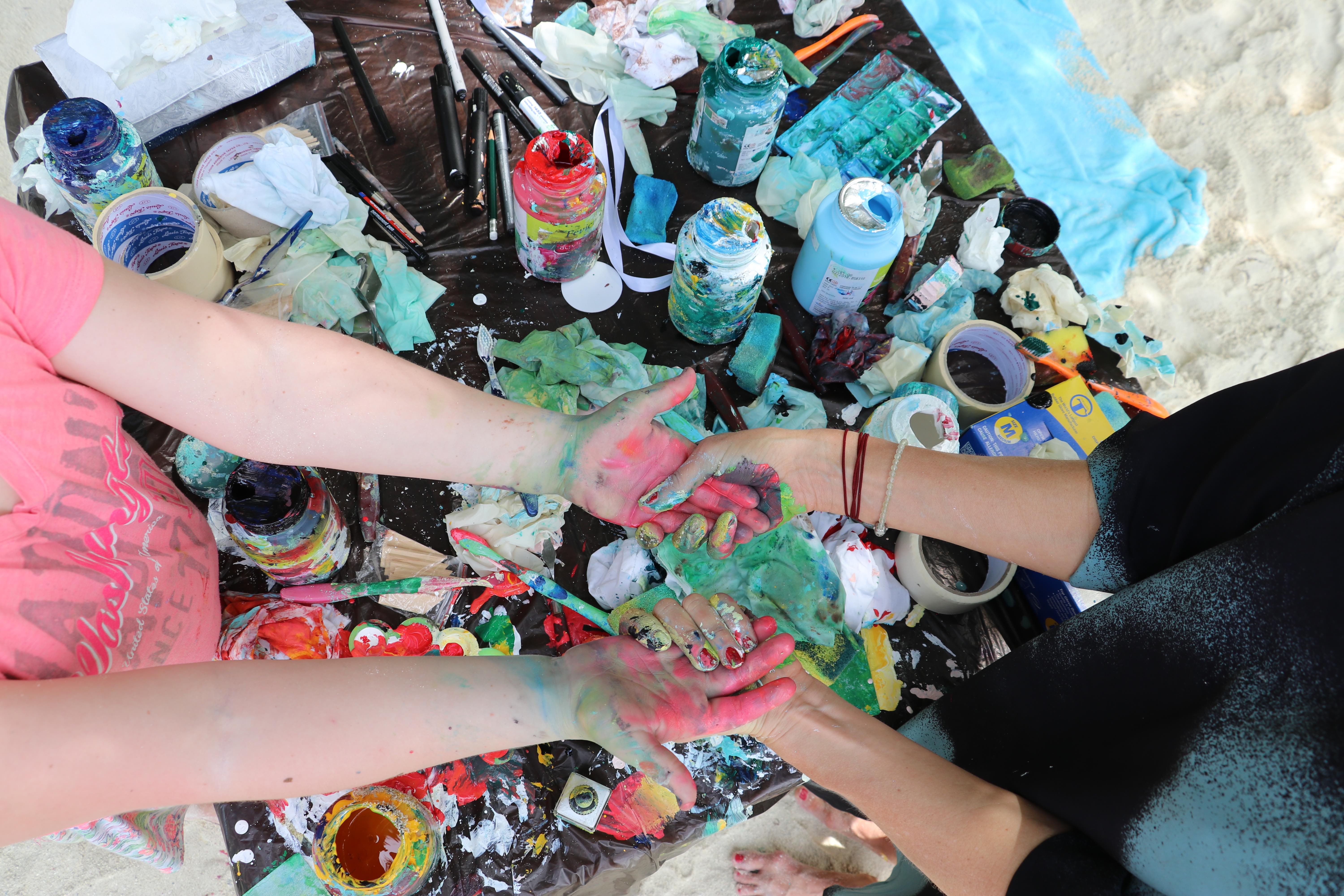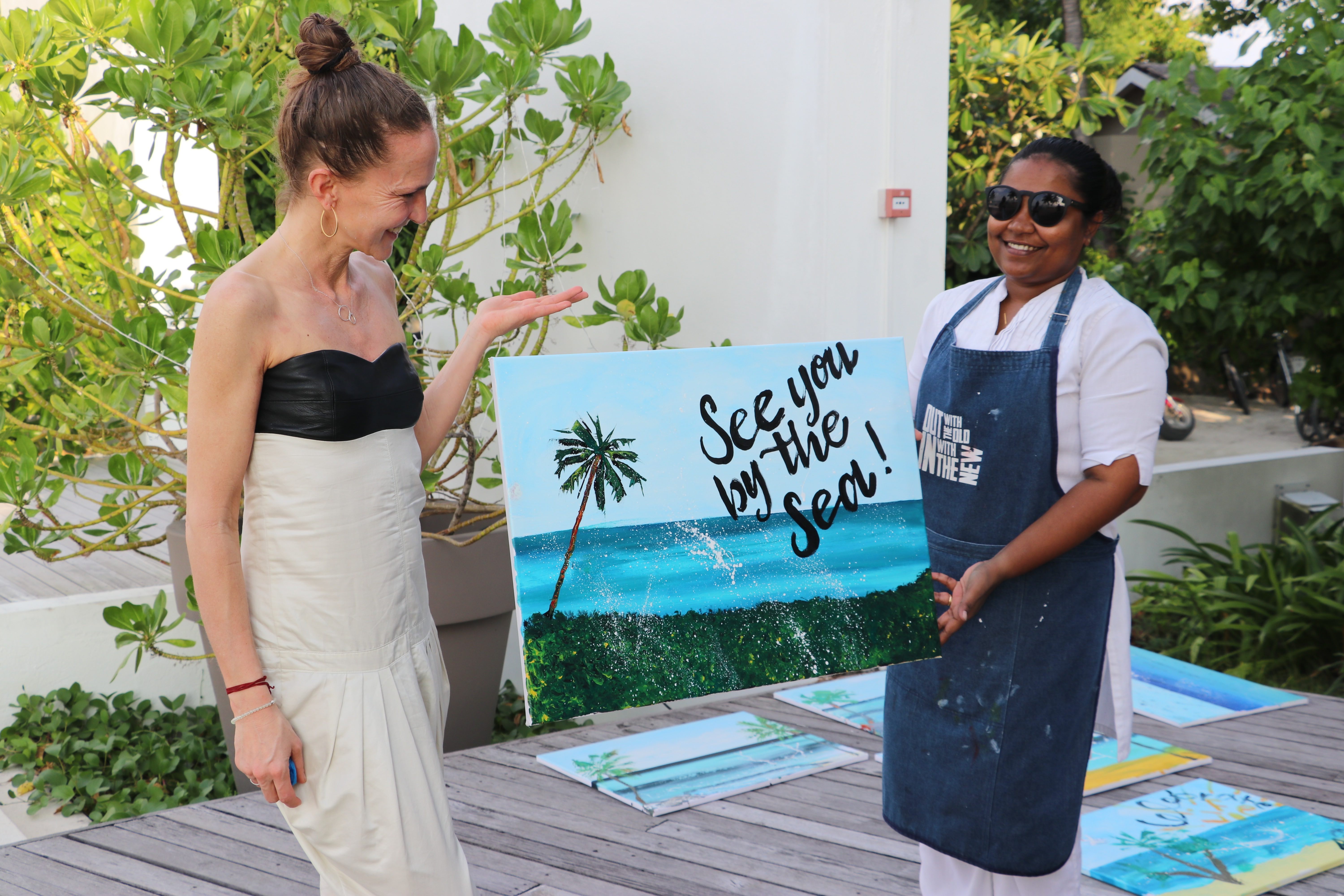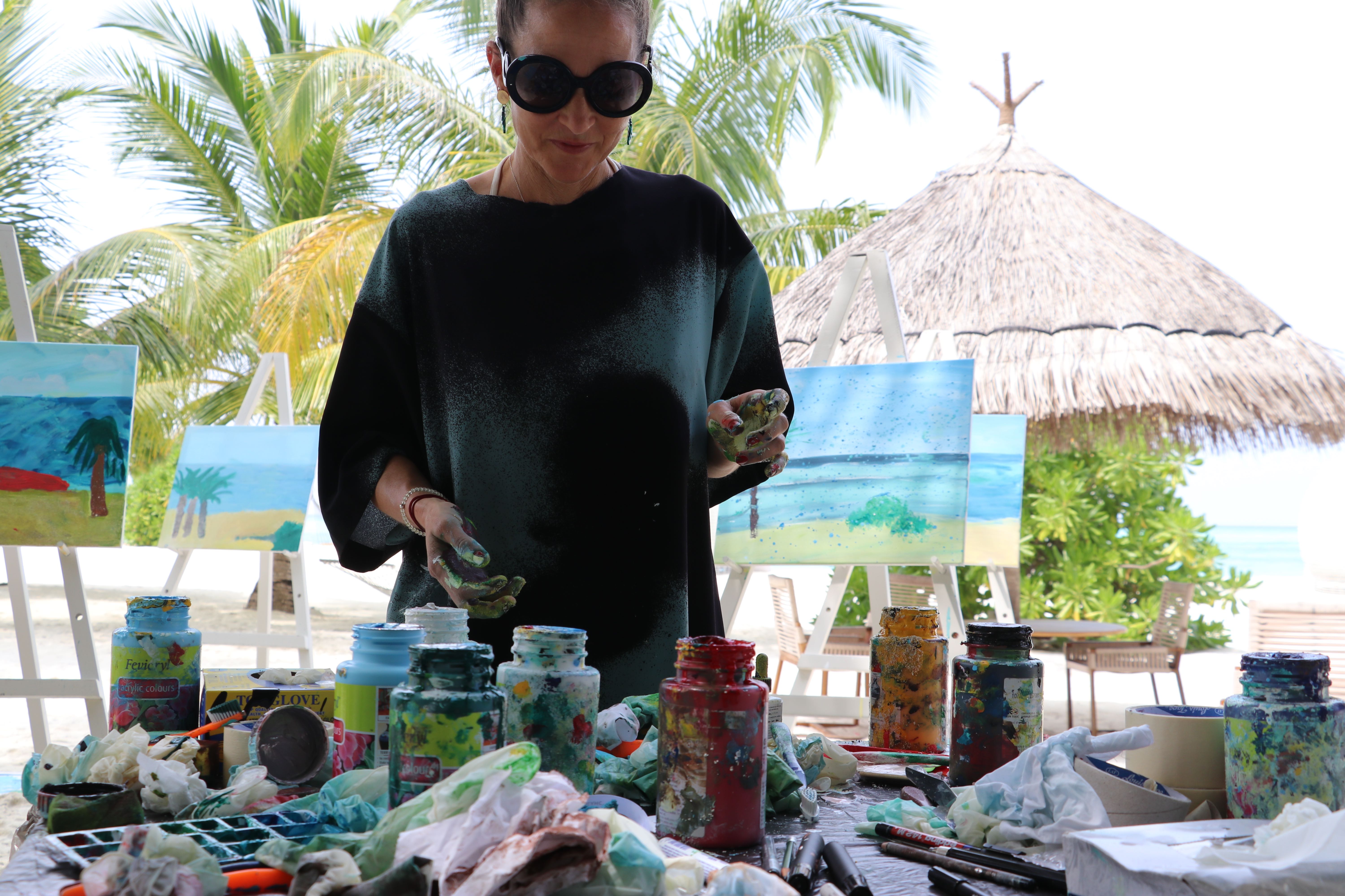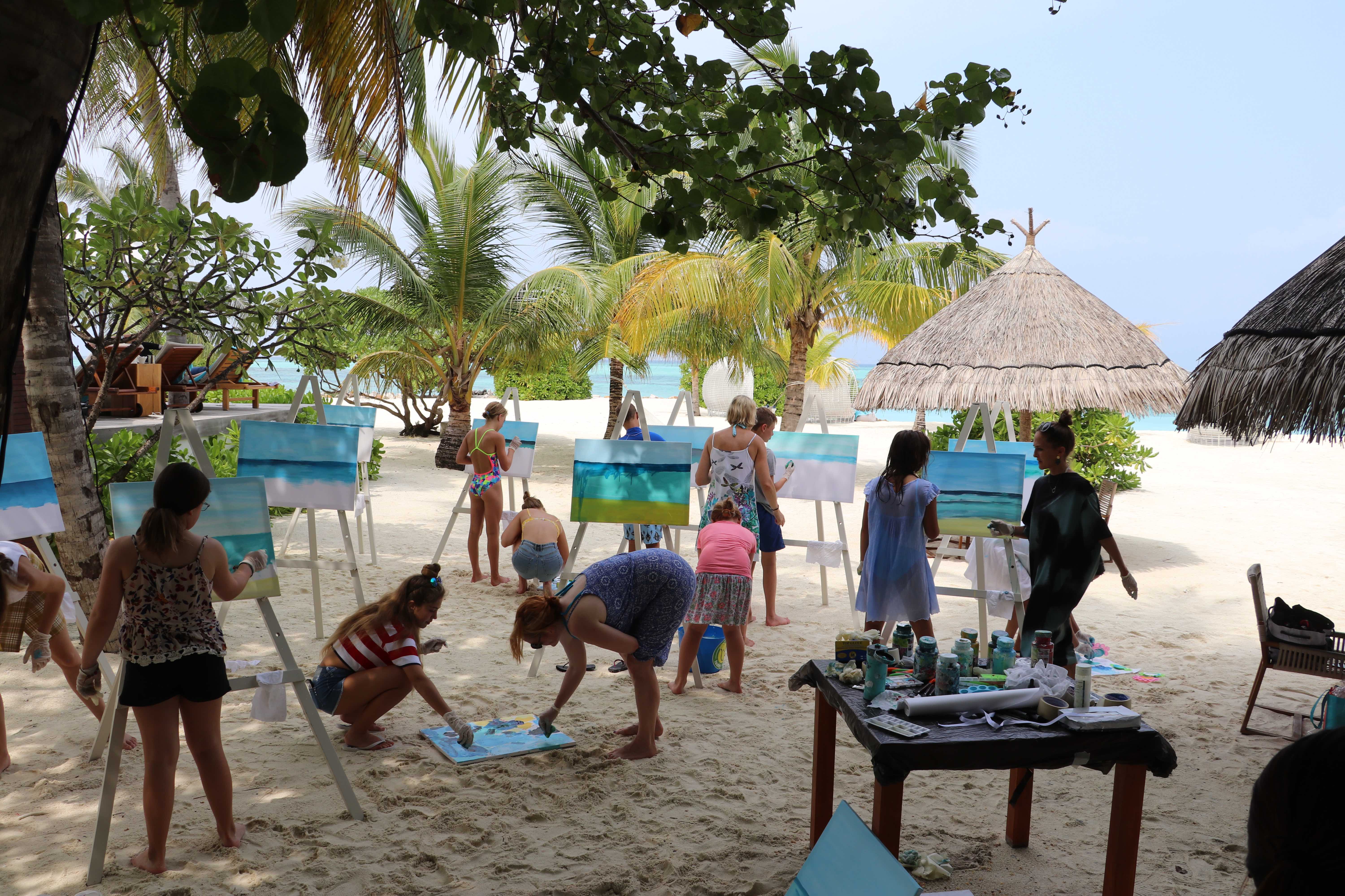 Meine Kunstkurse mitten im indischen Ozean, barfuß im Sand. Alle Künstler lernen meine Technik, mit den Händen zu malen und nehmen ihr eigenes Stück Malediven mit nach Hause