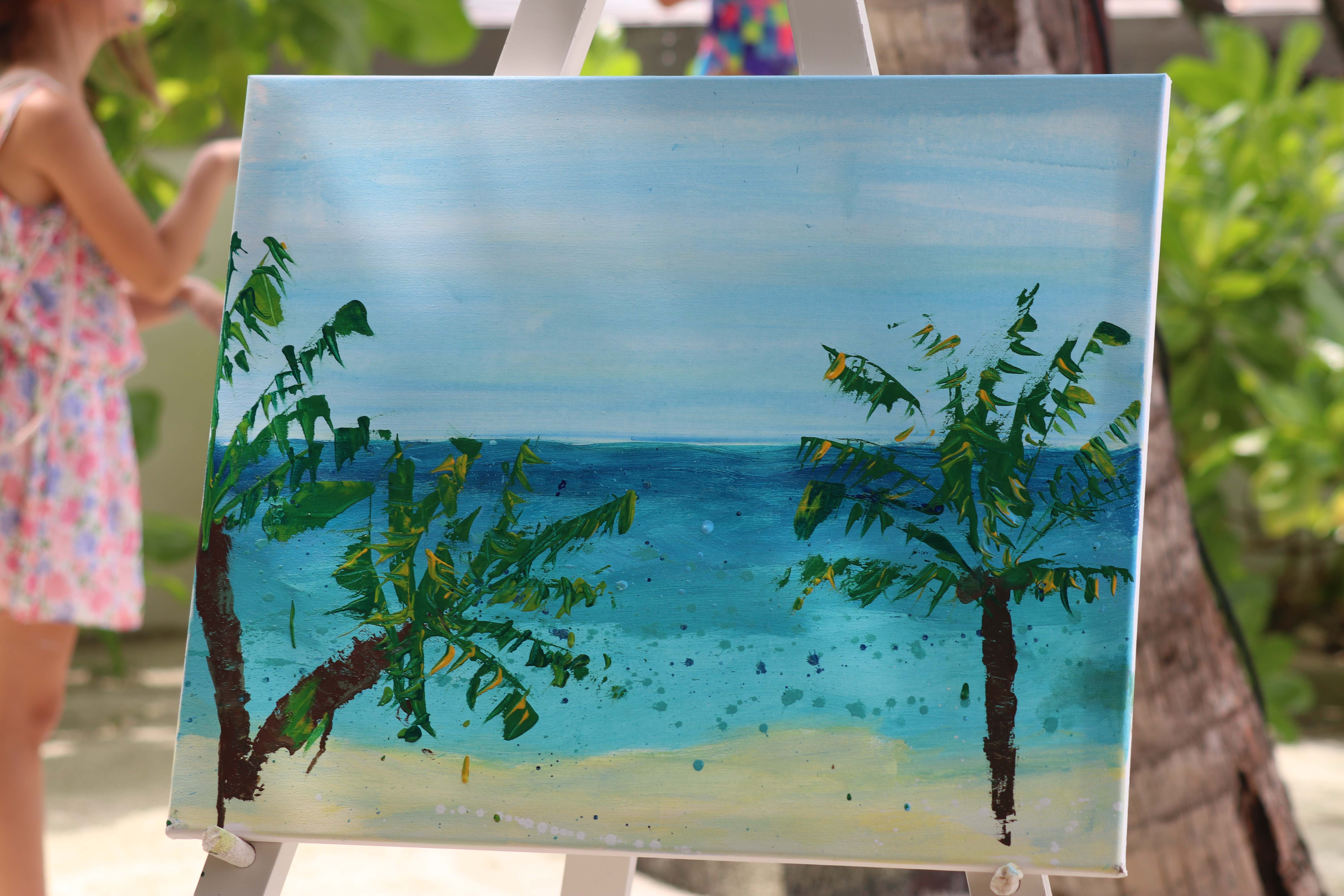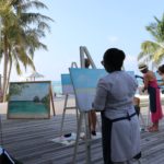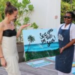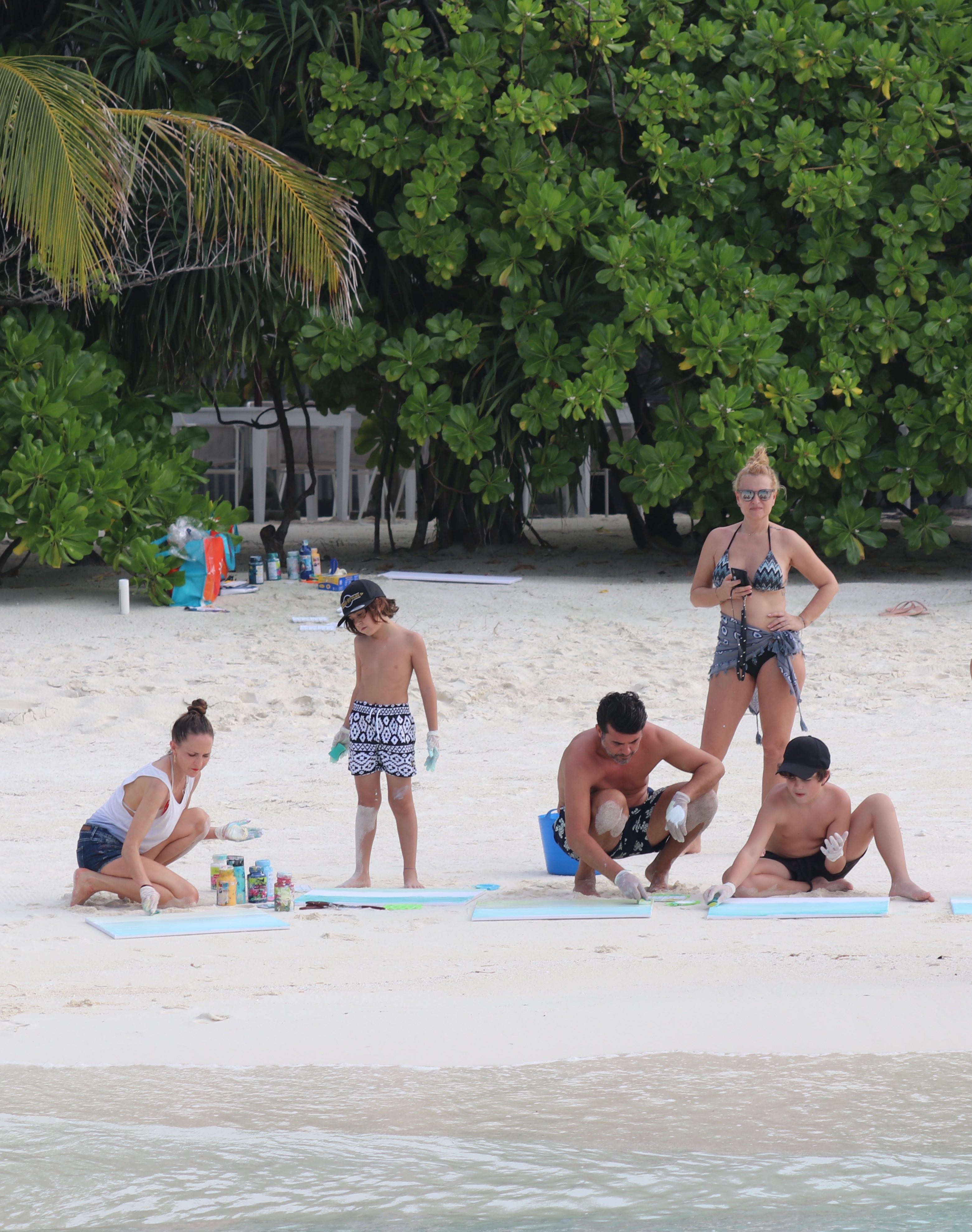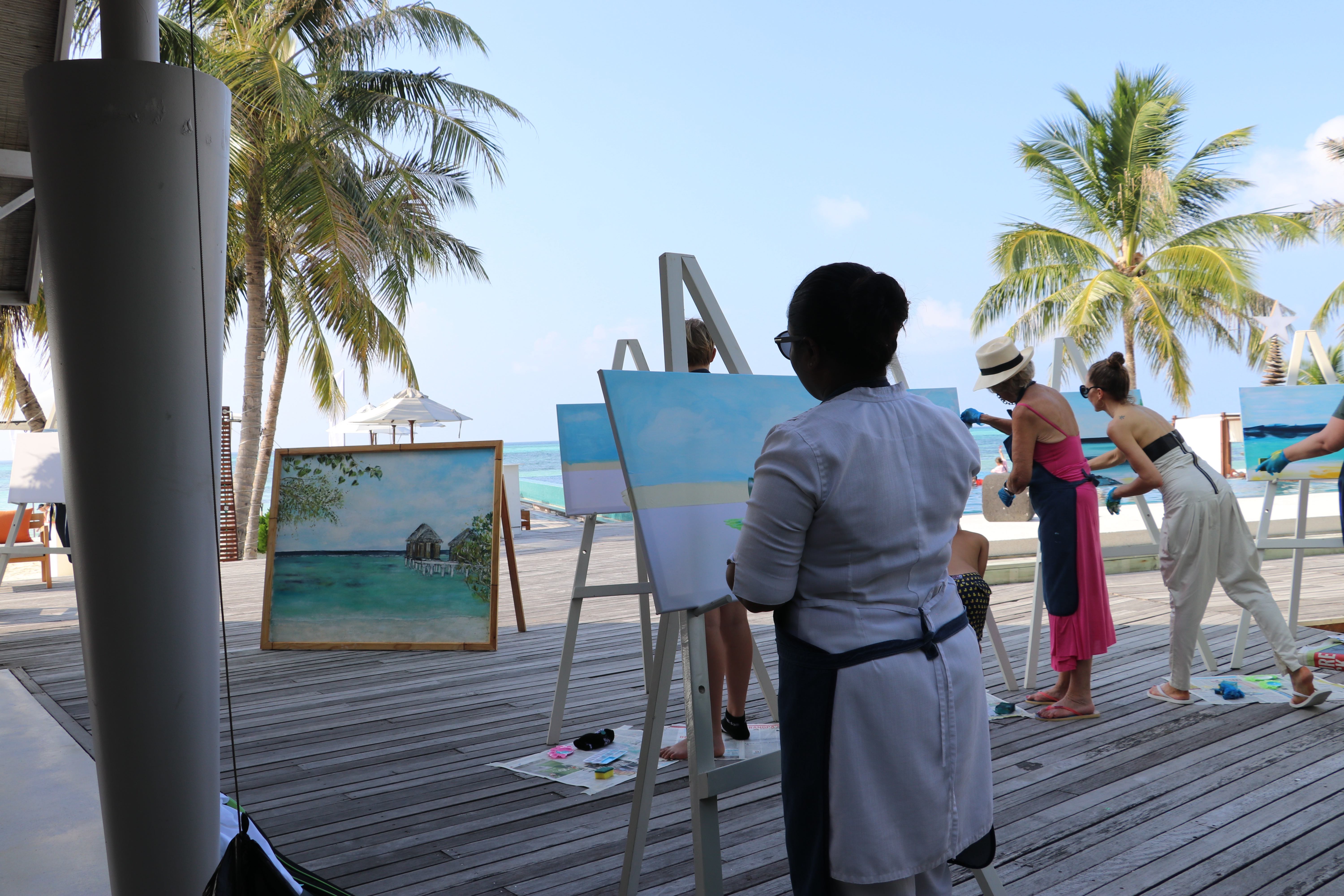 Meine Kunstkurse mitten im indischen Ozean, barfuß im Sand. Alle Künstler lernen meine Technik, mit den Händen zu malen und nehmen ihr eigenes Stück Malediven mit nach Hause